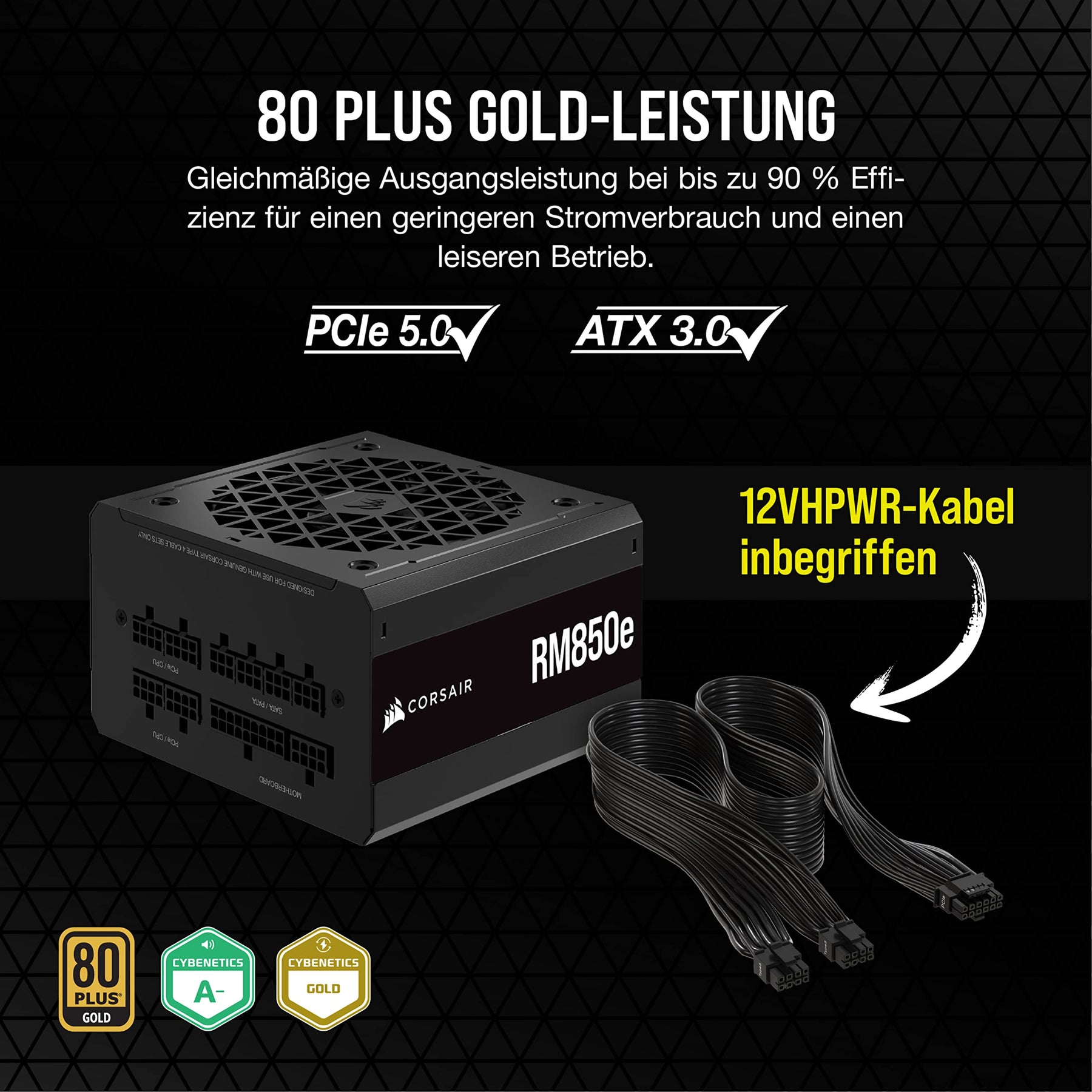 Einzelheiten: Corsair RM850e (2023) Vollmodulares, Geräuscharmes ATX-Netzteil - ATX 3.0- Und PCIe 5.0-kompatibel - 105°C-Kondensatoren - 80 Plus Gold-Effizienz - Modern Standby-Unterstützung - Schwarz