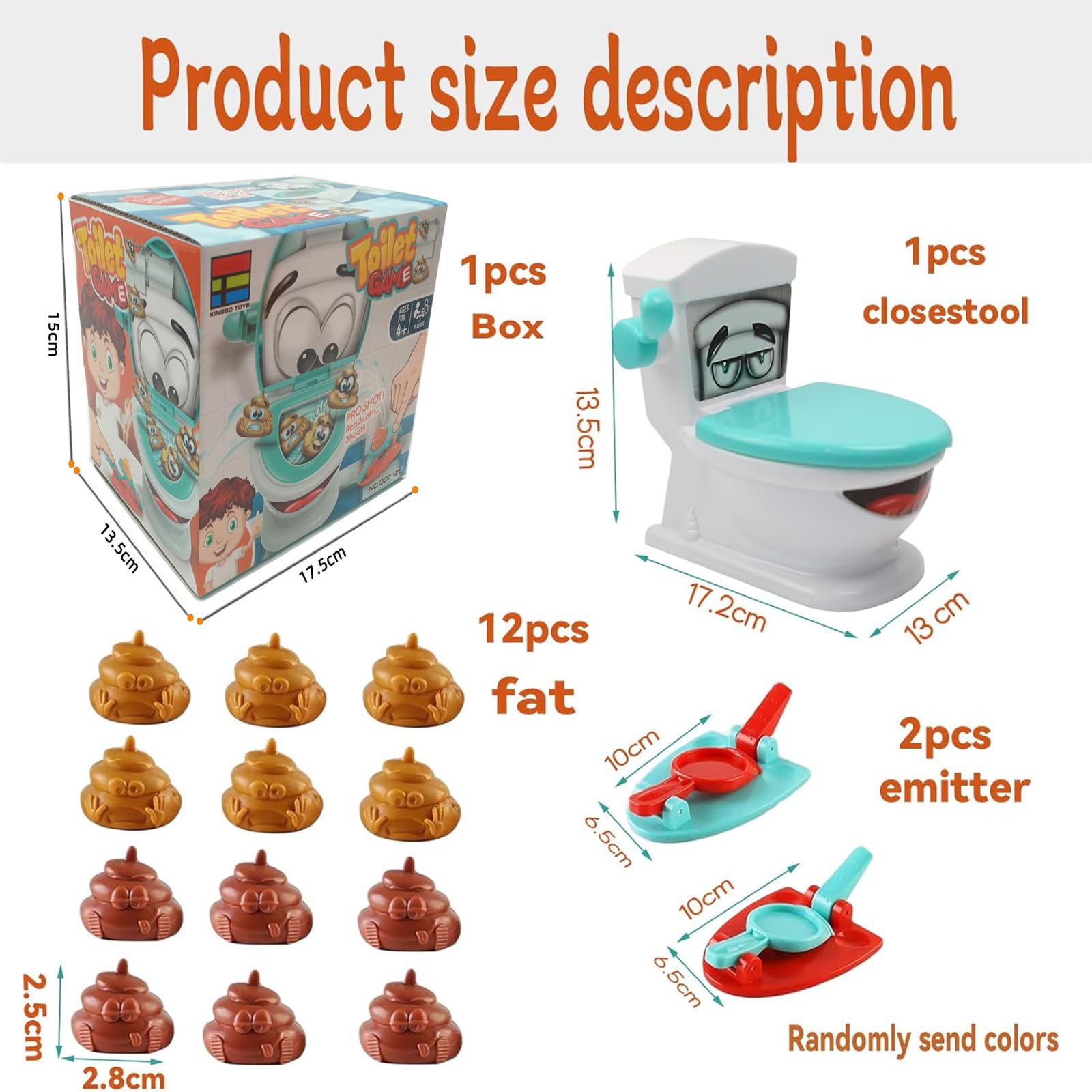 - Spielanleitung: Öffnen Sie den Deckel der Spielzeug-WC, platzieren Sie die Startgeräte daneben und legen Sie die Kunststoff-Kacke auf den Launcher, sobald er fertig ist, können Sie den Kot in die Toilette starten. Boom! Perfektes Shooting