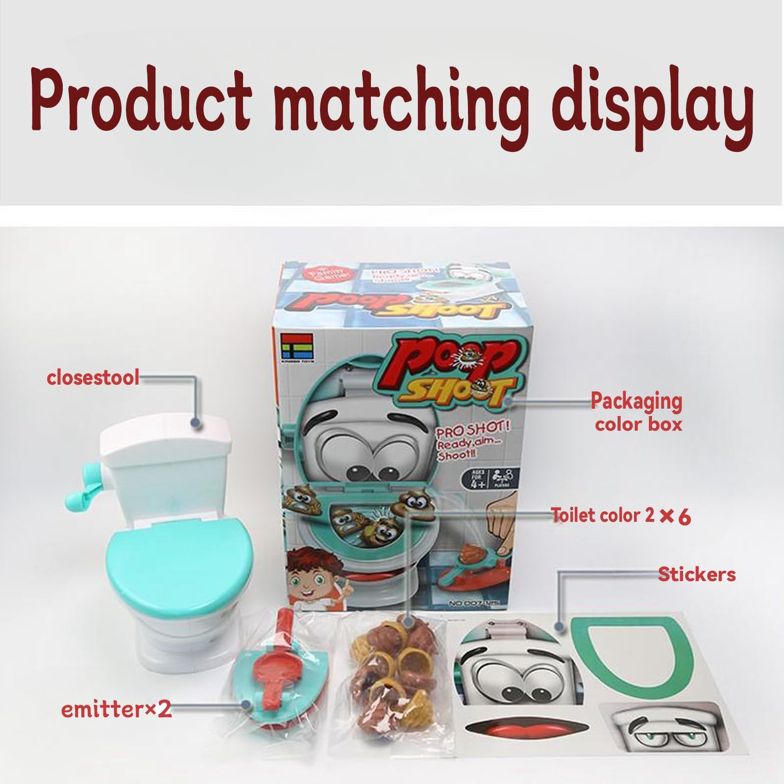 Einzelheiten: Shoot The Poop Inhalt: 1 x Toilette, 2 x WC-Werfer, 12 x weiche Kunststoff-, 1 x Aufkleber. Es wird kein Rohr benötigt, und die hohle Basis ist praktisch für die Entladung des Stuhlgangs. Beenden Sie das Spiel, halten Sie die Toilette zusammen, und es kann immer noch in die Box gesteckt werden.