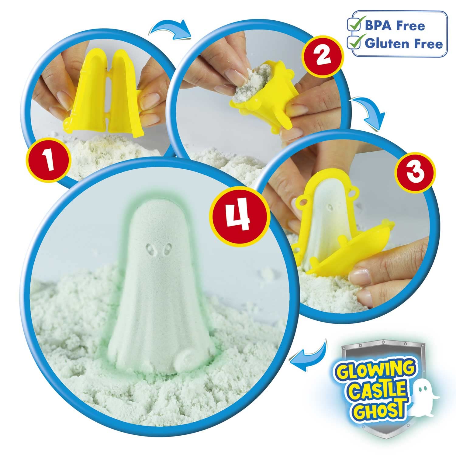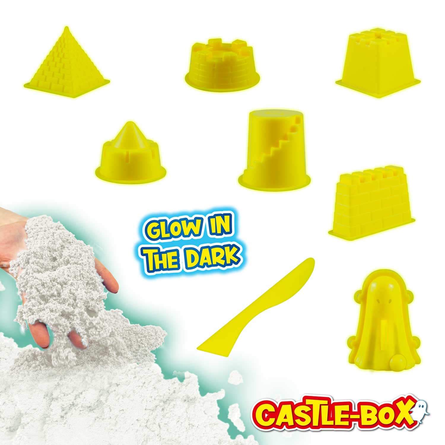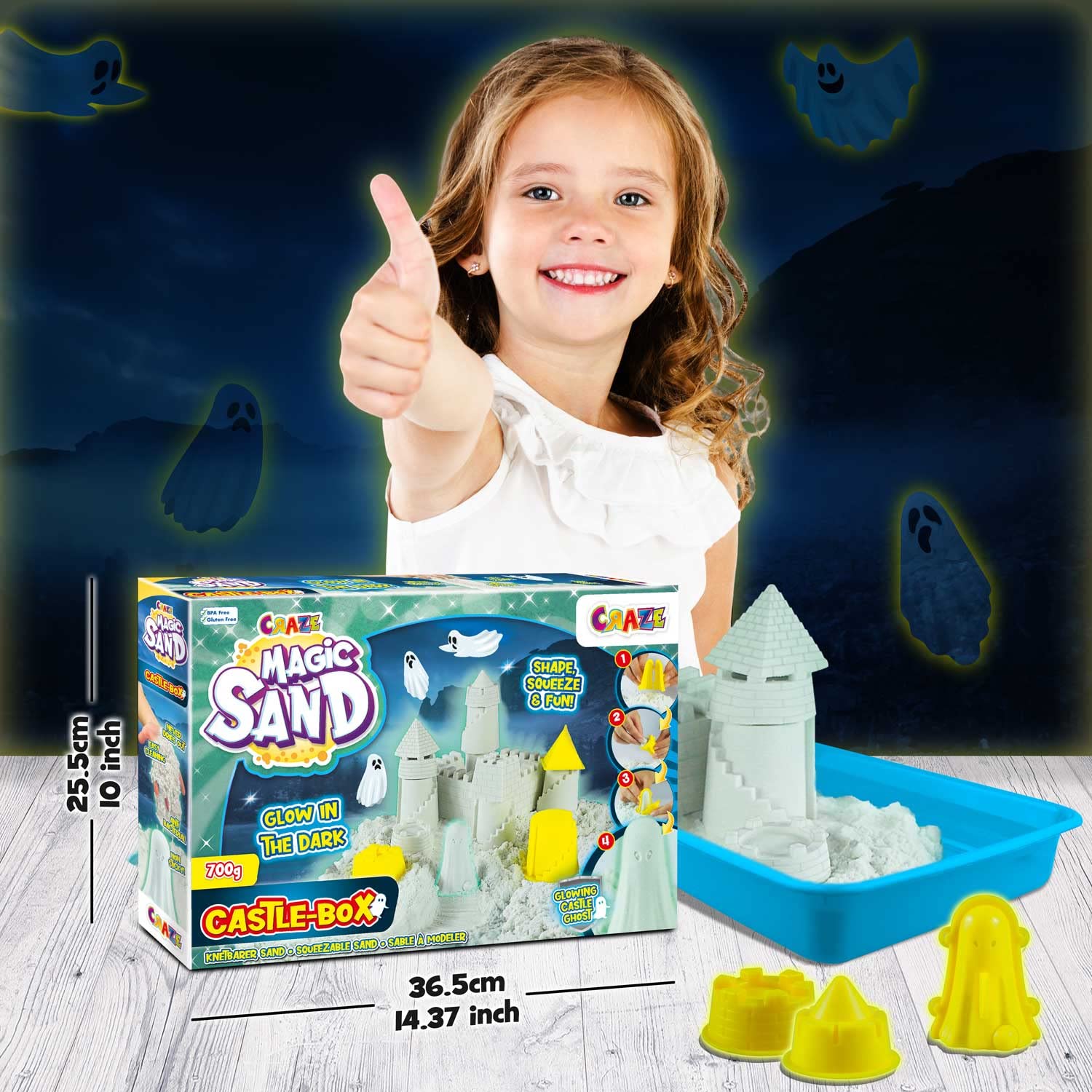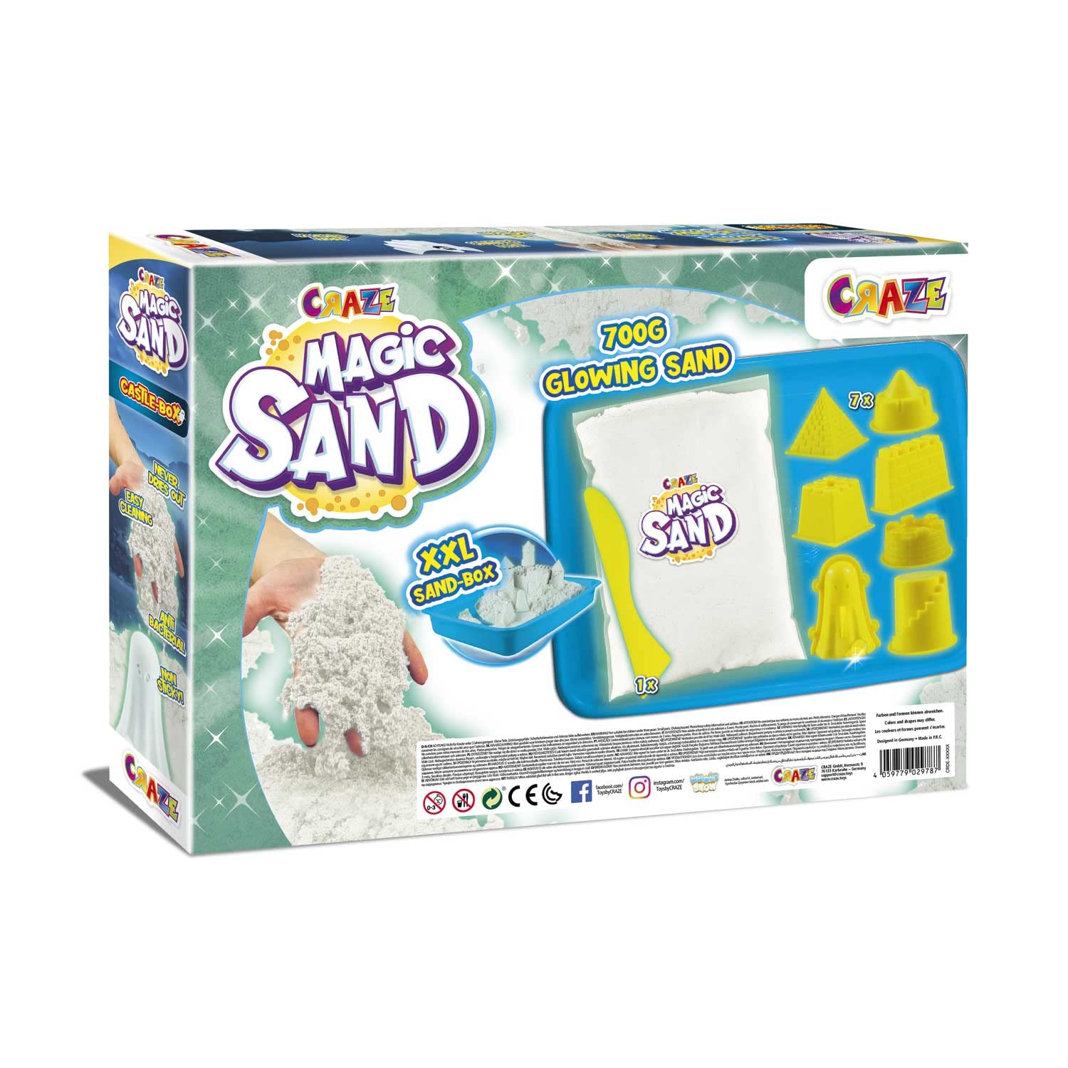 Die CRAZE MAGIC SAND CASTLE-BOX beinhaltet 700g original CRAZE MAGIC SAND, der im Dunkeln leuchtet, 7 Sandförmchen inklusive 3D-Schlossgespenst, eine XXL-Sandwanne und Modellierzubehör zum Formen und Bauen. Der original CRAZE MAGIC SAND ist , klebt nicht an den Händen, ist formstabil, riecht nicht unangenehm und lässt sich nach dem Spielen problemlos und rückstandslos aufräumen. Die eigens entwickelte Sandformel ermöglicht zudem, dass die Sandfiguren über Wochen stehengelassen werden können ohne auszutrocknen und der Sand nach kurzem Kneten wieder genauso soft ist wie am ersten Tag.