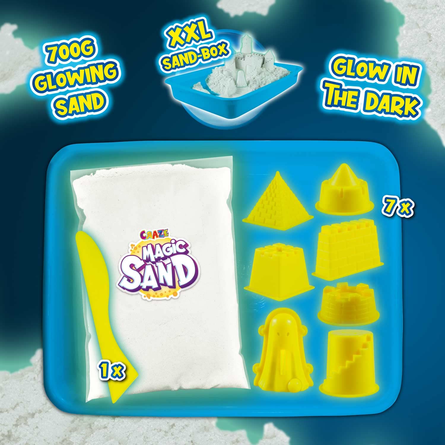 - Der CRAZE MAGIC SAND CASTLE BOX enthält neben 700g leuchtend MAGIC SAND kinetischer Sand, 7 exklusive Sandförmchen, eine XXL Wanne und ein Modellier-Spachtel. Und wenn Sie Ihre Sandburg gebaut haben werden, schalten Sie das Licht aus: Der kinetischer Sand leuchtet im Dunkeln für eine echte verwunschene Schloss-Atmosphäre!