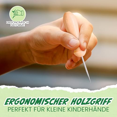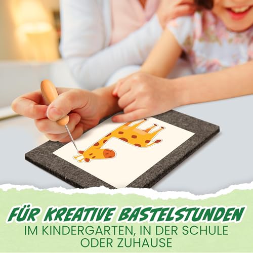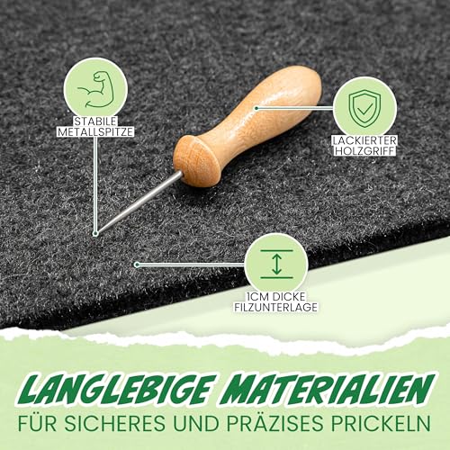 - 🌱 HOCHWERTIGE MATERIALIEN – Unser Prickelset für Kinder enthält eine langlebige Prickelnadel mit nachhaltigem Holzgriff mit speichelechtem Lack frei von schaften Kanten oder Splittern und eine extra dicke Prickelfilz-Unterlage.