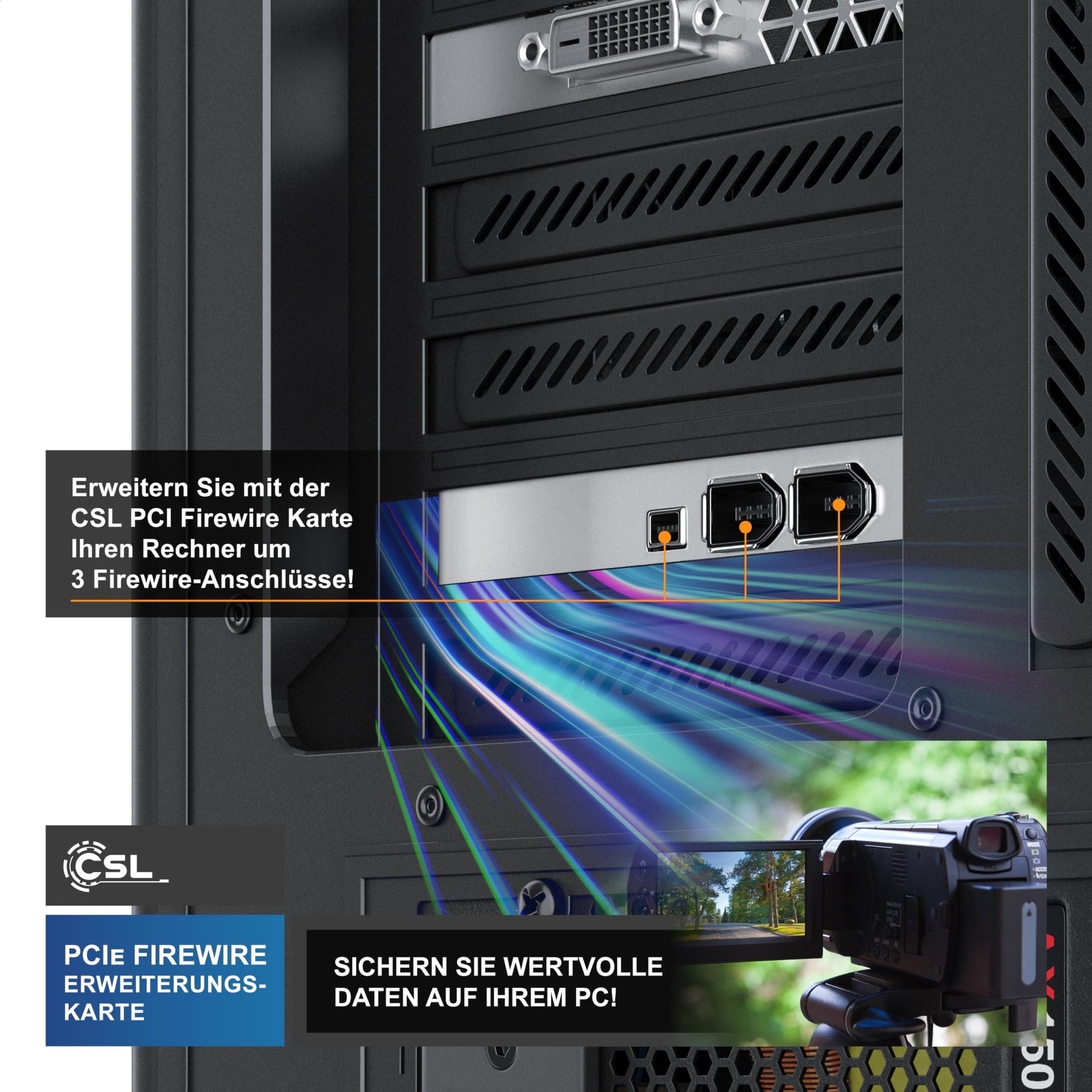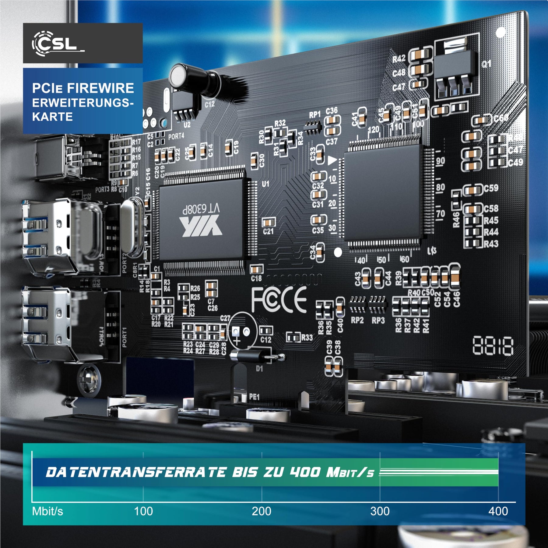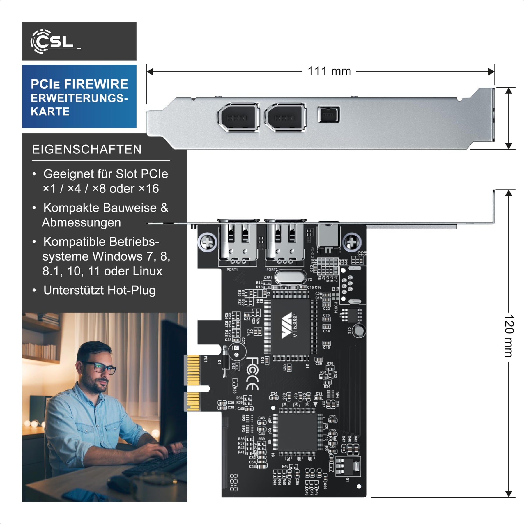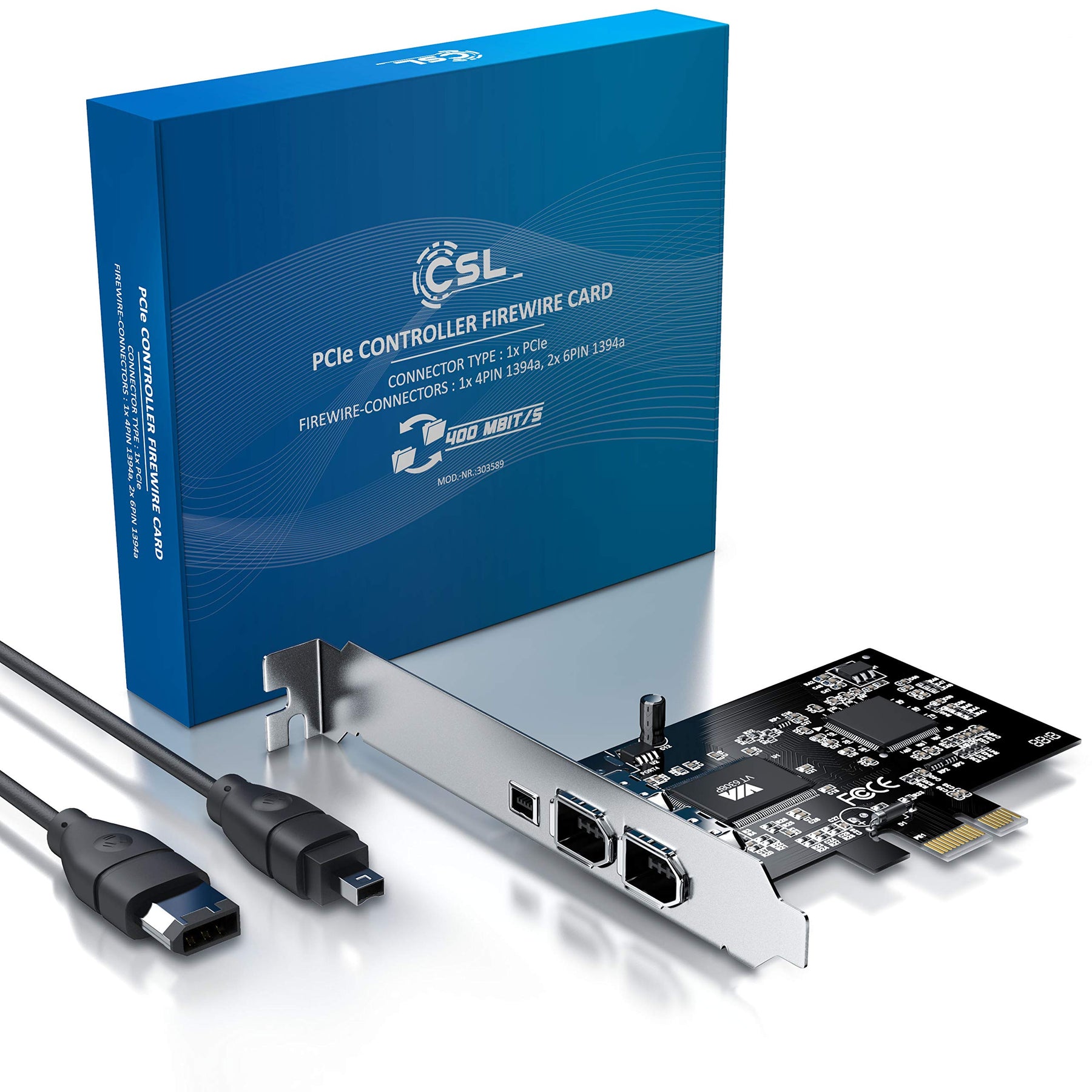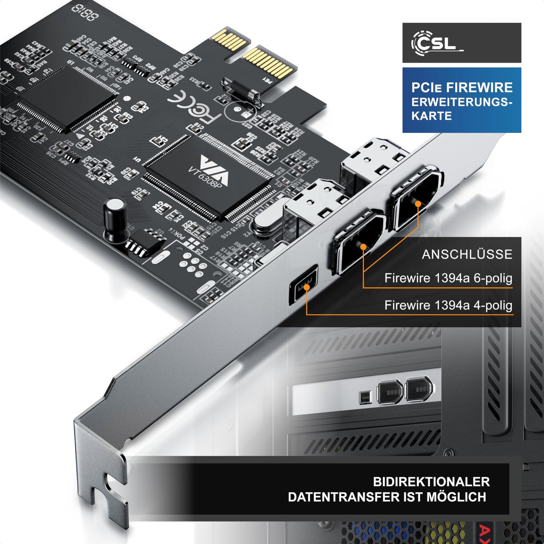 - Erweitern Sie mit der CSL PCI Firewire Karte Ihren Rechner um 3 Firewire-Anschlüsse: dreimal 1394a, davon zwei 6-polige und einen 4-poligen Anschluss. Firewire wird vor allem in der Video- und Tontechnik eingesetzt, häufig auch zum Anschluss zusätzlicher Massenspeicher wie externer Festplatten oder DVD-Brenner. Interessant auch zum Anschluss älterer Scanner sowie Videokameras, um Ihre Filmschätze auf der Festplatte zu sichern. | 303589