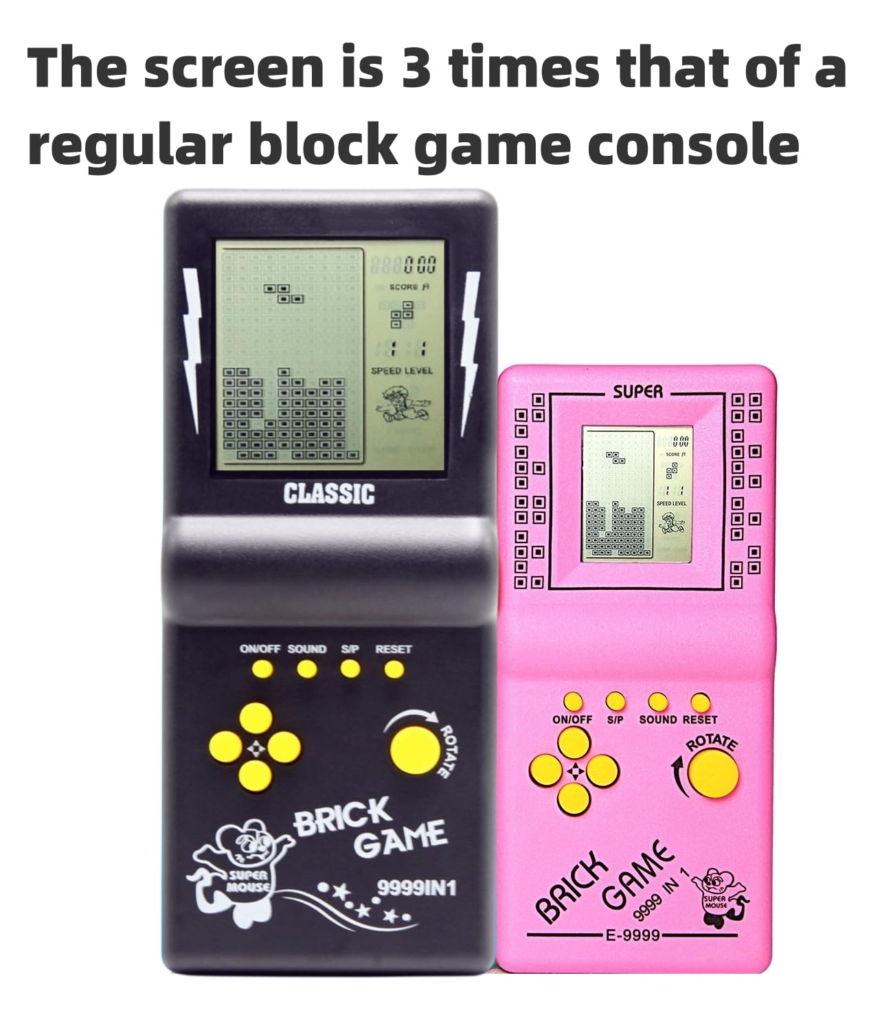• Super großer Bildschirm, die Bildschirmfläche ist dreimal so groß wie die der normalen Brick-Spielekonsole, und der visuelle Effekt ist besser. Das ergonomische Design, der Griff fühlen sich besser an und die Bedienung ist komfortabel. Dies ist eines der besten Geschenke für jemanden und auch Ihr bester Begleiter für Reisen oder langweilige Zeit.