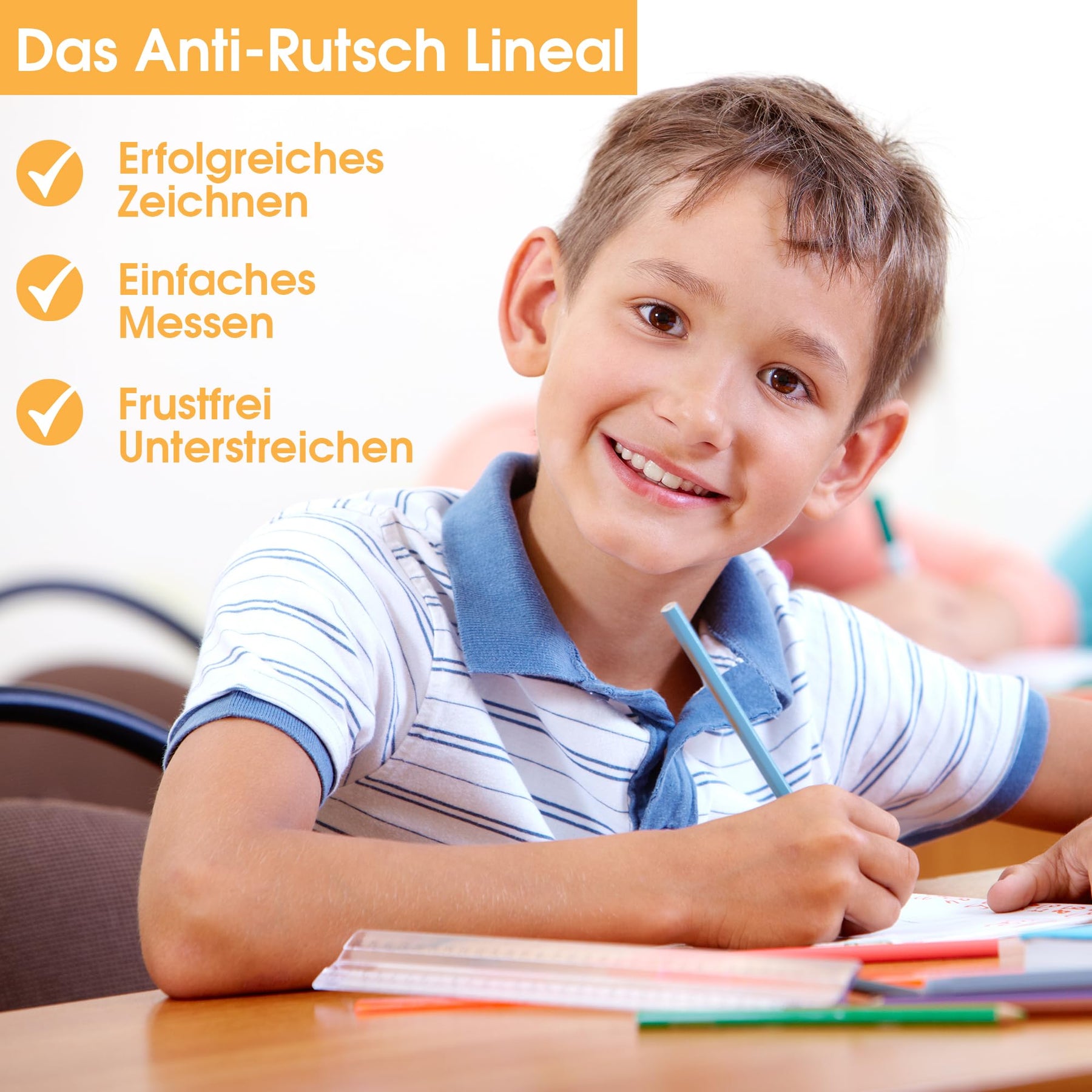 Einzelheiten: Das Original Anti-Rutsch-Lineal-Set – für besseren Halt und bessere Noten. SCHUTZFOLIE ABZIEHEN und los geht es: Rutschende Lineale gehören der Vergangenheit an! Dieses hochwertige 3-teilige Lineal-Set mit spezieller Anti-Rutsch-Beschichtung sorgt für sicheren Halt auf jedem Papier. Egal ob du gerade unterstreichst, einen Graph zeichnest oder eine Geometrieaufgabe löst – nichts verrutscht, alles sitzt perfekt. Das Set enthält: 1x 15 cm Lineal – handlich für Mäppchen & kleine Arbeiten 1x 20 cm Lineal – der Standard für Schulhefte und Arbeitsblätter 1x Geodreieck – mit klarer Gradskala und robuster Kante Alle Teile bestehen aus langlebigem, bruchsicherem Kunststoff und verfügen über fein skalierte Markierungen für exaktes Arbeiten. Die transparente Optik sorgt dafür, dass du alles im Blick behältst – ideal für präzise Aufgaben im Mathe-, Kunst- oder Technikunterricht. Ob in der 1. Klasse, in der Oberstufe oder im Studium – dieses Set begleitet dich zuverlässig durch die gesamte Schulzeit. Anti-Rutsch. Anti-Stress. Mehr Präzision.