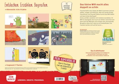 Freundschaft ist das Tollste der Welt! Zusammen sind wir stärker, mutiger und fröhlicher. Aber wie werden Kinder Freundinnen und Freunde? Woher kommt das WIR-Gefühl und was ist das überhaupt? Wie ein WIR entsteht und was wir tun können, wenn sich unser WIR klein und schlapp fühlt, erzählt Daniela Kunkel in ihrer beliebten Kindergeschichte für das Erzähltheater: Das WIR-Gefühl entdecken und stärken Ein Bilderbuch-Klassiker für das Kamishibai-Erzähltheater Daniela Kunkels Illustrationen als stabile Bildkarten Mit ausführlicher Textvorlage - ideal für ein pädagogisches Angebot Für Kinder von 5 bis 9 Jahren zum Entdecken und Nacherzählen Was ist ein Kamishibai? Bildgestütztes Erzählen für Kinder