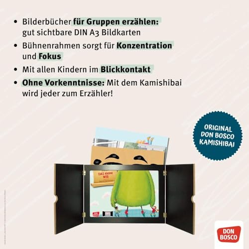 Ein Kamishibai besteht aus einem aufstellbaren Rahmen, in dem die einzelnen Bildkarten während des Erzählens nacheinander herausgezogen werden. Dabei kann das Erzähltempo den Bedürfnissen der Kinder angepasst werden. Es bleibt genug Zeit und Raum für eigene Entdeckungen. Erzieherinnen und Erzieher können mit dem bildgestützten Erzählen die Sprachentwicklung der Kinder in der Kita fördern. Lehrerinnen und Lehrer nutzen diese Methode zur Erwerbung von ersten Lesekompetenzen in der Grundschule.Mit den ausdrucksstarken Kamishibai-Bildkarten zu dem Bilderbuch „Das kleine WIR“ erleben Kinder eine eindrückliche Geschichte über Streit, Egoismus und Zusammenhalt in der Gruppe. So gelingt es, das WIR-Gefühl der Kinder in Kita und Schule zu stärken!