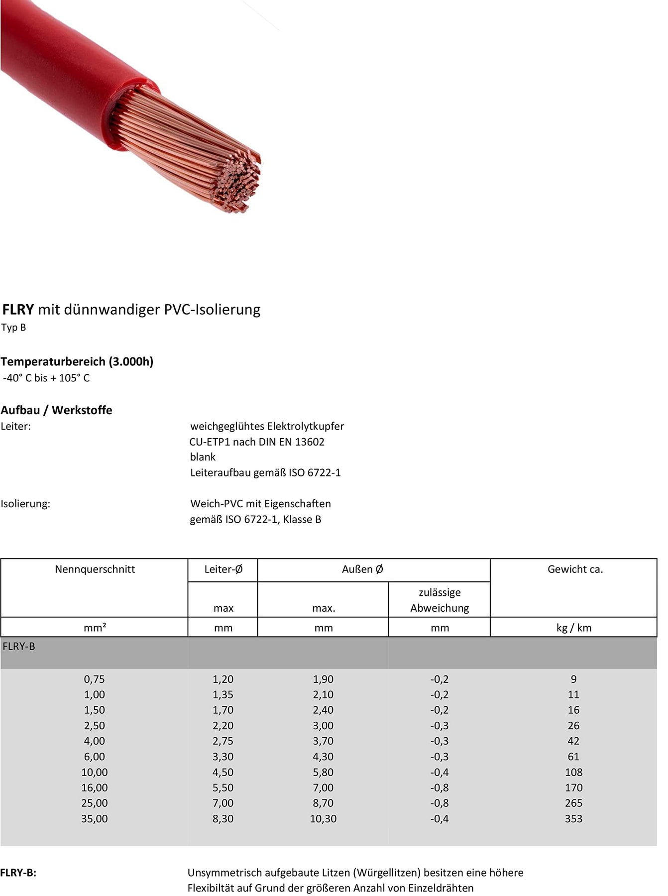 • Isolierung: FLRY = KFZ Kabel - Reduzierte Isolierung wanddicke - Weich-PVC entsprechend ISO 6722, bleifrei, Shore-Härte Sh97, Temperaturbereich -40°C bis 105°C