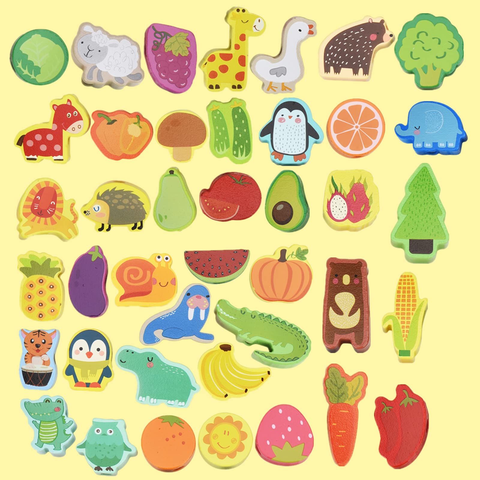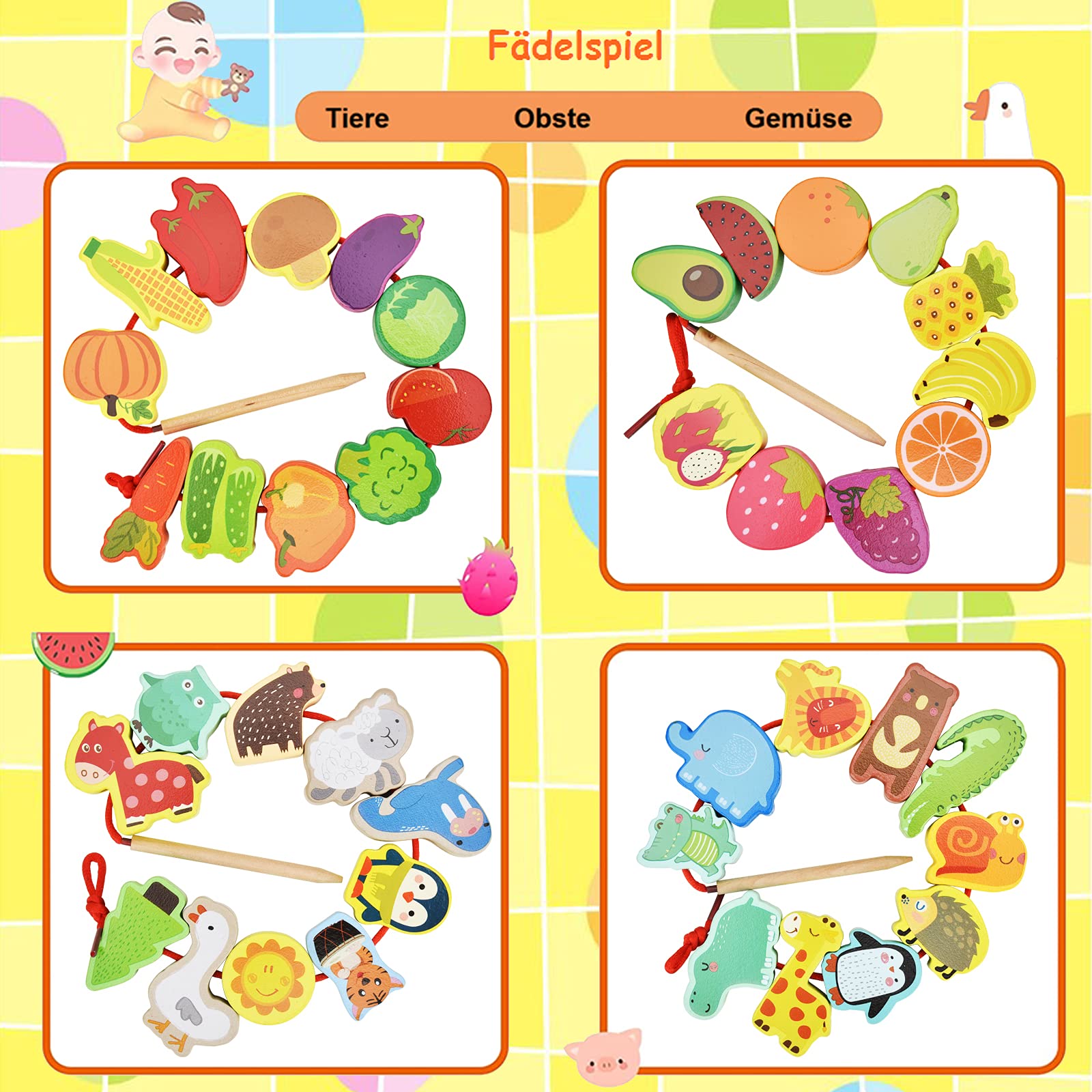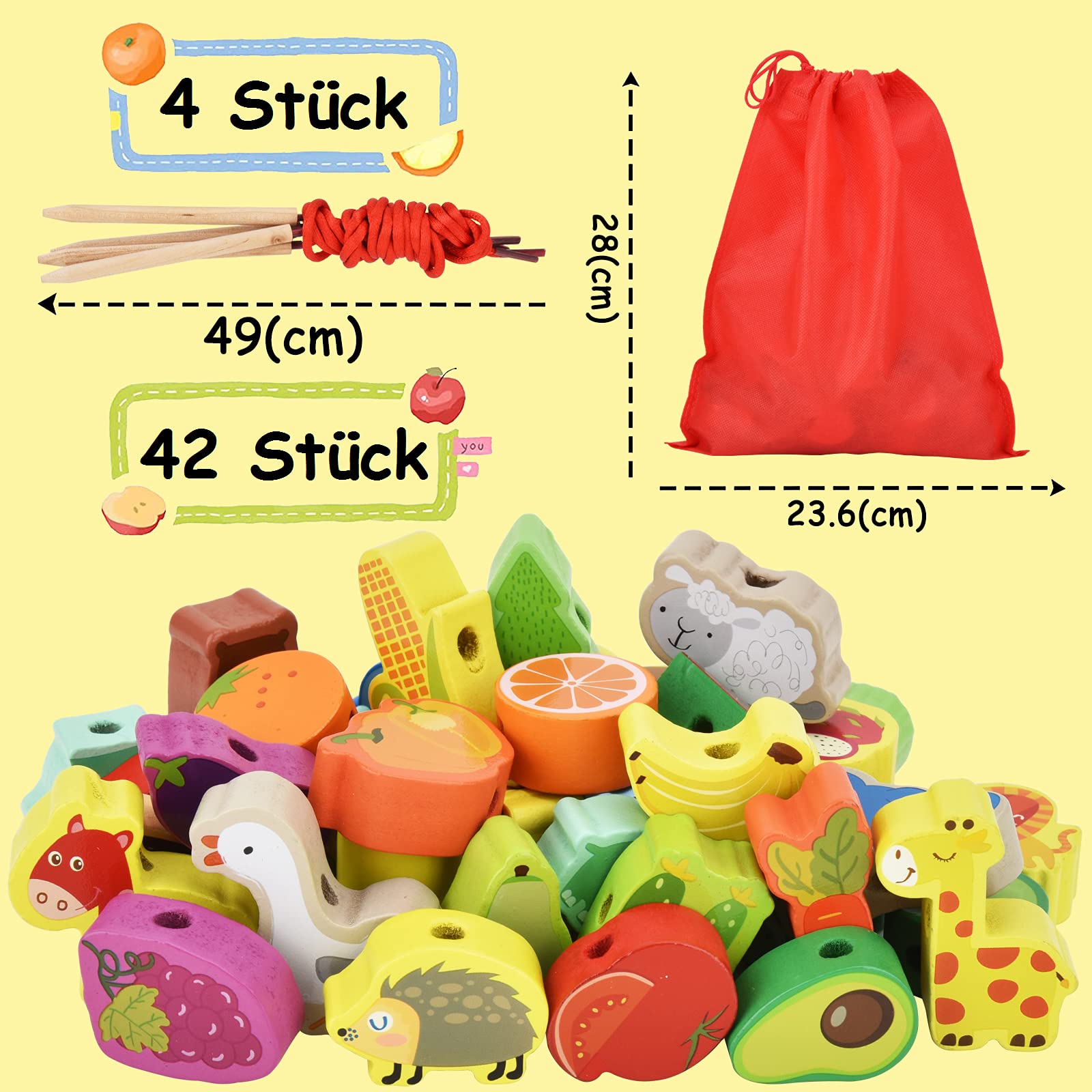- 【IDEALES FRÜHBILDUNGSSPIELZEUG】Unser Montessori Fädelspiel fördert die kognitive Entwicklung und Feinmotorik Ihres Kindes. Mit 42 bunten Holzperlen in Form von Tieren, Obst und Gemüse in lebendigen, nicht wiederholenden Mustern entdecken Kinder spielerisch die Welt – die attraktiven Designs fesseln sofort die Aufmerksamkeit der Kleinen.