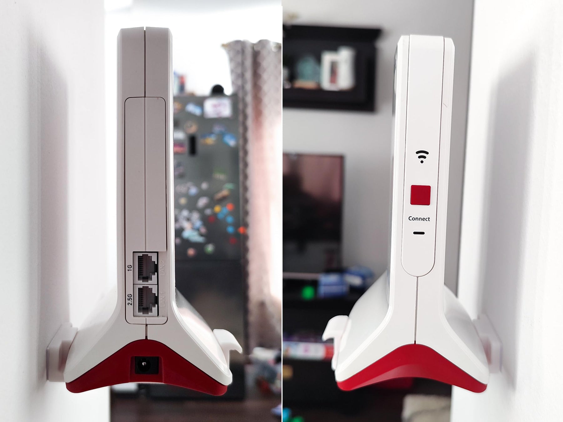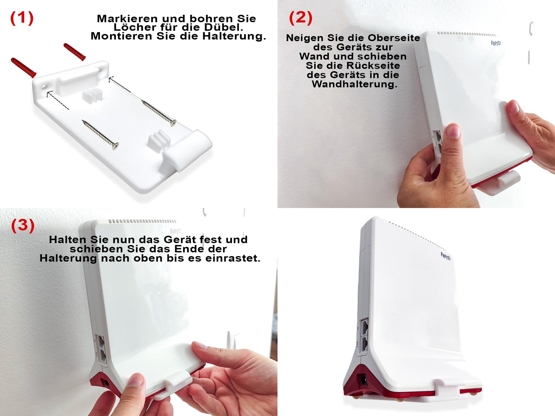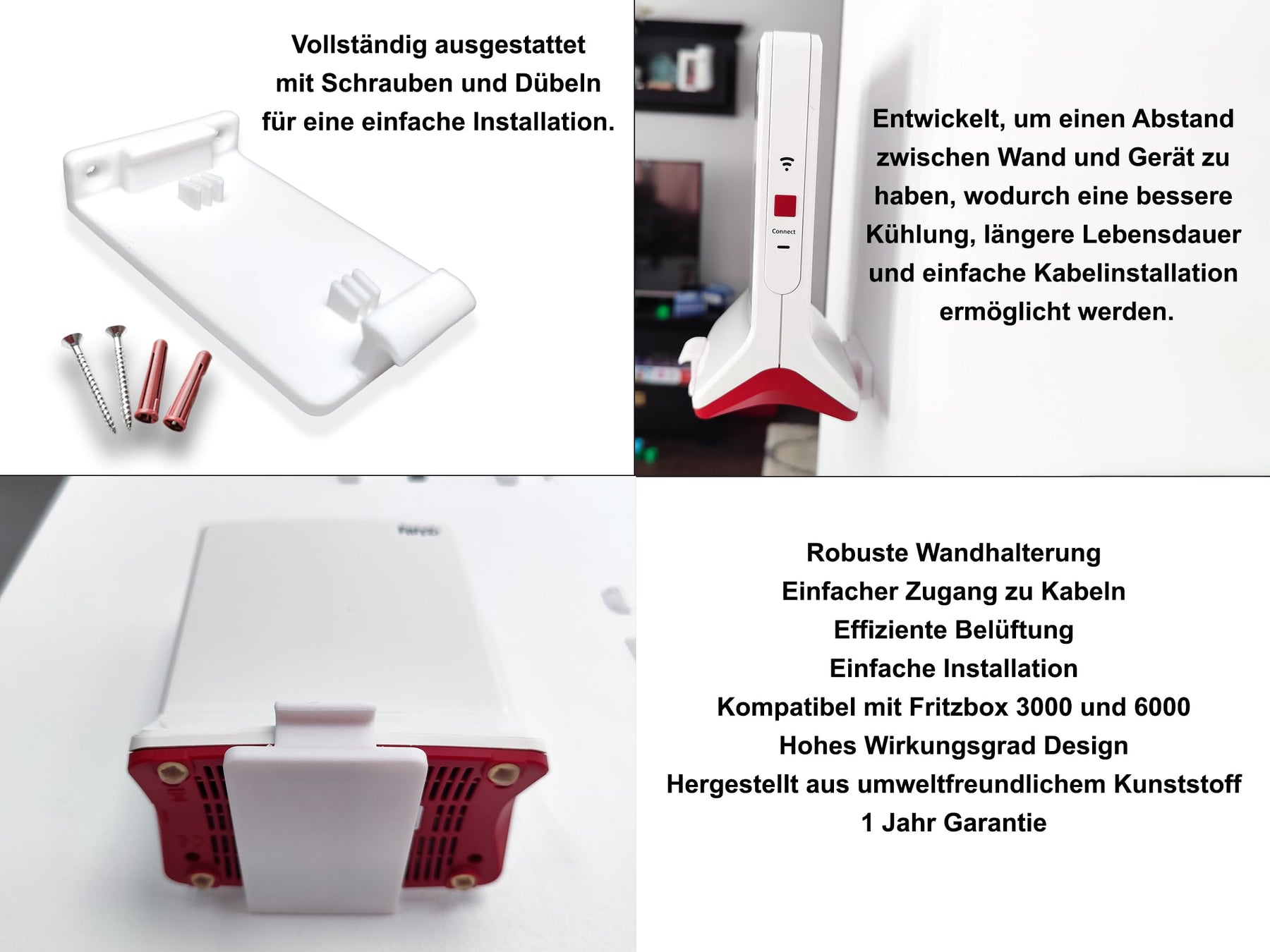 Einzelheiten: Diese robuste Wandhalterung ermöglicht eine flexible Montage des Fritz Repeater 3000 und 6000 in jeder Ausrichtung. Der integrierte Abstand zwischen Gerät und Wand sorgt für eine bessere Kühlung und erleichtert die Kabelinstallation. Mit dieser sicheren Halterung können Sie Ihren Repeater hoch an der Wand befestigen, um ein optimales Funksignal im gesamten Haus zu gewährleisten. Die solide Konstruktion bietet einen zuverlässigen Halt für Ihre Geräte.