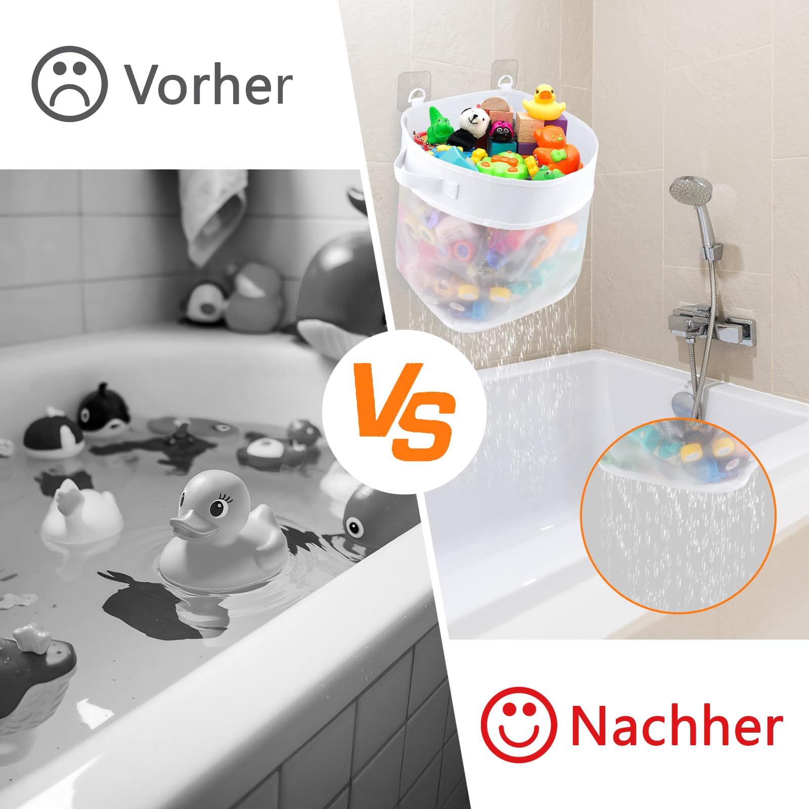 - 【Einfache Installation für Sofortige Nutzung】Mit den mitgelieferten 2 Klebehaken lässt sich die Badespielzeug Aufbewahrung kinderleicht an jeder glatten Oberfläche befestigen. Drücken Sie die Haken einfach auf eine trockene Wand, warten Sie 12 Stunden und beginnen Sie, sowohl Badespielzeug als auch Badeutensilien zu organisieren!