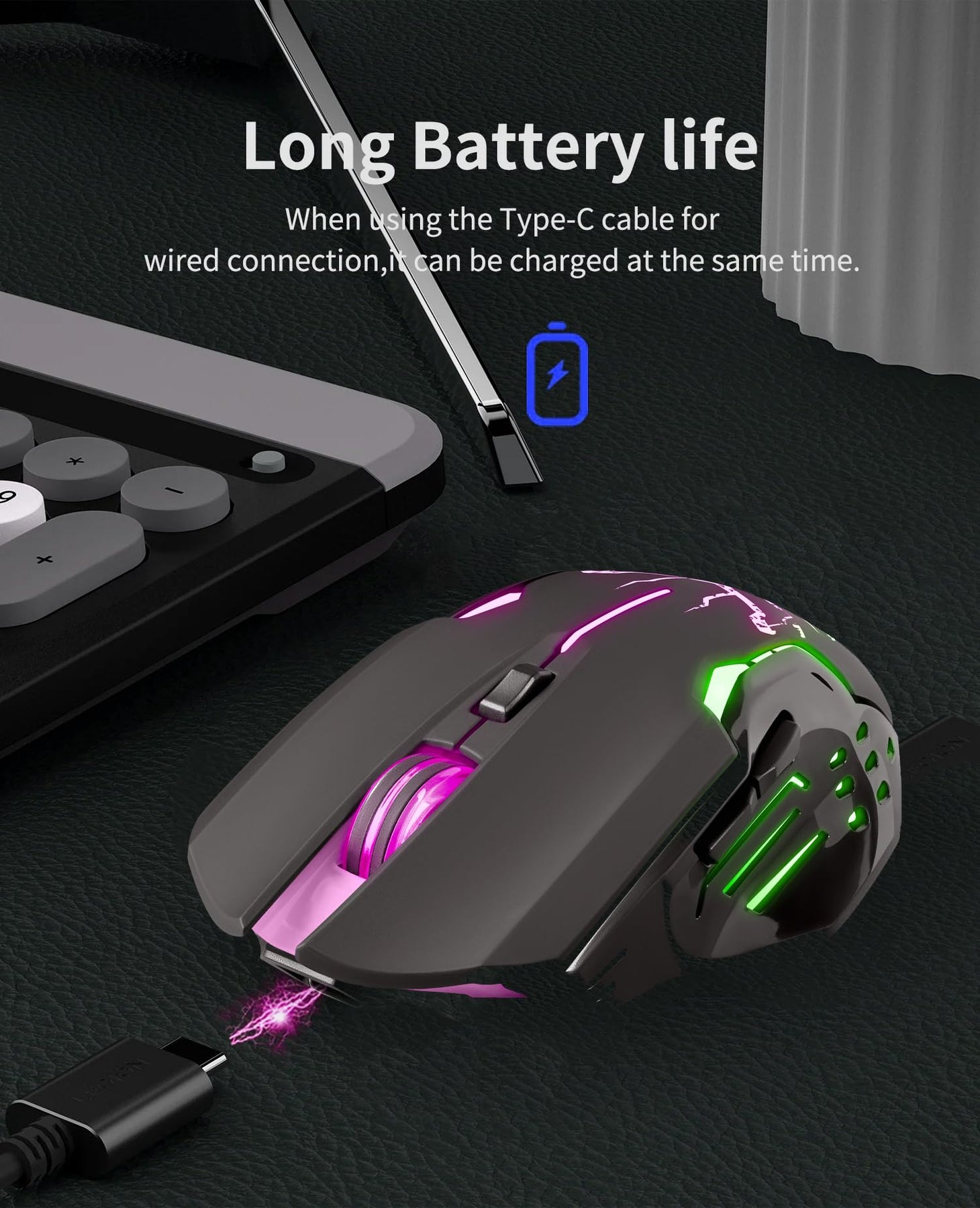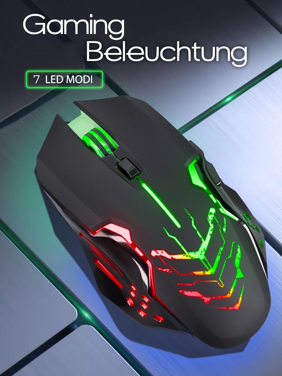 - ✅ Wireless Gaming Mouse mit Geräuschlose Klicks, verzögerungsfreier Kabel- oder WLAN-Verbindung. 2 zusätzliche Seitentasten. Die wiederaufladbare Maus hat eine Akkulaufzeit von bis 240 Stunden (RGB aus) mit einer einzigen USB-C Ladung. Die Maus kann auch während des Ladevorgangs verkabelt verwendet werden.Der USB-Empfänger befindet sich in der Box auf der Rückseite der Maus