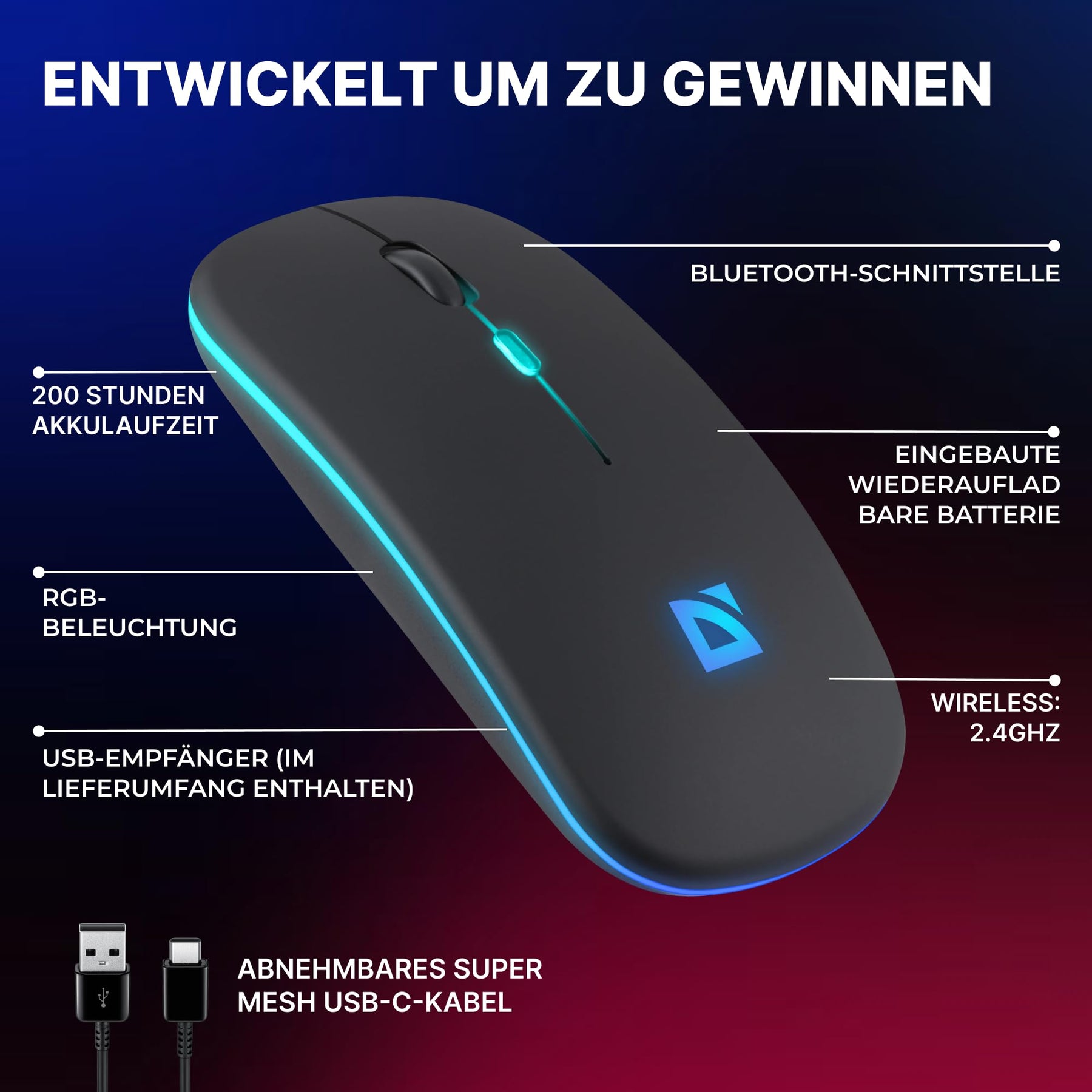 • EINGEBAUTE WIEDERAUFLADBARE BATTERIE: Mit der eingebauten wiederaufladbaren Batterie musst du dir keine Gedanken über den Batteriewechsel machen. Lade die Maus einfach über das mitgelieferte USB-Kabel auf und sei bereit für lange Arbeitstage, ohne Unterbrechungen durch leere Batterien.