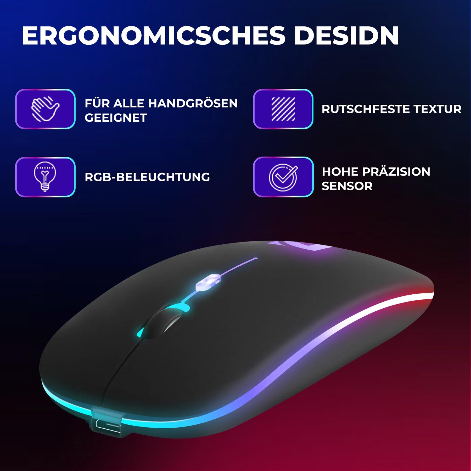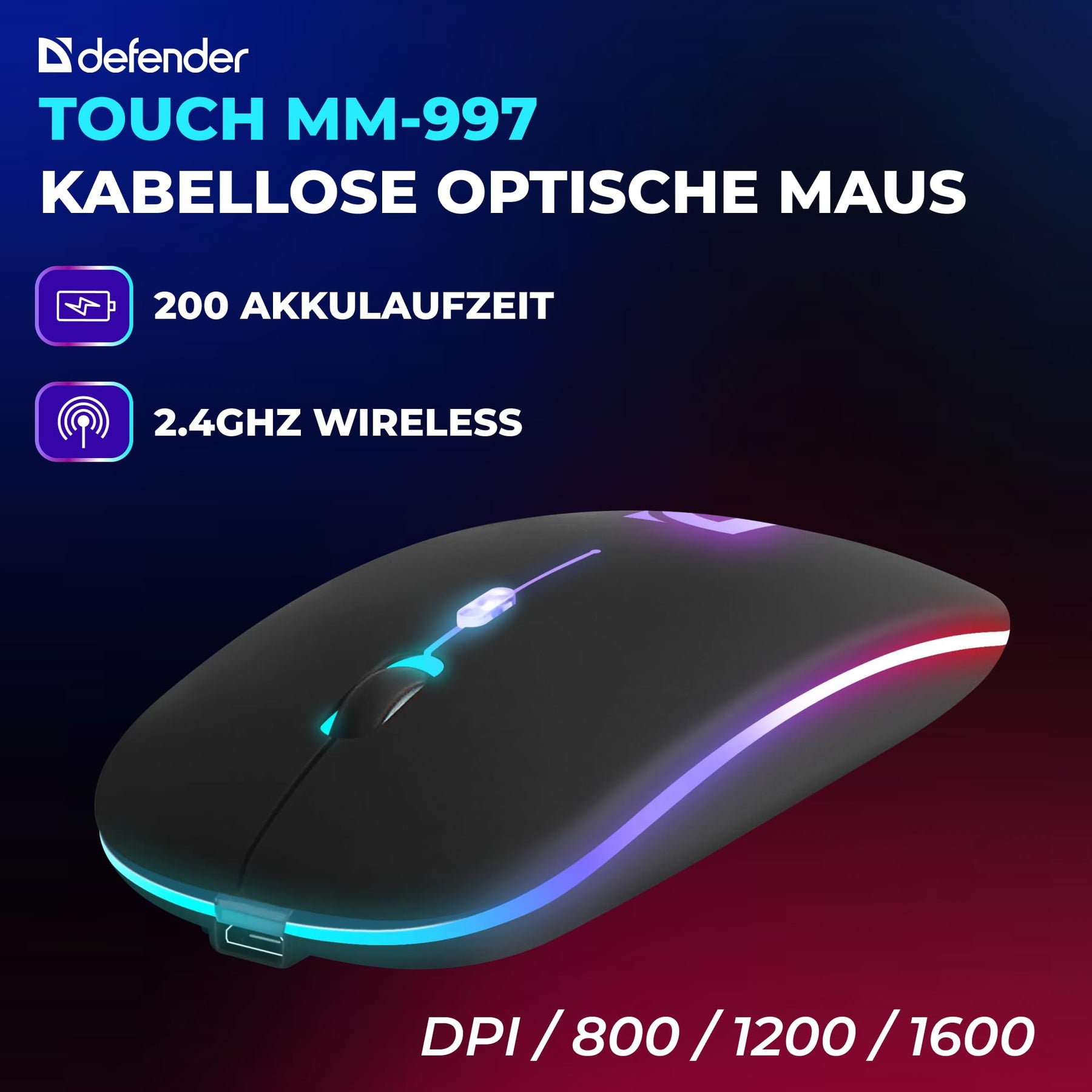 Einzelheiten: FLEXIBLE VERBINDUNGSMÖGLICHKEITEN: Die kabellose Maus Defender Touch MM 997 bietet vielseitige Verbindungsmöglichkeiten, darunter Bluetooth oder USB Empfänger. Egal welches Gerät Sie verwenden, diese Maus passt sich Ihren Bedürfnissen an und sorgt für eine zuverlässige Verbindung. KOMFORTABLE FORM FÜR BEIDHÄNDIGE VERWENDUNG: Die symmetrische, ergonomische Form der Defender Touch MM 997 liegt angenehm in der Hand und ist perfekt für Rechts und Linkshänder. Arbeiten Sie stundenlang ohne Ermüdung und genießen Sie bei jeder Verwendung maximalen Komfort. INDIVIDUELLE ANPASSUNG DER MAUSLEISTUNG: Mit 3 einstellbaren DPI Stufen 800/1200/1600 dpi können Sie die Empfindlichkeit der Maus an Ihre Bedürfnisse anpassen. Wählen Sie zwischen schneller Navigation oder präziser Steuerung für ein optimales Arbeitserlebnis. EINGEBAUTES WIEDERAUFLADBARES AKKU: Mit dem eingebauten wiederaufladbaren Akku müssen Sie sich keine Gedanken über den Batteriewechsel machen. Laden Sie die Maus einfach mit dem mitgelieferten USB Kabel auf und seien Sie bereit für lange Arbeitstage ohne Unterbrechungen durch leere Batterien. BUNTE RGB BELEUCHTUNG: Tauchen Sie Ihre Arbeitsumgebung mit der RGB LED Beleuchtung des Defender Touch MM 997 in ein buntes Lichtspiel. Wählen Sie aus einer Vielzahl von Farben und Effekten, um Ihre persönliche Note zu verleihen und Ihren Arbeitsplatz zu einem echten Hingucker zu machen.