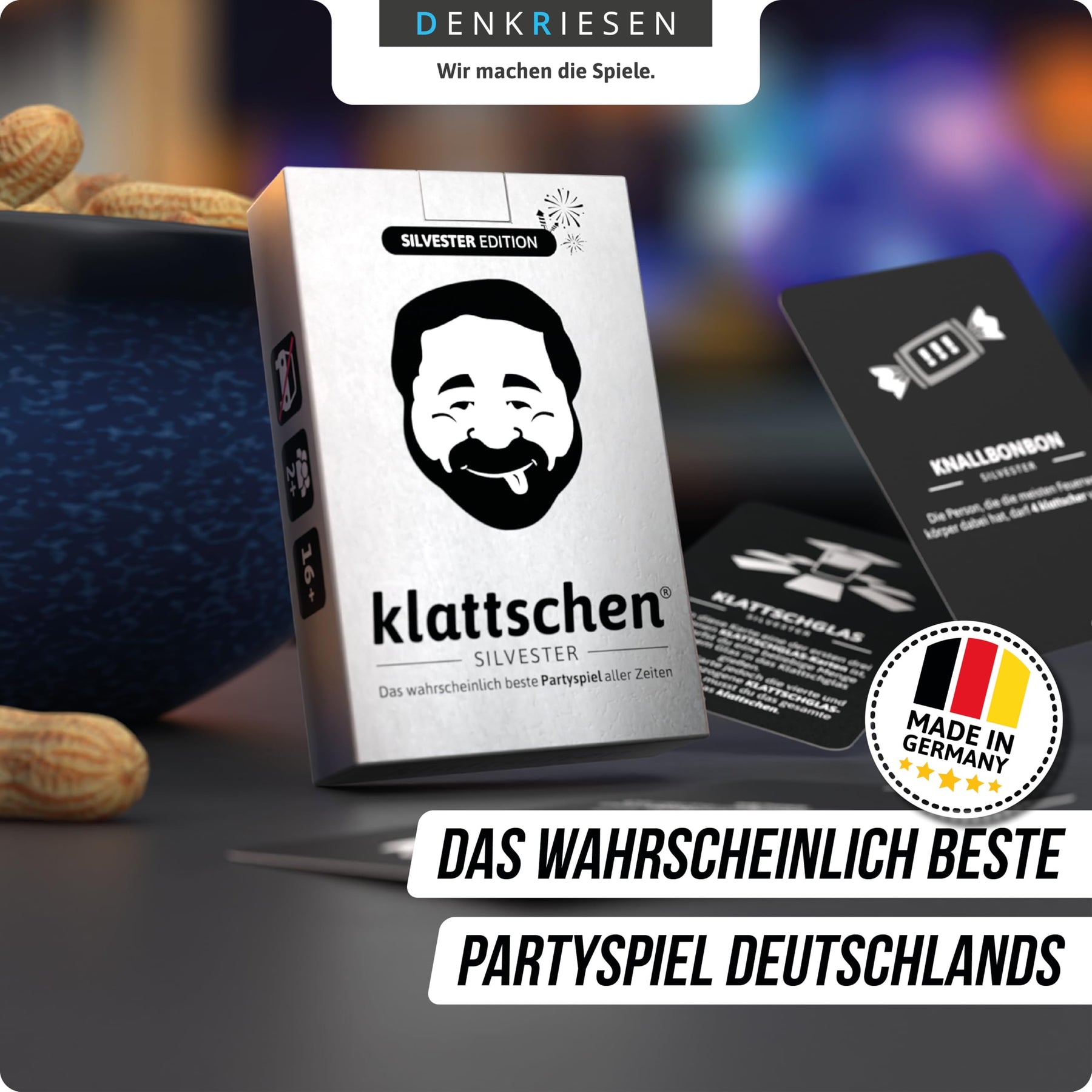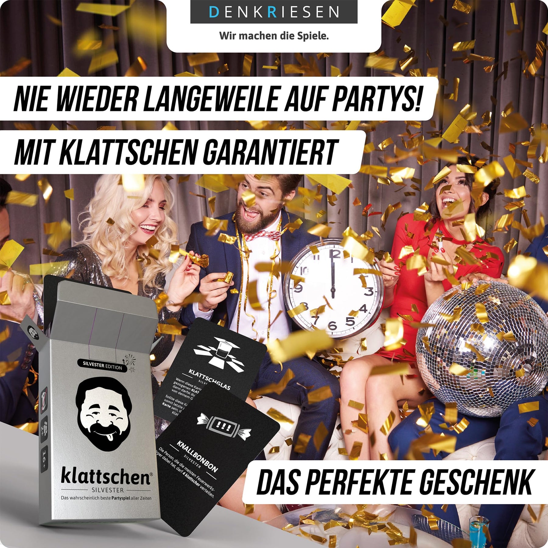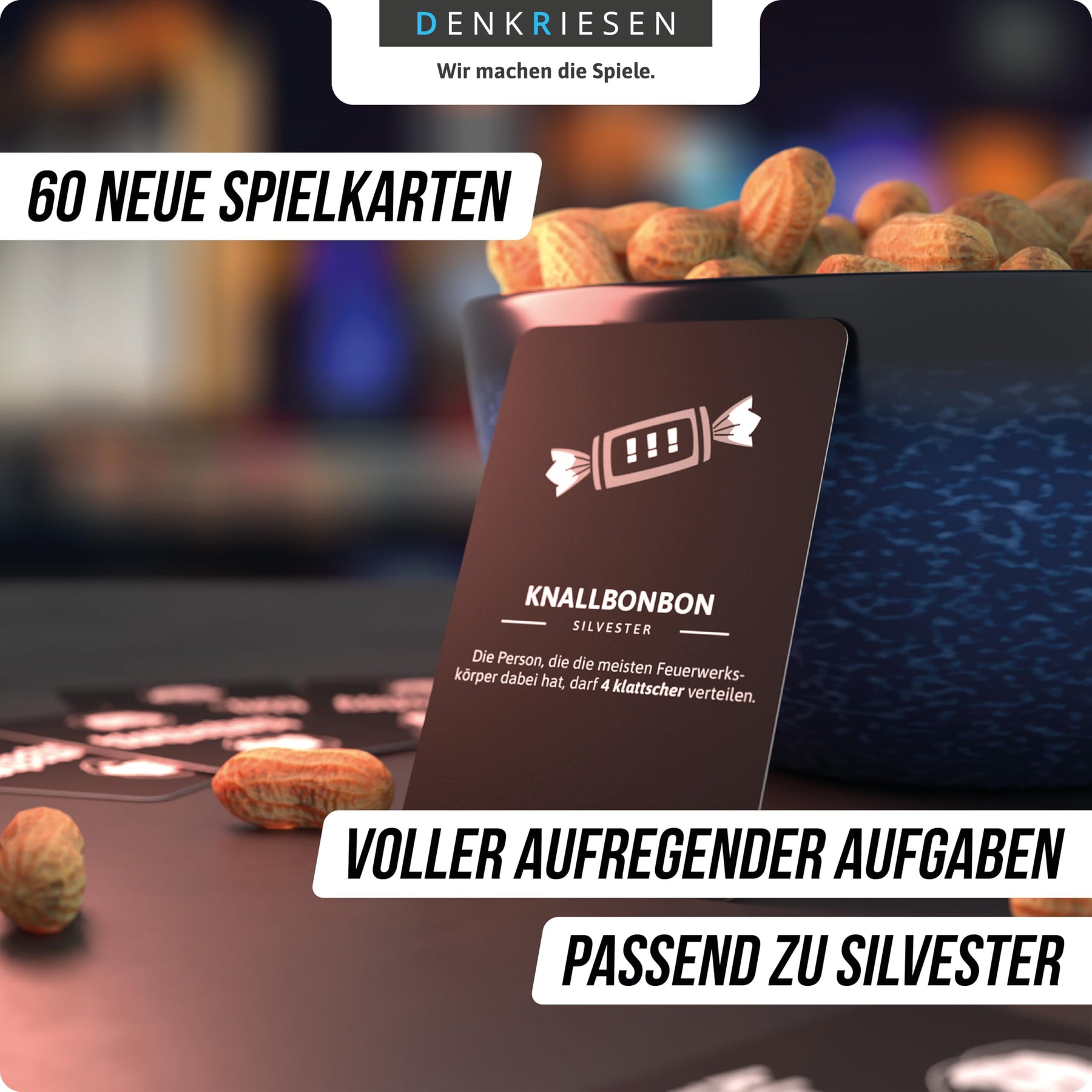 - 🎉 klattschen – Silvester Edition: Das Partyspiel von Denkriesen sorgt mit 40 kreativen Aufgaben und 60 einzigartigen Karten für ein unvergessliches Spielerlebnis an Silvester.