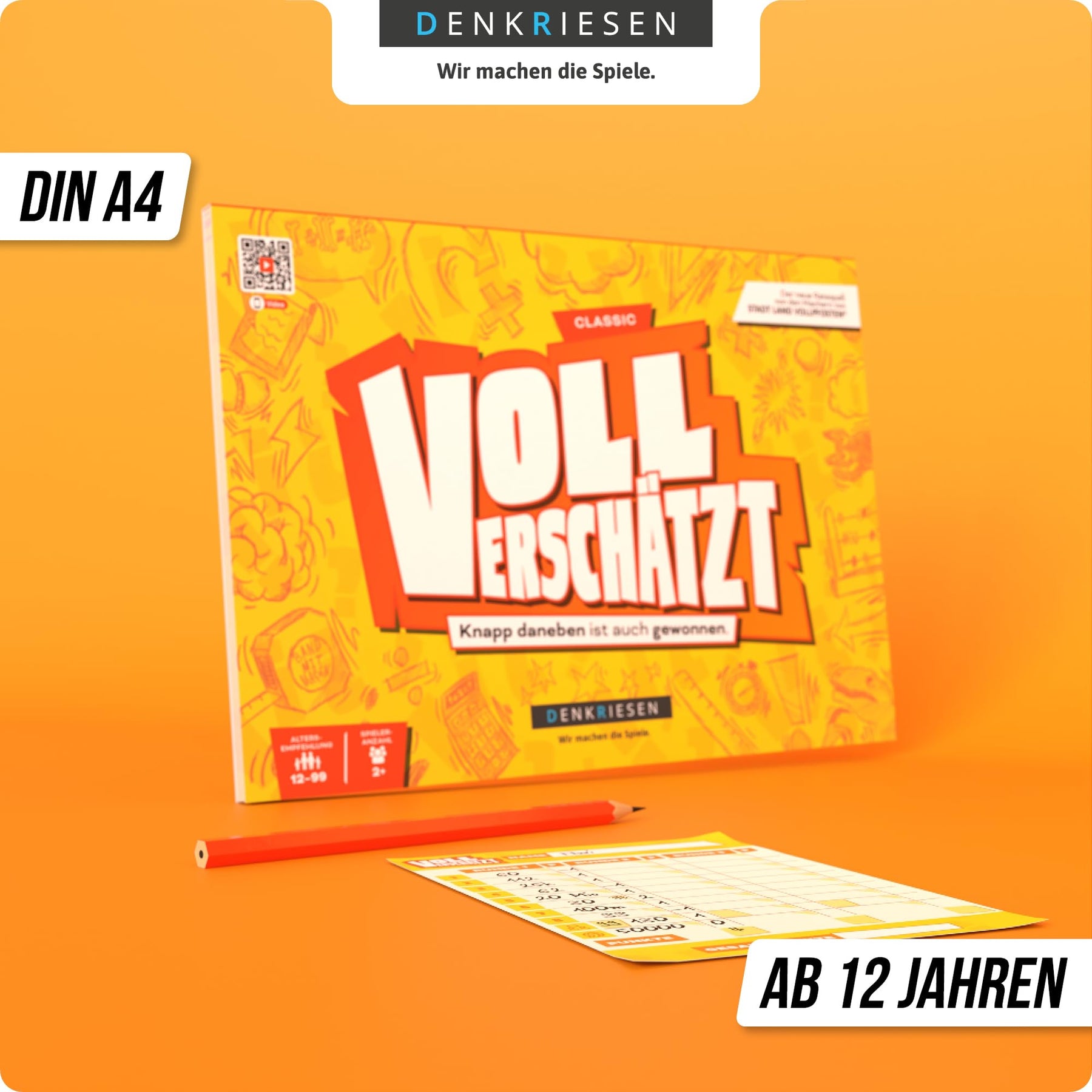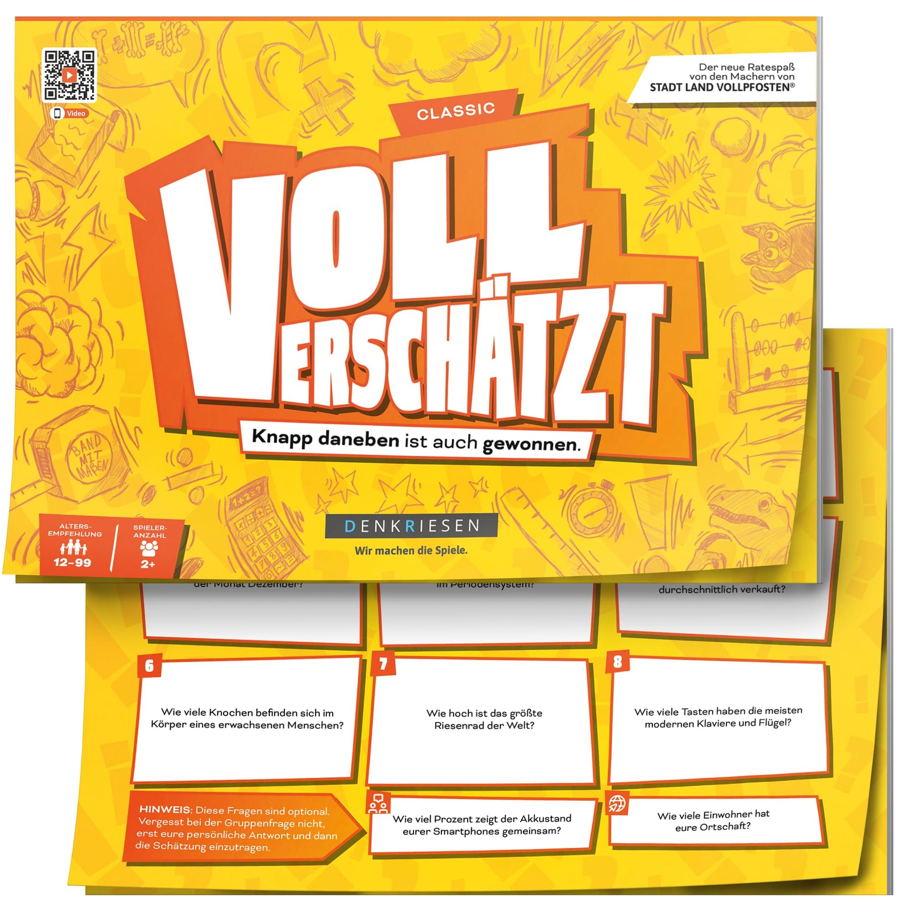 - 👪 FAMILIENFREUNDLICH - VOLL VERSCHÄTZT ist das ideale Schätzspiel für die ganze Familie. Ab 12 Jahren geeignet und für 2 oder mehr Spieler. Egal ob Groß oder Klein – hier kommen alle auf ihre Kosten. Ein garantiert spaßiges Erlebnis für Jung und Alt!