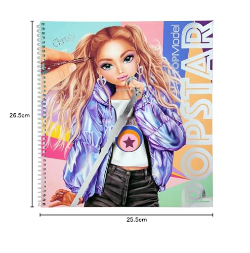 Mit dem TOPModel Popstar Malbuch können Mädchen trendige Model-Outfits entwerfen und dabei ihrer Fantasie freien Lauf lassen. Auf den 60 Seiten sind unterschiedliche Model-Figurinen als coole Sängerinnen und Stars abgebildet, die nach Lust und Laune bemalt und beklebt werden können. Weiterhin beinhaltet das Buch 2 Schablonen, 2 Bogen transparenter Folien-Aufkleber sowie einigen Papierseiten Stoff-Muster. Das hochwertige Malheft lässt sich durch die praktische Ringbindung leicht umblättern, ist ca. 26,5 x 25,5 x 1,3 cm groß und sorgt für eine kreative Freizeitgestaltung.