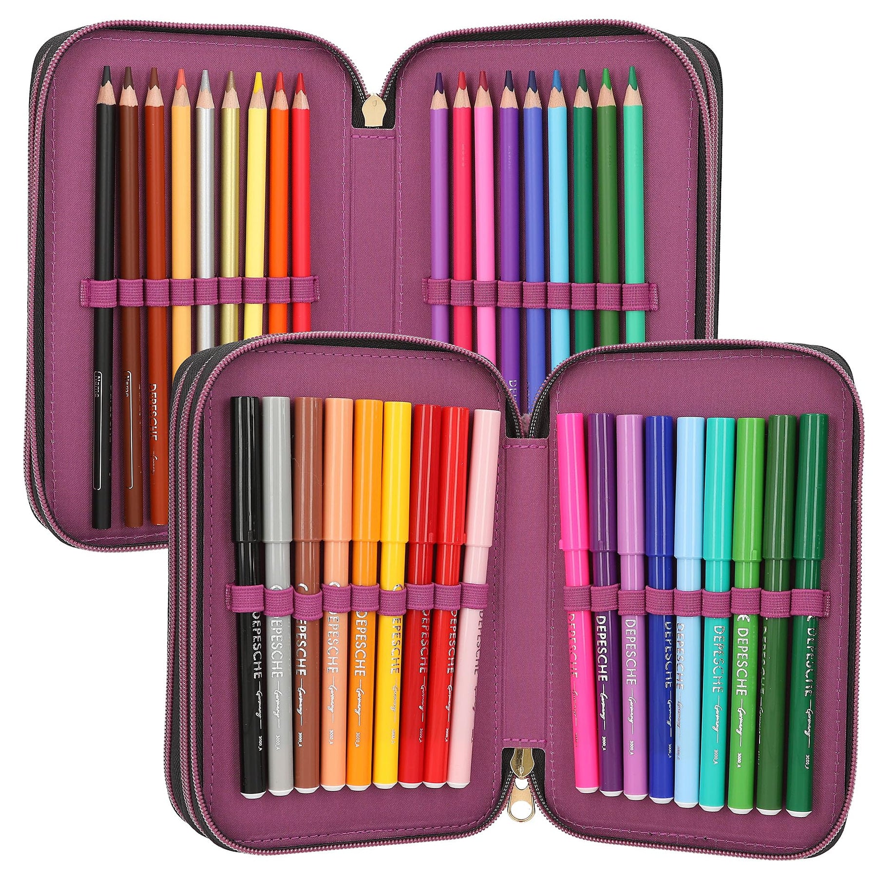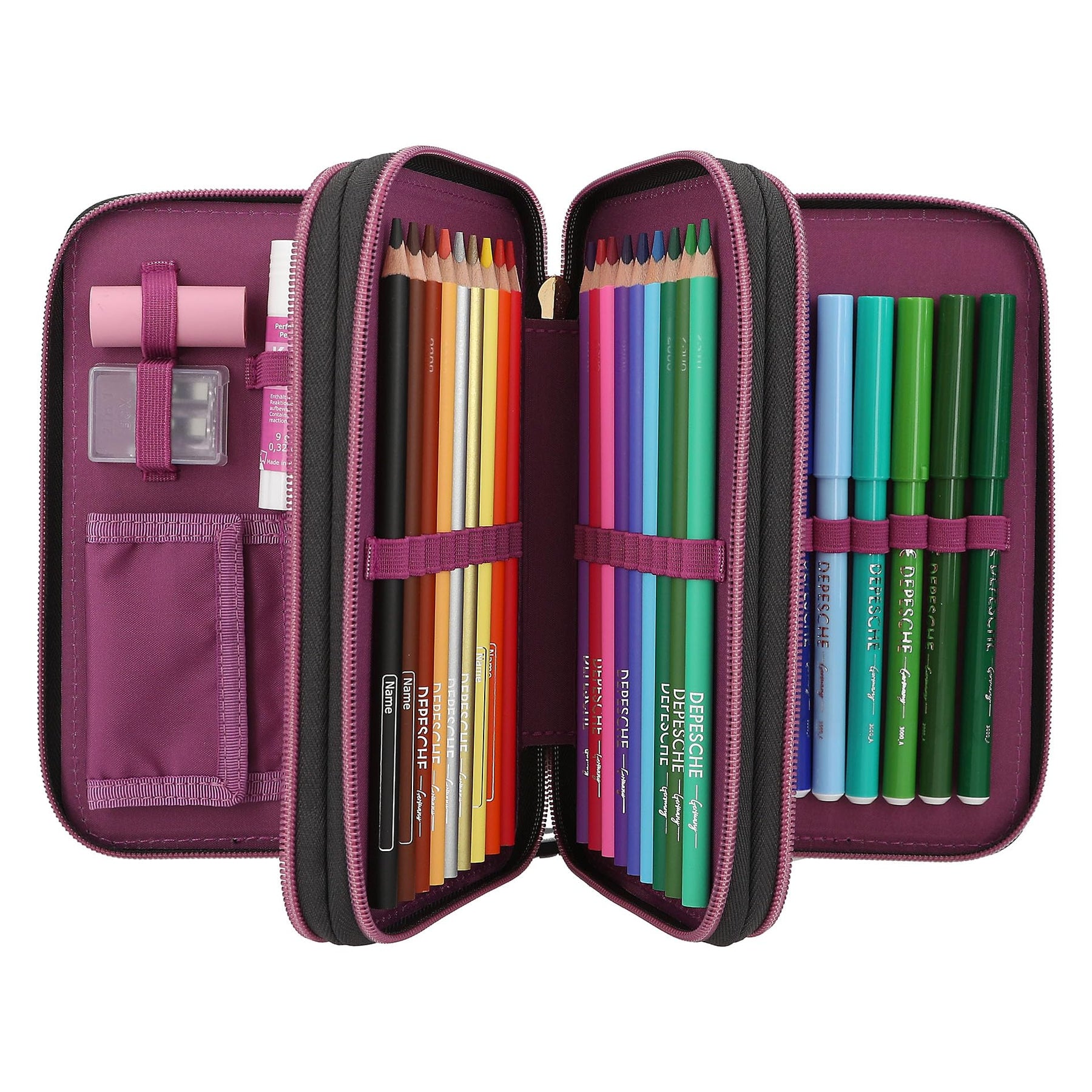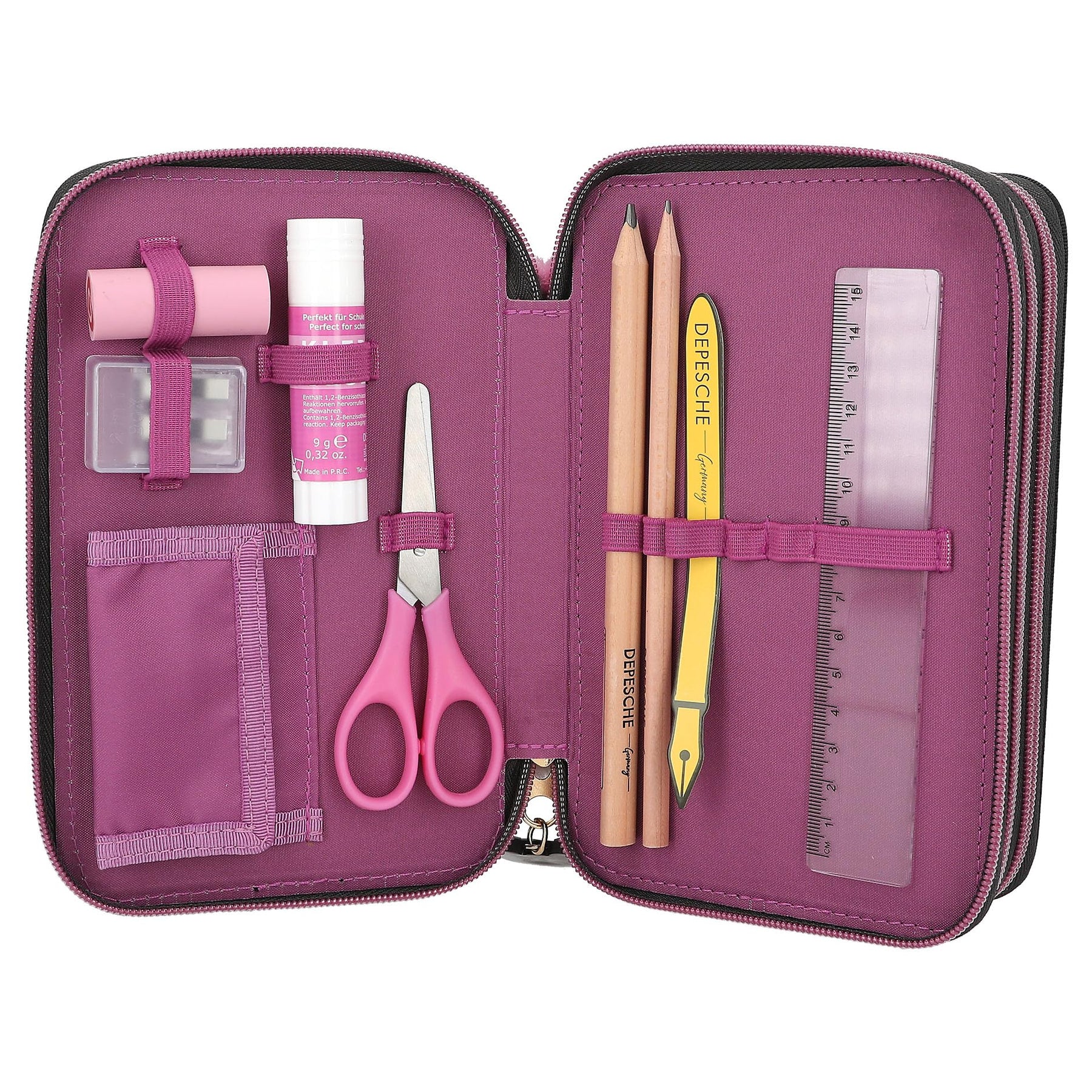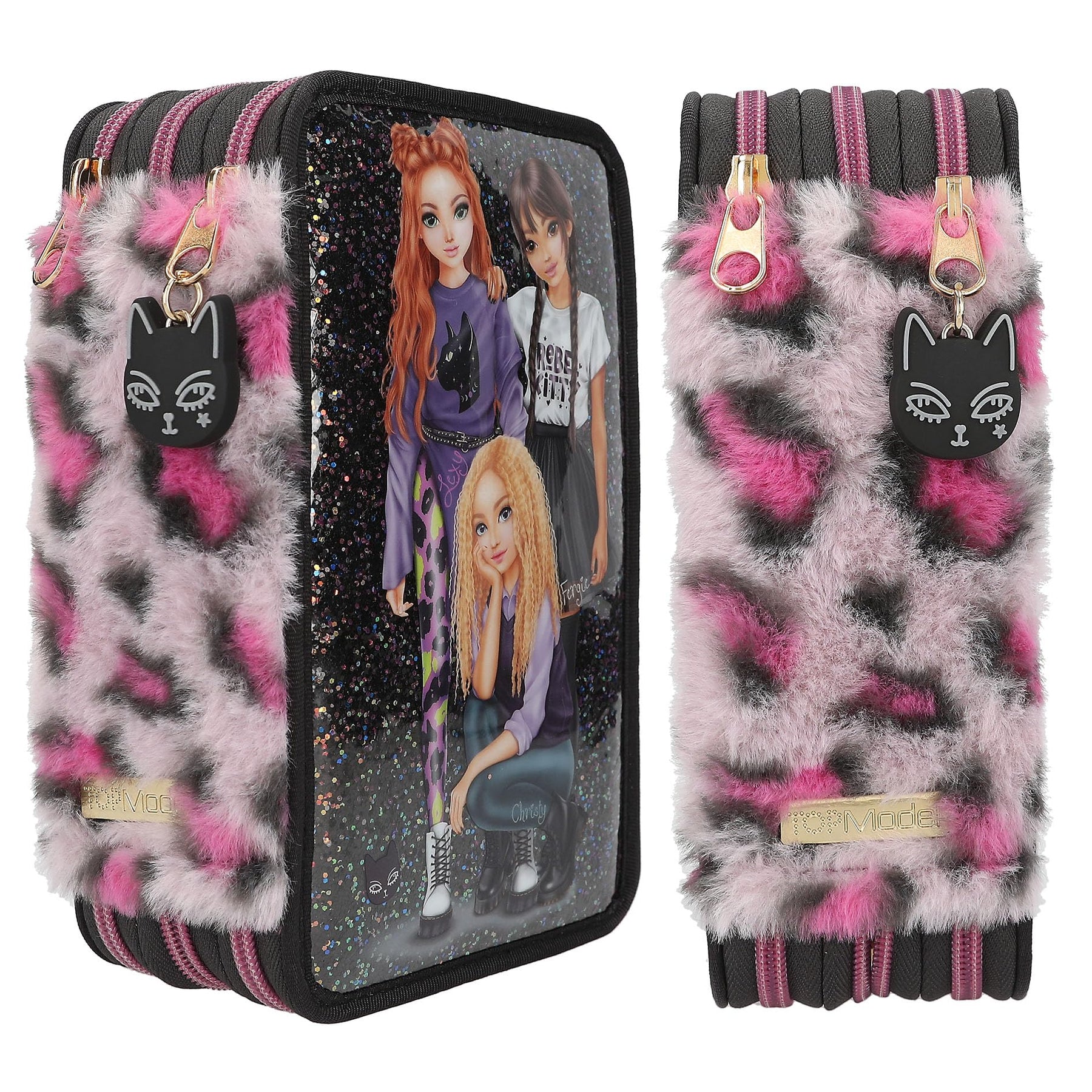 Die Federtasche im TOPModel Design ist bereits gefüllt und bietet genug Platz für alle Stifte, Zeichenutensilien und was Ihr Kind sonst noch in der Schule benötigt. Enthalten sind im unteren Fach 18 Fasermaler und im mittleren Fach 18 Buntstifte in trendigen Farben. Im oberen Fach befinden sich ein Klebestift, ein Radiergummi, ein Doppelspitzer, eine Schere, zwei Bleistifte in unterschiedlichen Stärken, ein Lineal (ca. 15 cm) und ein kleines Fach für Zettelchen, Notizen und Tintenpatronen. Die schwarze Federmappe mit den 3 Reißverschlussfächern ist mit einem Model Motiv, Glitzer und Plüsch Fell verziert und ca. 20 x 13 x 7,5 cm groß. Cooles Extra ist der Katzen-Anhänger am Reißverschluss.
