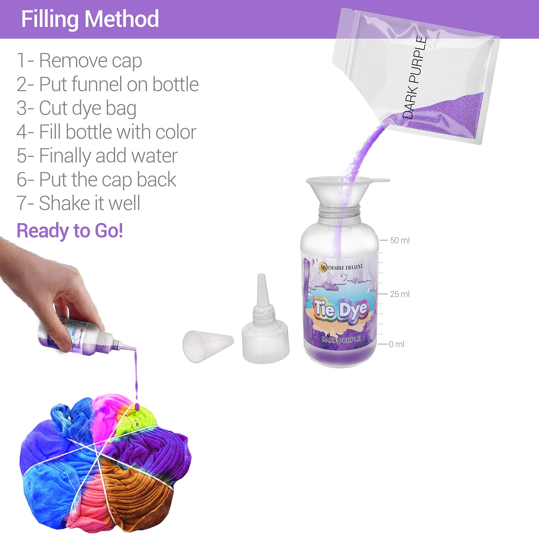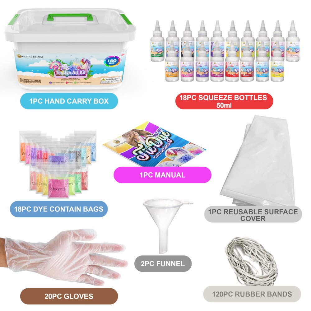 - Komplett-Set. Lieferumfang: 18 x Flaschen, 18 x Farbpulver, 120 x Gummibänder, 20 x Handschuhe, 1 x wiederverwendbare Oberflächenabdeckung, 2 x Trichter, 1 x Handbuch