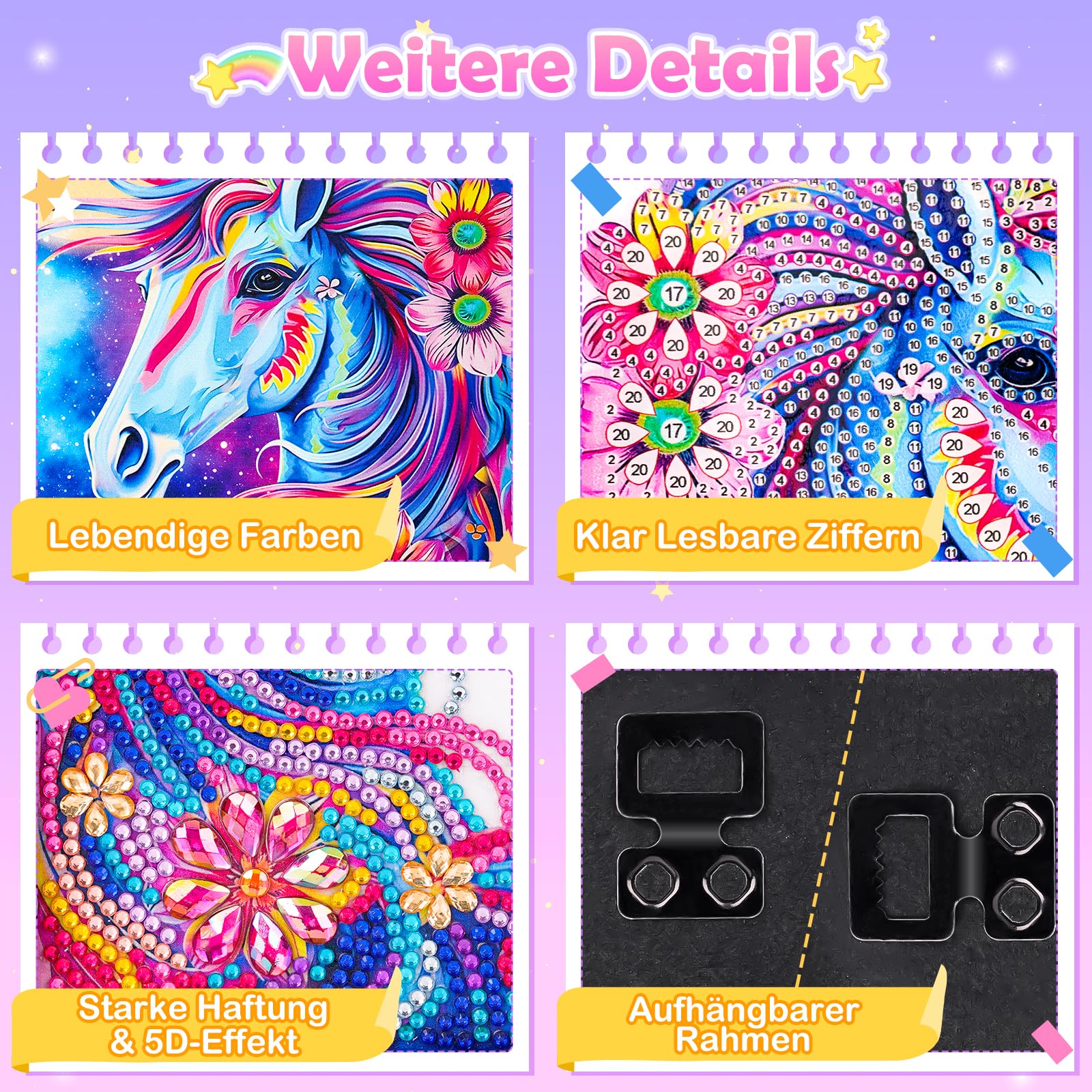 • 【Spielzeug ab 5 6 8 jahre mädchen- eltern-kind-spiel】DIY basteln kinder ist geeignet für basteln mädchen 5 6 7 8 9 10 11 12 jahre. Das diamond painting kinder hat 2 leinwände, einhorn und pferde, und sie können 2 5d diamond paintings erhalten, indem sie diamant anbringen. Kinder und eltern führen es gemeinsam durch, fördern die hand-auge-koordination, geduld und farbabstimmung der kinder und verbessern die eltern-kind-beziehungen! Ideal geschenk mädchen 5 6 7 8 9 10 11 12 jahre
