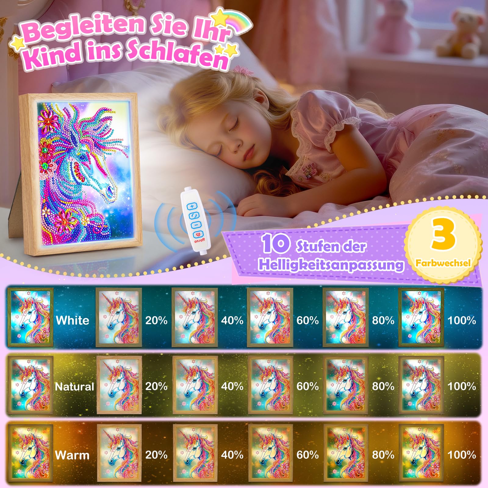 • 【Diamond painting kinder mit nachtlicht kinder dimmbar und bilderrahmen】Nachtlicht kinder einhorn bietet 3 farben (warmweiß, weiß, natur) und 10 helligkeitsstufen. Diamond painting kinder bilderrahmen kann aufgestellt oder aufgehängt werden – eine tolle dekoration! wenn das selbstgemachte diamond painting kinder als nachttischlampe das einschlafen begleitet, was für eine wundervolle sache! Fun bastelset mädchen einhorn for geschenk mädchen 5 6 7 8 9 10 11 12 jahre