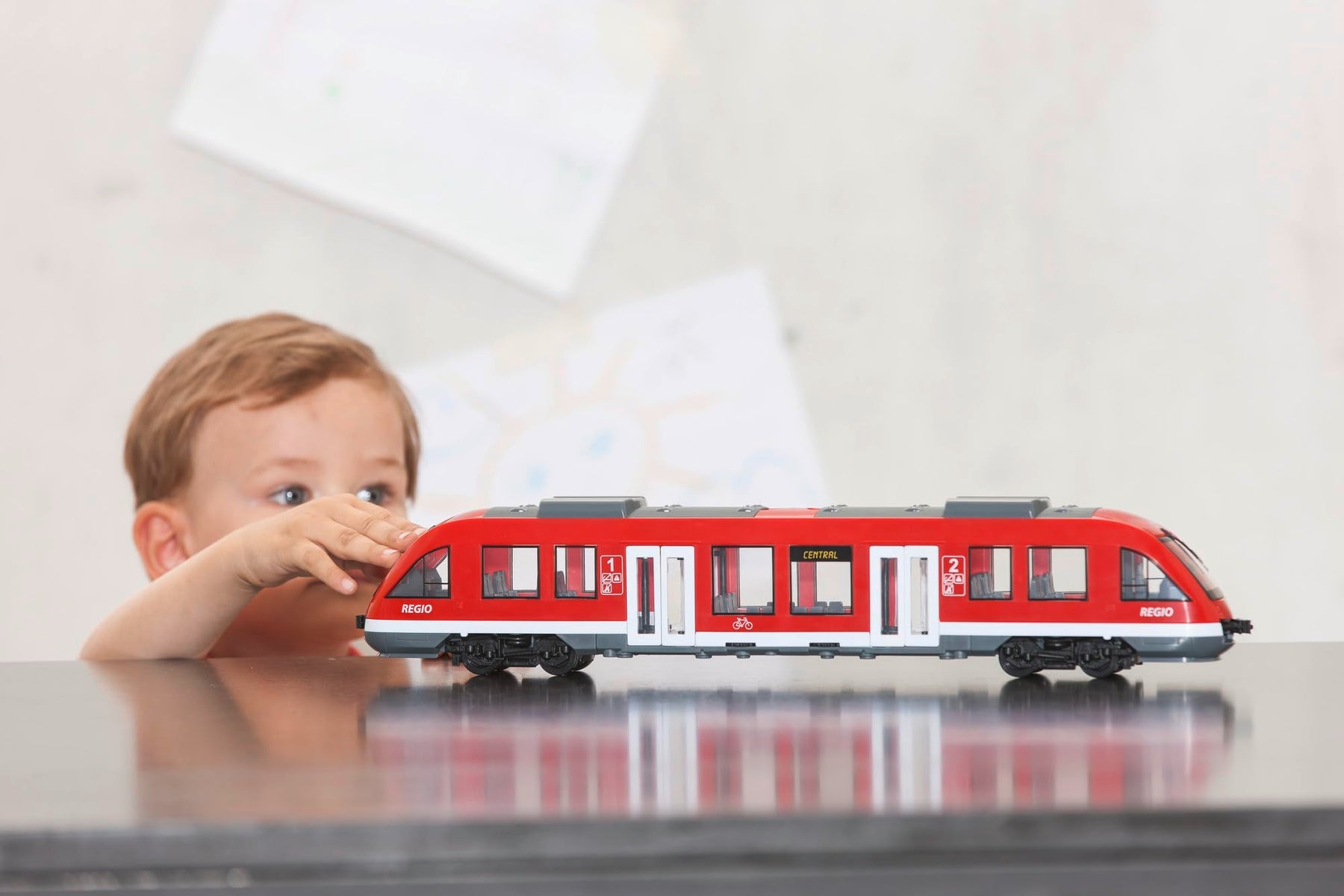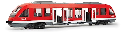 „Zurücktreten, bitte - der Dickie Toys City Train fährt ein“ - Mit dem Dickie Toys City Train holen Sie sich den Klassiker im Maßstab 1:45 ins Kinderzimmer. Ob für kleine, oder große Sammler - mit beeindruckenden 45 cm Länge und zahlreichen gestalterischen Details bringt er den Großen im Regal ebenso viel Freude, wie den Kleinen ab 3 Jahren als Ergänzung in ihrem Spieleparadies. Ideal auch als Einstieg für Junior-Modellbau-Fans. Bringt seine Gäste sicher ans Ziel - Mit seinen frei rollenden Rädern kommt er ganz ohne Schienen aus und holt selbst aus entlegenen Ecken der Spielzeugstadt problemlos seine Gäste ab. Als originalgetreue Nachbildung eines Regionalzuges bringt er echtes Verkehrs-Feeling nach Hause. Lassen Sie Ihre Kinder spielerisch erfahren, wie ein Zug funktioniert und schulen Sie ihr logistisches Geschick, wenn sie sich daran machen, eigene Fahrpläne auszutüfteln. Das kann sich sehen lassen. Durch seine Größe ist er leicht zu greifen und zu bewegen, doch auch im Inneren gibt es viel zu entdecken. Die lichtdurchlässigen Scheiben ermöglichen einen guten Blick auf die originalgetreue Innengestaltung des Zuges. Und für die, die es ganz genau wissen wollen, verfügt er über ein Abnehmbares Dach. So können sich Ihre kleinen Zugführer die einzelnen Elemente, die einen Regionalzug ausmachen, auch ganz aus der Nähe ansehen. Ein Qualitäts-Spielzeug von Dickie Toys - Als Unternehmen mit bald 50 Jahren Branchenerfahrung wissen wir, wie wir Kinder verschiedenster Altersgruppen begeistern und zum Spielen animieren. Schon die Kleinsten beginnen sehr früh damit, die zahlreichen Spielfunktionen zu entdecken und zu testen. Ob im Kinderzimmer oder draußen im Freien, mit Dickie Toys ist der Spielspaß absolut garantiert. .