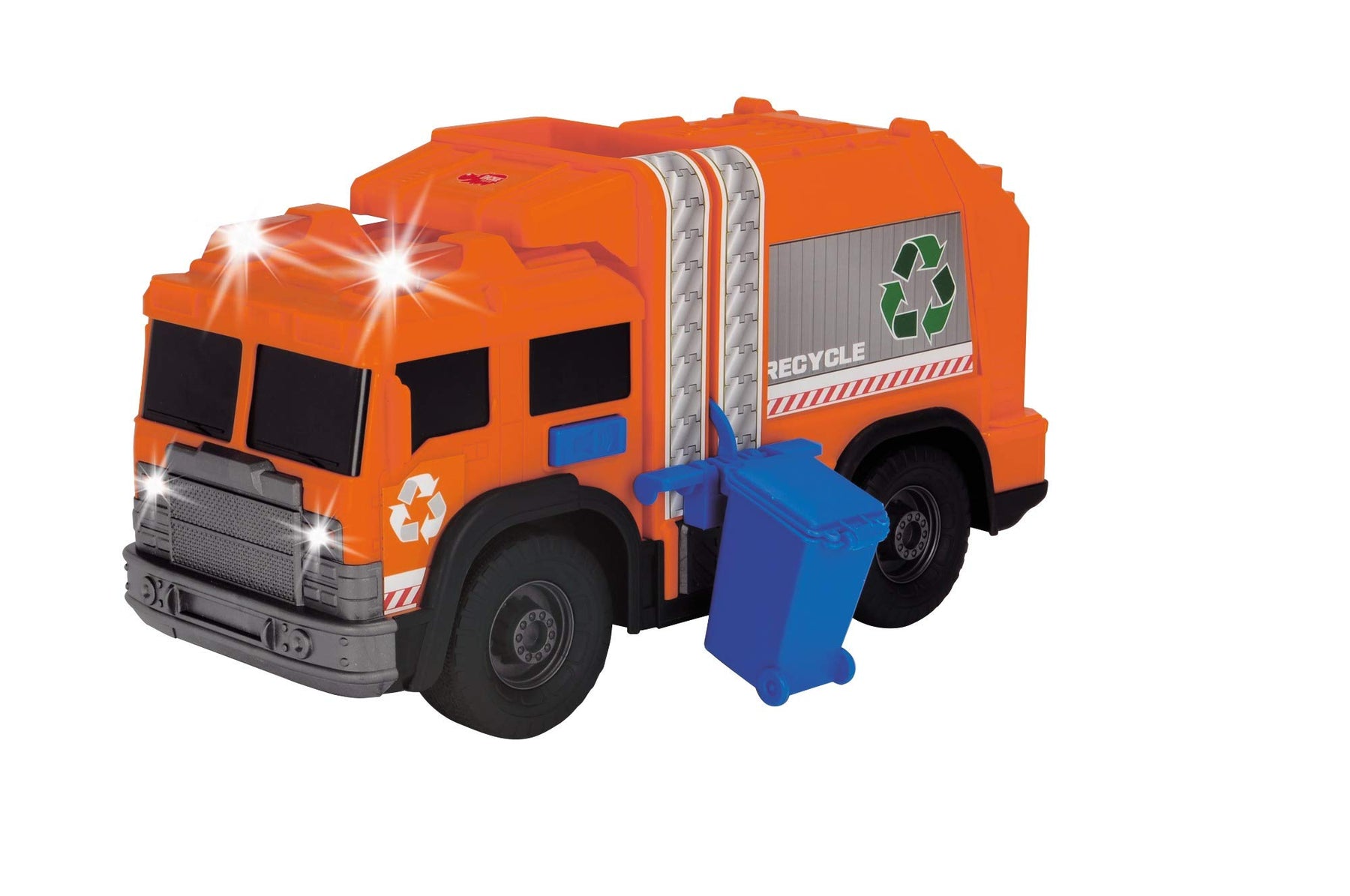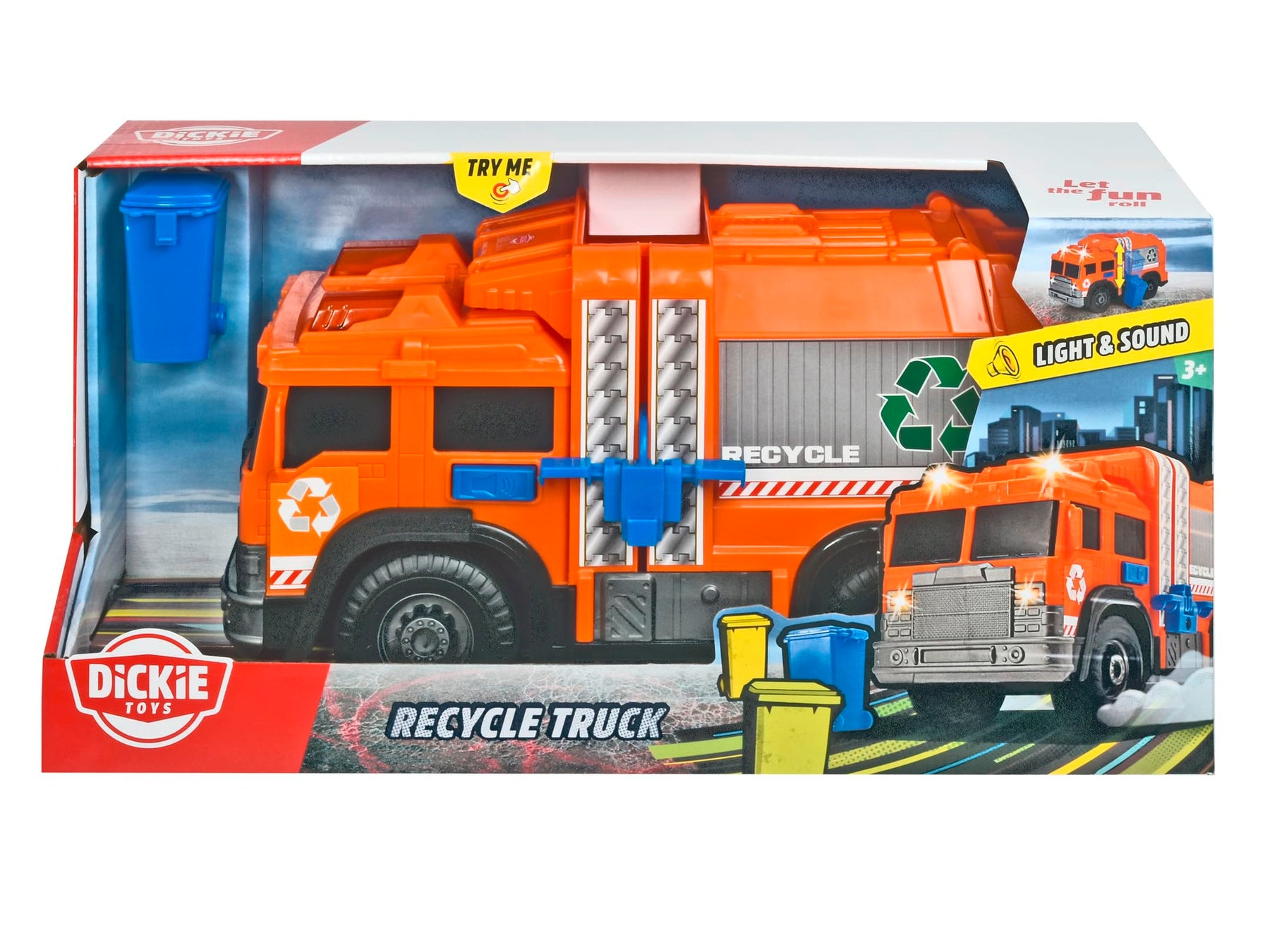 Recycling leicht gemacht mit dem Dickie Toys Recycle Truck! Mit dem tollen Dickie Toys Recycle Truck können schon die Jüngsten lernen, wie der Müll abgeholt wird. Mehrmals pro Woche fährt das Müllauto an den Häusern der Stadt vorbei und leert die Säcke in seinen großen Abfallbehälter, der auf einer Sammelstelle wieder entleert wird. Beim Spielen mit dem Müllauto lernen Kinder ganz spielerisch, dass Mülltrennung auch im echten Leben wichtig ist. Mit beweglichem Abfallbehälter Wie kommt der Müll von der hauseigenen Tonne eigentlich in den Wagen? Das große Recycle Auto (Länge: 30cm) zeigt wie es geht! An der Seite ist eine blaue Tonne angebracht, die sich mechanisch anheben und wieder absenken lässt. Unten können die Müllsäcke ganz einfach eingeladen und Manuell mit dem Hebel nach oben befördert werden, um alles im großen Müllauto zu entleeren, die Heckklappe lässt sich ebenfalls öffnen. Das Müllauto besitzt zudem auch eine Licht- und Soundfunktion. Die dafür benötigten Batterien (2x 1,5V-R6) sind bereits im Lieferumfang enthalten, damit der Spielspaß direkt beginnen kann. Spielend lernen Beim Spielen mit dem Müllwagen können Kinder ab 3 Jahren sich kreativ entfalten und immer neue Geschichten erzählen. Durch die bewegliche Abfalltonne können sie sich zudem auch motorisch ausprobieren und lernen ganz spielerisch technische Zusammenhänge kennen. Ein Qualitäts-Spielzeug von Dickie Toys Als Unternehmen mit über 50 Jahren Branchenerfahrung wissen wir, wie wir Kinder verschiedenster Altersgruppen begeistern und zum Spielen animieren. Schon die Kleinsten beginnen sehr früh damit die zahlreichen Spielfunktionen zu entdecken und zu testen. Dickie Toys schult so die motorischen Fähigkeiten und geht zudem erste Schritte in Richtung Verkehrserziehung. Ob im Kinderzimmer oder draußen im Freien, mit Dickie Toys ist der Spielspaß absolut garantiert.