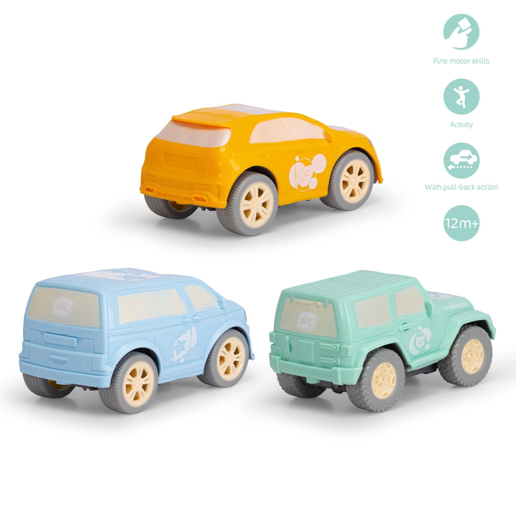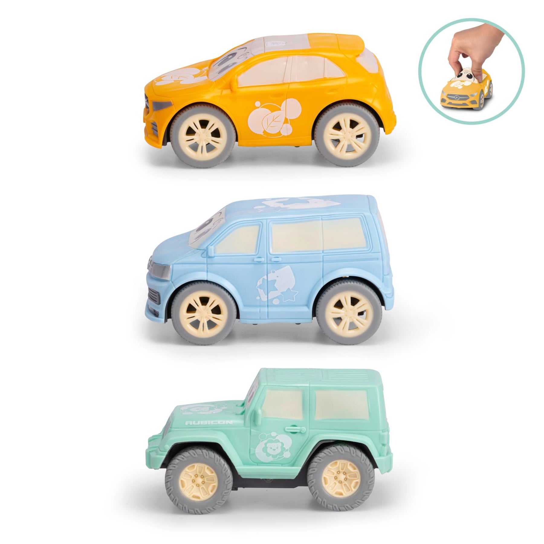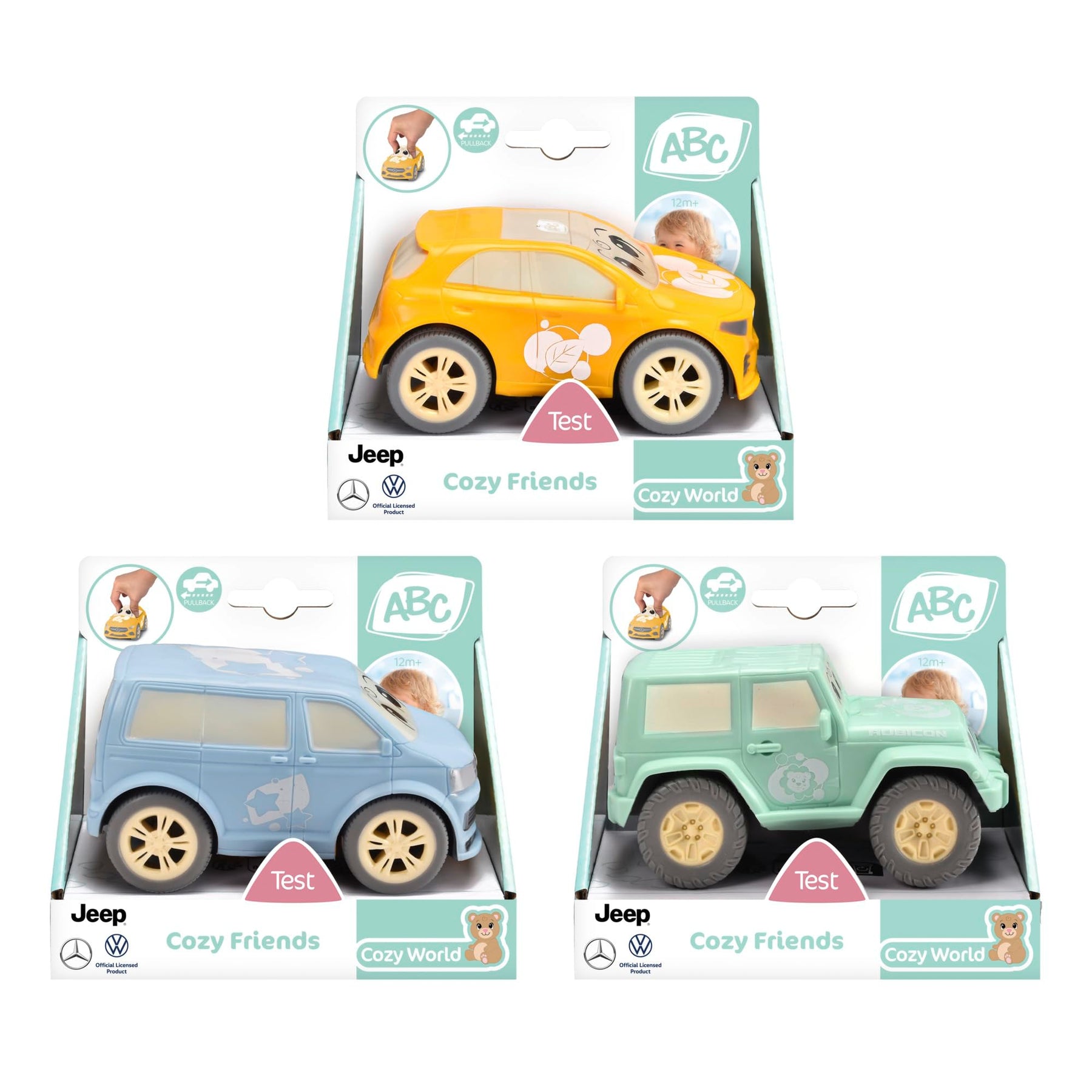 ABC Cozy Friends: Weiche Autos für die Kleinsten! Einfach zurückziehen, loslassen und beobachten, wie das Spielzeugauto über den Boden fährt: Dank des Rückzugmotors rollen die Cozy Friends von ganz alleine! Das übt auf Babys und Kleinkinder eine besondere Faszination aus und animiert sie zum neugierigen Erforschen und Interagieren. Dazu lädt auch das weiche, knautschbare Fahrzeug-Material ein – denn es lässt sich wunderbar drücken und quetschen. Die optimalen Voraussetzungen für unbeschwerte Fahr- und Spiel-Abenteuer! Spielauto per Überraschungsauswahl Bei Bestellung erhalten Sie EINES von DREI offiziell lizenzierten Fahrzeug-Modellen. Die Auswahl erfolgt per Zufallsprinzip, eine Vorauswahl ist leider nicht möglich: 1. Mercedes-Benz Auto (senfgelb) 2. Volkswagen Bus (hellblau) 3. Jeep Geländewagen (türkis) Liebevoll gestaltetes Autospielzeug Die Cozy Friends Aufziehautos sind jeweils 11cm groß und absolut kindgerecht gestaltet: speichelfest, abgerundet und mit niedlichen Augen auf der Windschutzscheibe. Die beruhigenden, gedeckten Farben fügen sich harmonisch ins Kinderzimmer ein und tragen zur entspannten Spielatmosphäre bei – perfekt als Geschenk und Kinder-Spielzeug ab 1 Jahr! Mit ABC spielerisch die Welt entdecken! ABC weckt mit altersgerechten Produkten die Neugierde von Babys und Kleinkindern ab 12-36 Monaten und unterstützt dabei die Entwicklung in den ersten Lebensjahren. Spielerisch werden erste Lernziele erreicht, Formen und Strukturen entdeckt sowie Koordinationsmuster geschult. Egal ob als Geschenk für Weihnachten, Ostern, den Geburtstag oder als kleine Aufmerksamkeit für Zwischendurch – mit unseren Spielsachen bereiten Sie große Freude und unterstützen gleichzeitig die frühkindliche Entwicklung.