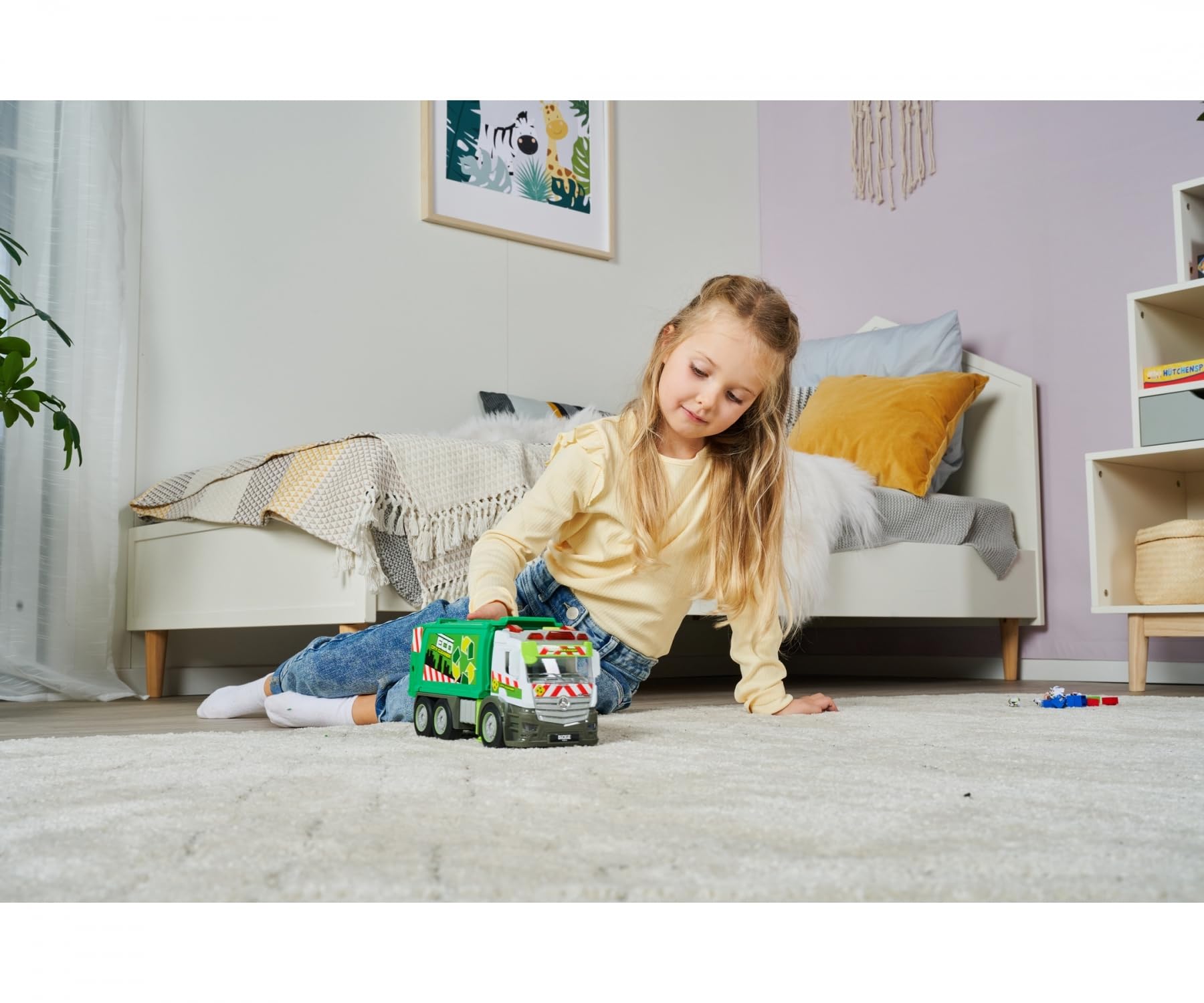 - Mercedes LKW – Das Spielzeug-Müllauto ist dem Original von Mercedes nachempfunden und besitzt eine offizielle Lizenz. Durch den Friktionsantrieb fährt der Truck nach schwungvollem Anschieben auch wenige Meter von selbst.
