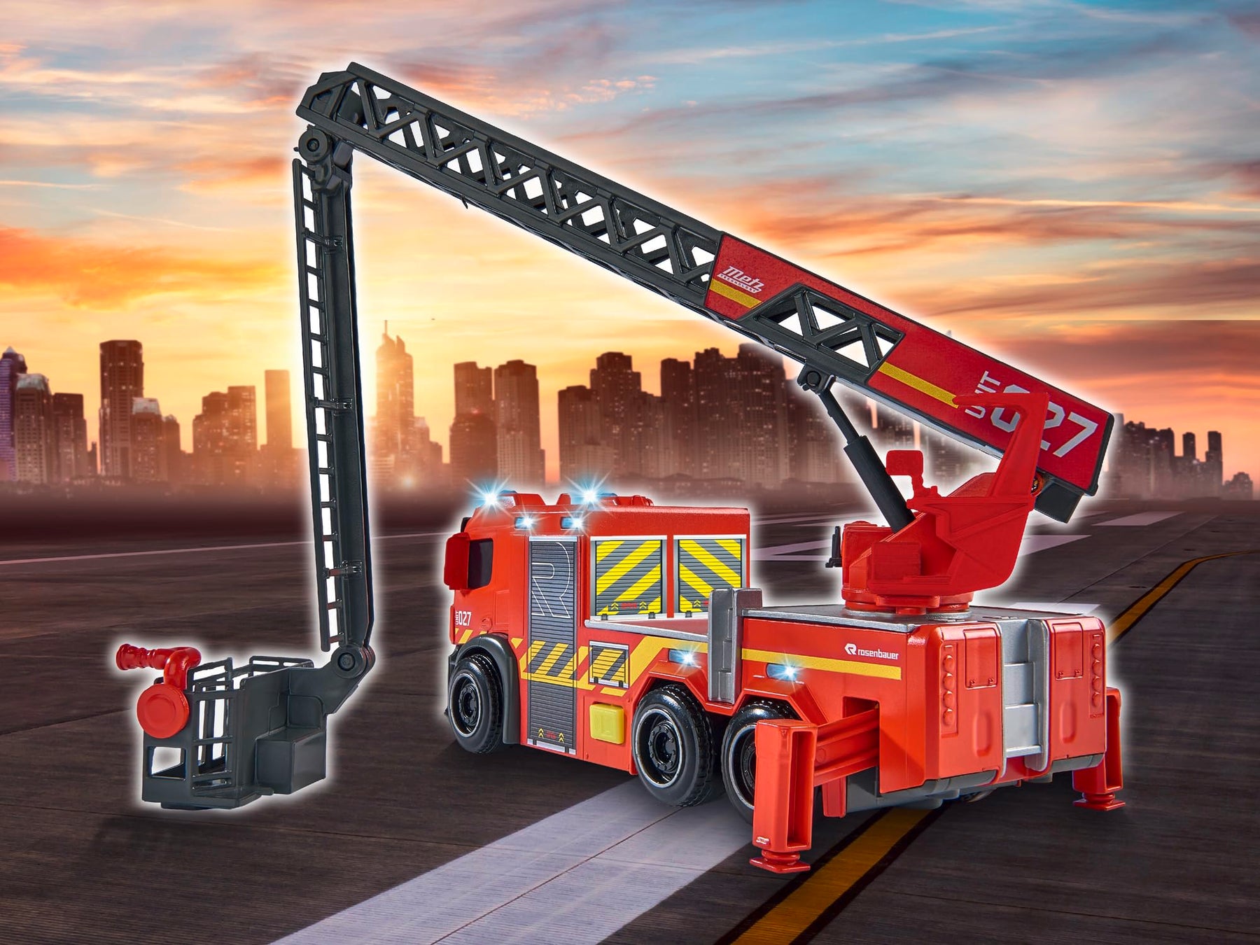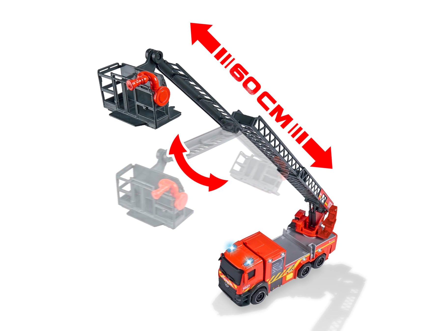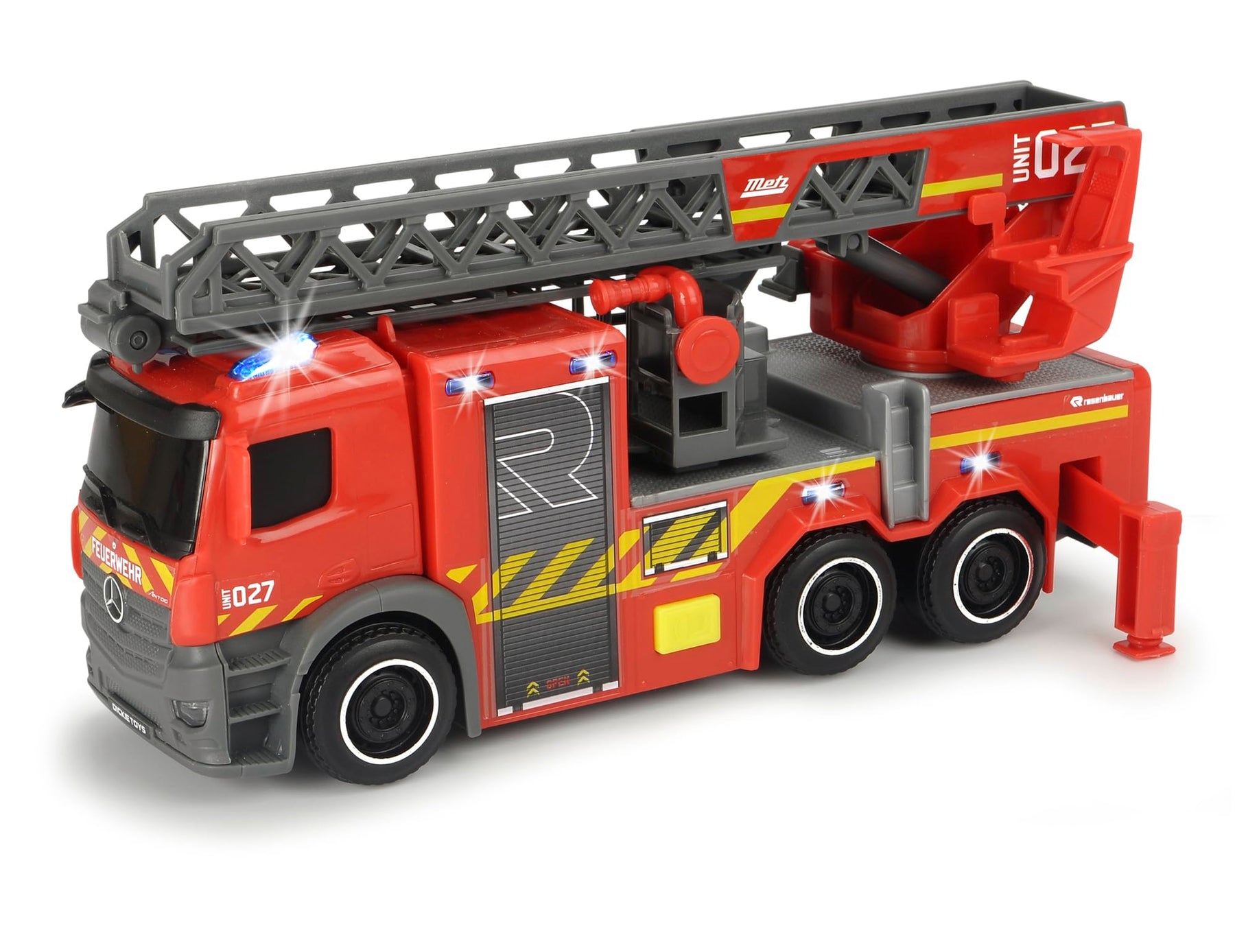 Die Dickie Toys Feuerwehr mit Drehleiter vereint gleich mehrere große Vorbilder in ihrer detailverliebten Gestaltung. Die Kabine entspricht der Gestaltung typischer Trucks von Mercedes Benz, die Vorlage für die Optik liefert Rosenbauer. Zum eindrucksvollen Spielzeugtruck mit Freilauf, Licht und Sound gehören eine schwenk- und ausziehbare Drehleiter sowie ausziehbare Standbeine. Dank beigelegter Batterien können Kinder ab drei Jahren sofort in den Einsatz starten.