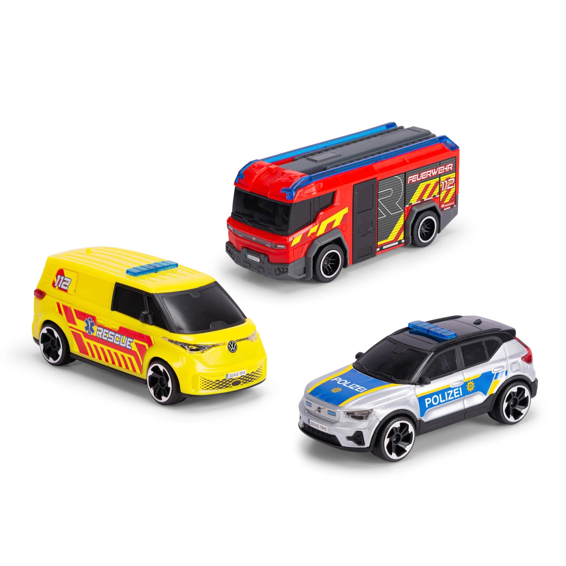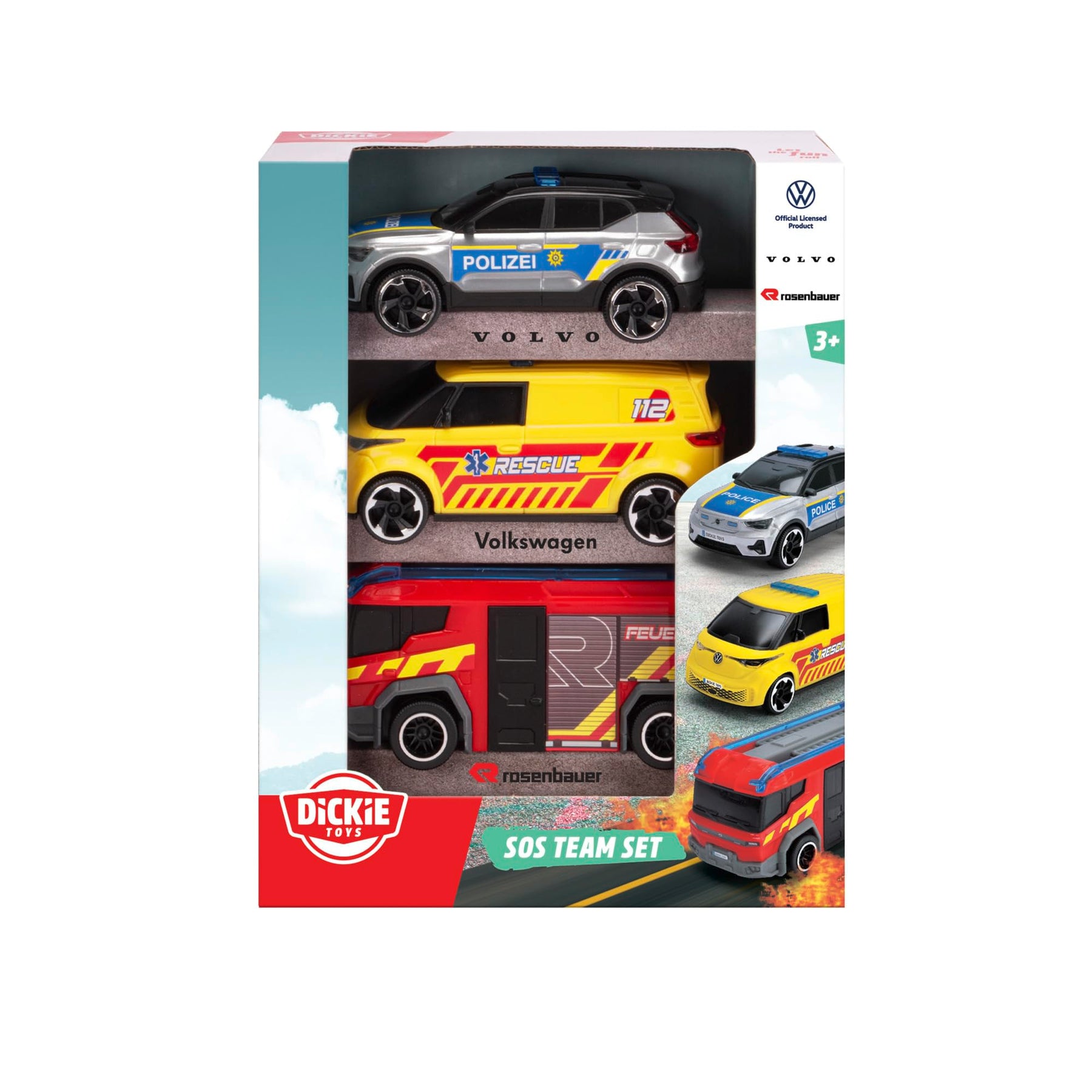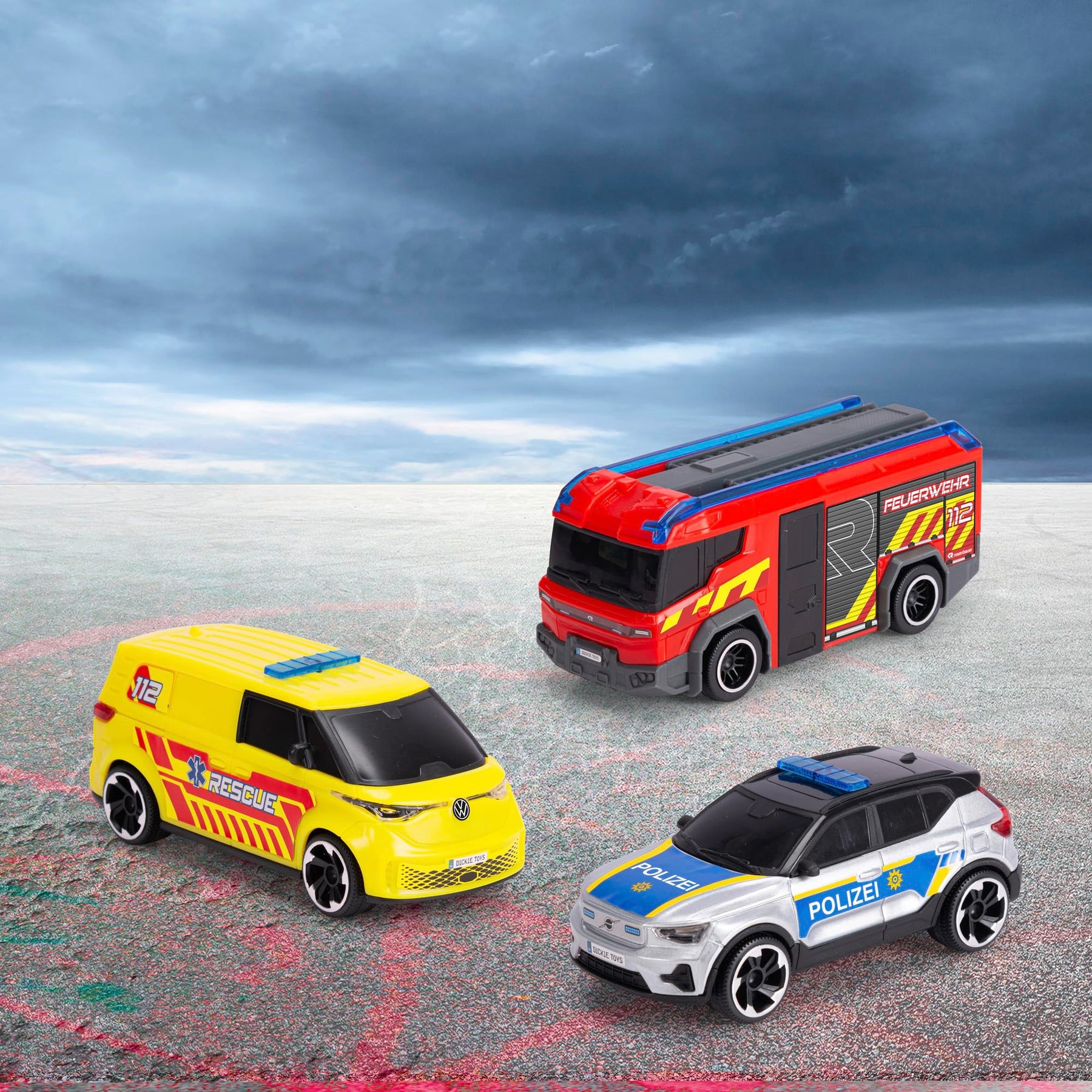 Die Helden des Alltags als Spielzeugauto-Set Mit dem Dickie Toys SOS-Team sind die beliebtesten Rettungs-Fahrzeuge der Kids im Kinderzimmer vertreten: Feuerwehrauto, Polizeiauto & Krankenwagen. Mit einer kompakten Größe von je 15cm sind die hochwertigen Modellautos perfekt für kleine Hände ab 3 Jahren geeignet und werden per Freilauf-Funktion einfach über den Boden geschoben – bereit für unzählige Rettungs-Abenteuer! Echte Fahrzeug-Modelle im kleinen Format Jedes Auto des 3er Sets ist eine Nachbildung eines realen Fahrzeug-Modells – mit offizieller Lizenz der Original-Automarken und angepasst an die Bedürfnisse der Kinder. Der VW ID. Buzz Rettungswagen fährt im gelben 112-Rescue-Look vor, der Rosenbauer Penta Feuerwehrwagen im klassisch roten Feuerwehr-Design und der Volvo EX40 Polizeiwagen beeindruckt mit deutscher Polizei-Optik in Silber-Blau. Ob als Auto-Set zum Geburtstag oder als einzelne Geschenke zwischendurch: Mit diesen detaillierten Kinderautos schlüpfen die Mädchen und Jungen in die Rolle mutiger Rettungskräfte und erleben packende Einsätze voller Action und Fantasie. Ein Qualitäts-Spielzeug von Dickie Toys Als Unternehmen mit über 50 Jahren Branchenerfahrung wissen wir, wie wir Kinder verschiedenster Altersgruppen begeistern und zum Spielen animieren. Schon die Kleinsten beginnen sehr früh damit die zahlreichen Spielfunktionen zu entdecken und zu testen. Dickie Toys schult so die motorischen Fähigkeiten und geht zudem erste Schritte in Richtung Verkehrserziehung. Ob im Kinderzimmer oder draußen im Freien, mit Dickie Toys ist der Spielspaß absolut garantiert.