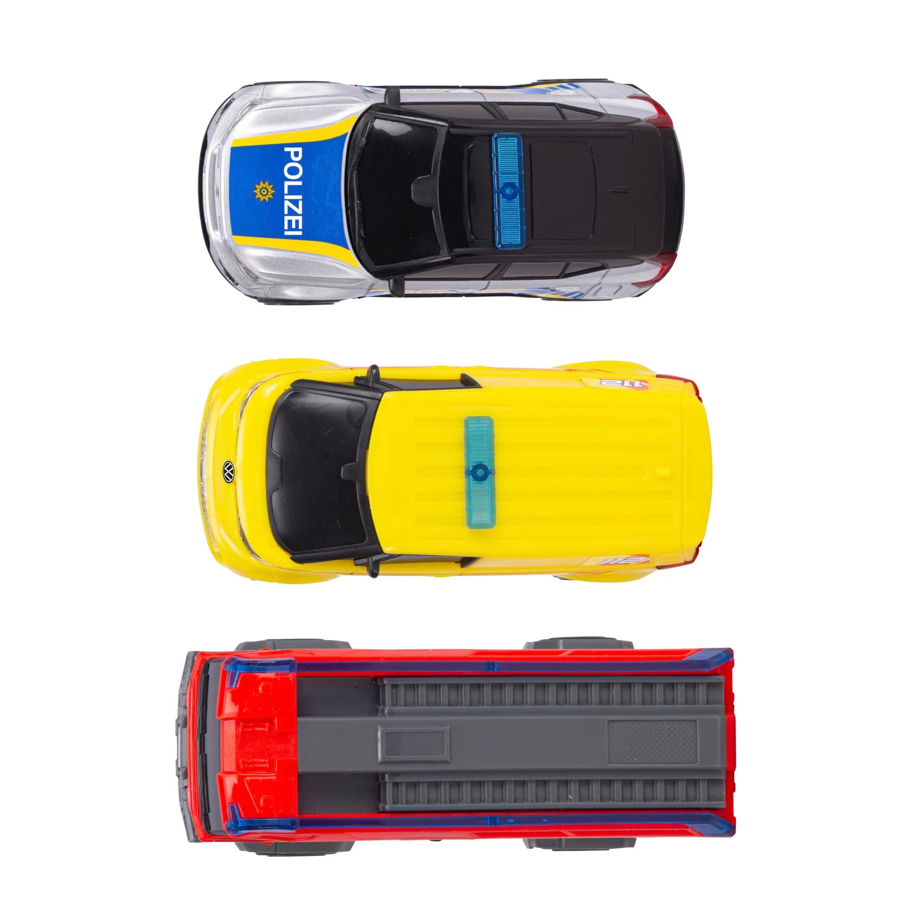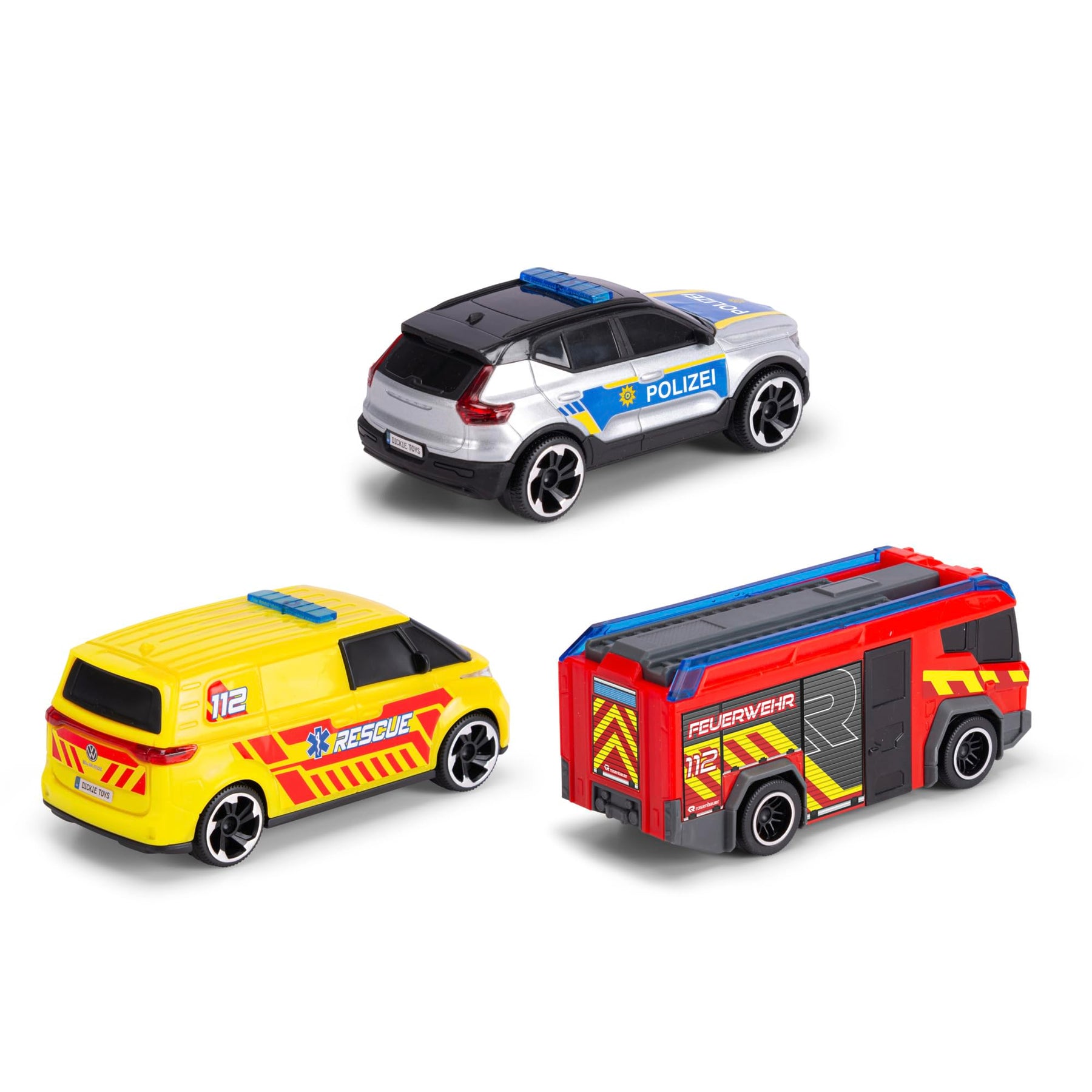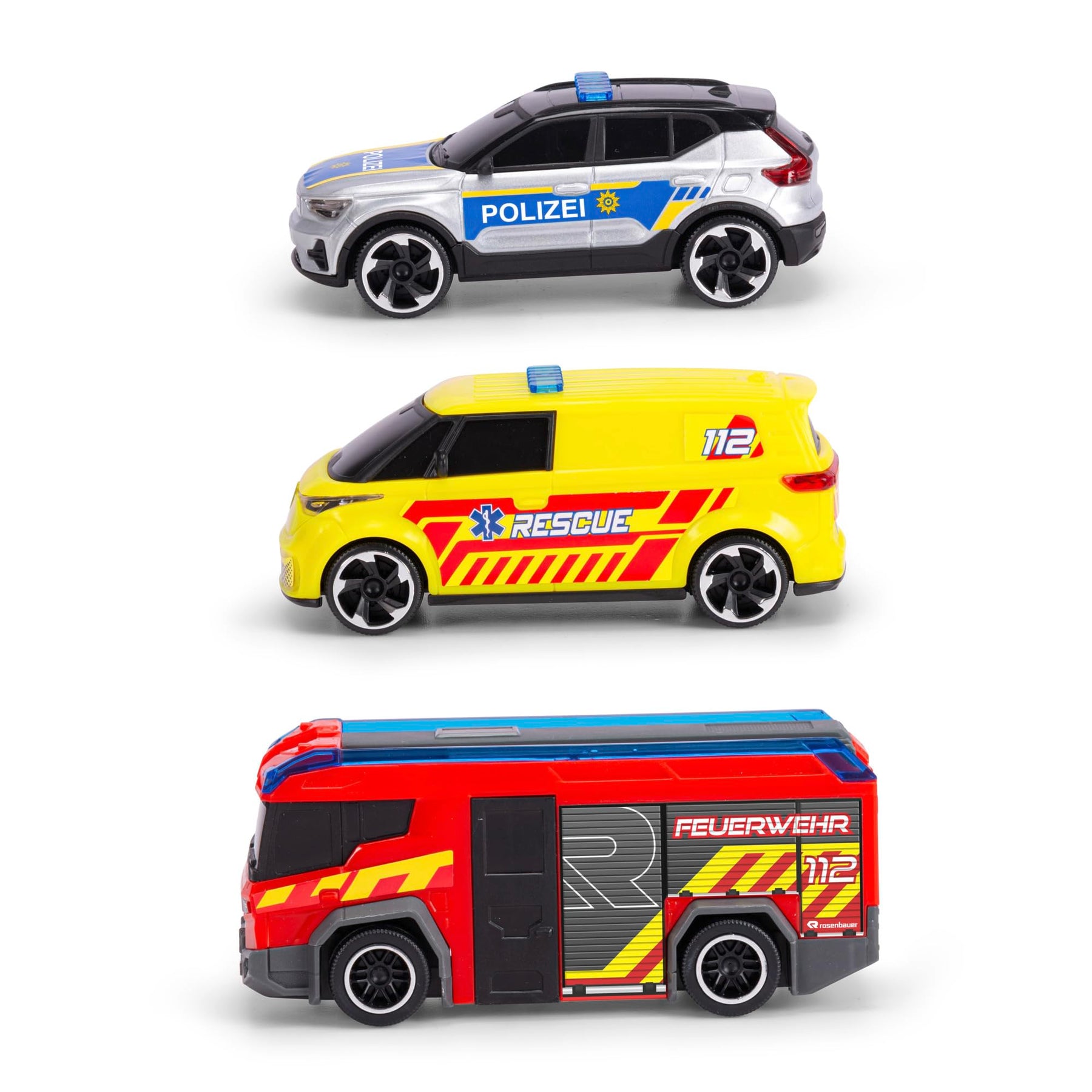 Die Helden des Alltags als Spielzeugauto-Set Mit dem Dickie Toys SOS-Team sind die beliebtesten Rettungs-Fahrzeuge der Kids im Kinderzimmer vertreten: Feuerwehrauto, Polizeiauto & Krankenwagen. Mit einer kompakten Größe von je 15cm sind die hochwertigen Modellautos perfekt für kleine Hände ab 3 Jahren geeignet und werden per Freilauf-Funktion einfach über den Boden geschoben – bereit für unzählige Rettungs-Abenteuer! Echte Fahrzeug-Modelle im kleinen Format Jedes Auto des 3er Sets ist eine Nachbildung eines realen Fahrzeug-Modells – mit offizieller Lizenz der Original-Automarken und angepasst an die Bedürfnisse der Kinder. Der VW ID. Buzz Rettungswagen fährt im gelben 112-Rescue-Look vor, der Rosenbauer Penta Feuerwehrwagen im klassisch roten Feuerwehr-Design und der Volvo EX40 Polizeiwagen beeindruckt mit deutscher Polizei-Optik in Silber-Blau. Ob als Auto-Set zum Geburtstag oder als einzelne Geschenke zwischendurch: Mit diesen detaillierten Kinderautos schlüpfen die Mädchen und Jungen in die Rolle mutiger Rettungskräfte und erleben packende Einsätze voller Action und Fantasie. Ein Qualitäts-Spielzeug von Dickie Toys Als Unternehmen mit über 50 Jahren Branchenerfahrung wissen wir, wie wir Kinder verschiedenster Altersgruppen begeistern und zum Spielen animieren. Schon die Kleinsten beginnen sehr früh damit die zahlreichen Spielfunktionen zu entdecken und zu testen. Dickie Toys schult so die motorischen Fähigkeiten und geht zudem erste Schritte in Richtung Verkehrserziehung. Ob im Kinderzimmer oder draußen im Freien, mit Dickie Toys ist der Spielspaß absolut garantiert.