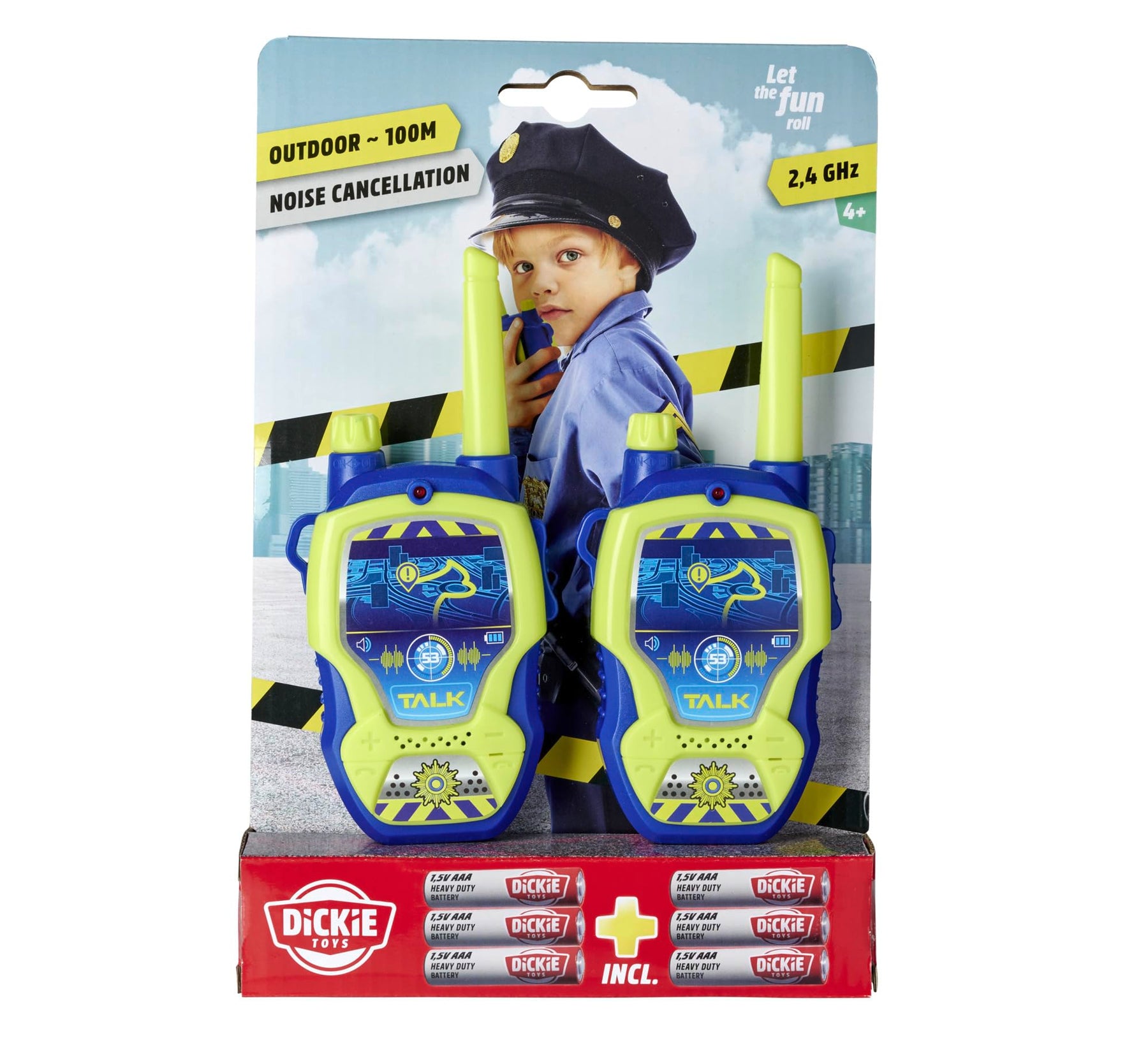 Dickie Toys – Walkie Talkie im Polizei-Design – 2 Funkgeräte, speziell für Kinder ab 4 Jahren entwickelt, bis zu 100 m Reichweite, Spielzeug-Funkgeräte bla/gelb
