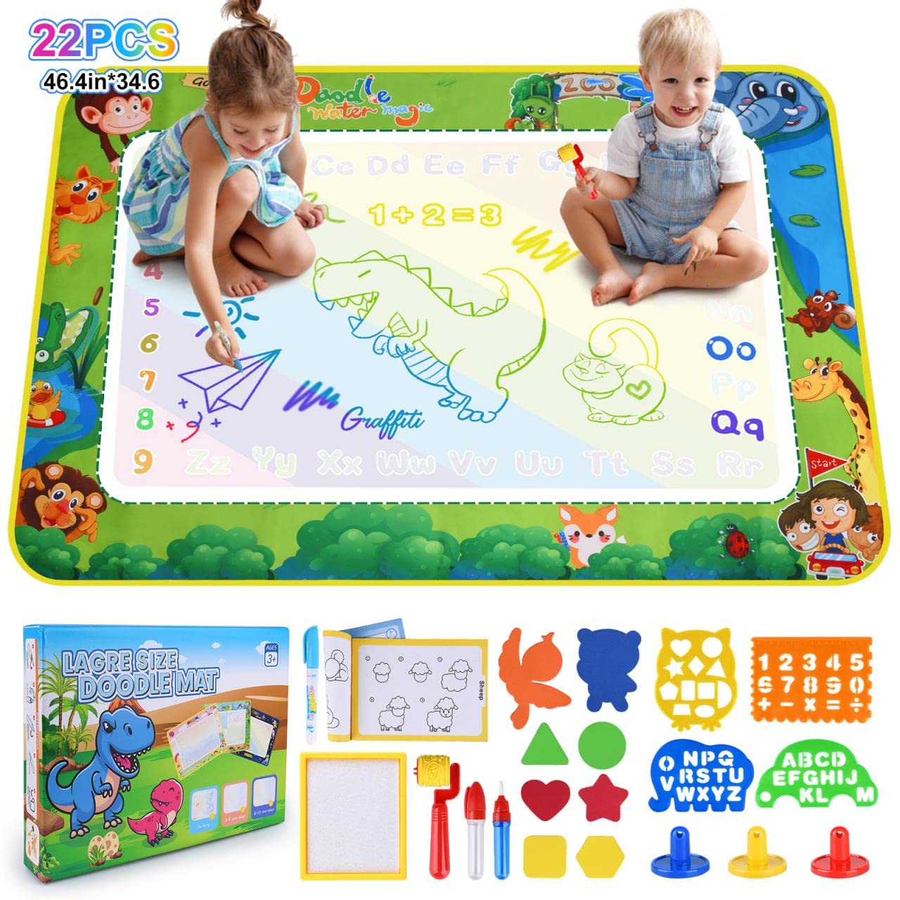 - 🌈【Zeichnungsspielzeug Komplettes Kit】Diese schöne spielmatte wird mit 3 wassermagiestiften,8 EVA-zeichenformen,3 stempeln,1 stempelrolle,4 PP-schablone,1 wasserabsorbierendes brett und 1 zeichenheft.Die doodle matte ist breit genug,damit 3-5 kinder gleichzeitig malen und kritzeln können.Es wird keine farbe benötigt,keine tinte.So haftet kein farbpigment mehr an kinderkleidung,fußböden oder sogar wänden.