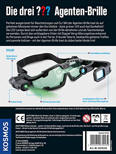 Inhalt: Agentenbrille mit grüner LED in abnehmbarer Lampe, zwei vorklappbare Vergrößerungslinsen, elastisches Kopfband und illustriertes Faltblatt