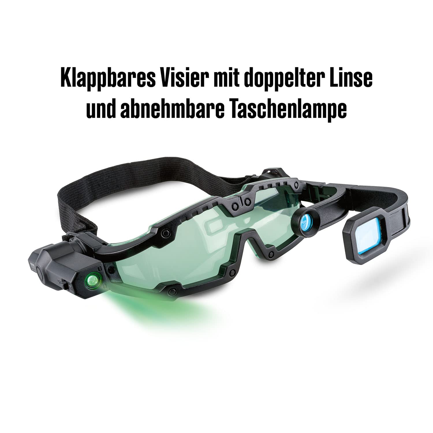 Mit den beiden vorklappbaren Vergrößerungslinsen werden kleinste Spuren sichtbar. Die abnehmbare Lampe mit grünem LED-Strahler lässt sich mit einem Klick am Brillenbügel befestigen. Mit einem elastischen Band verwandelt sie sich in eine Stirnlampe. Jetzt noch die Batterien einstecken und versteckte Sachen im Dunkeln entdecken, fast wie mit einem Nachtsichtgerät oder einer Nachtsichtbrille.