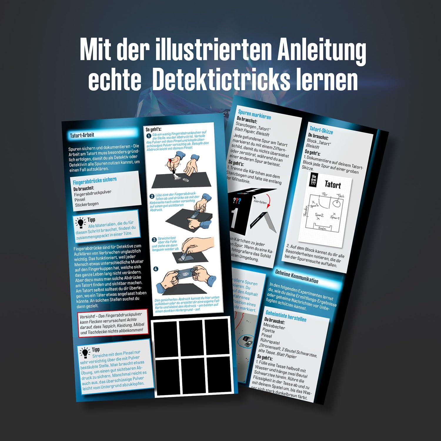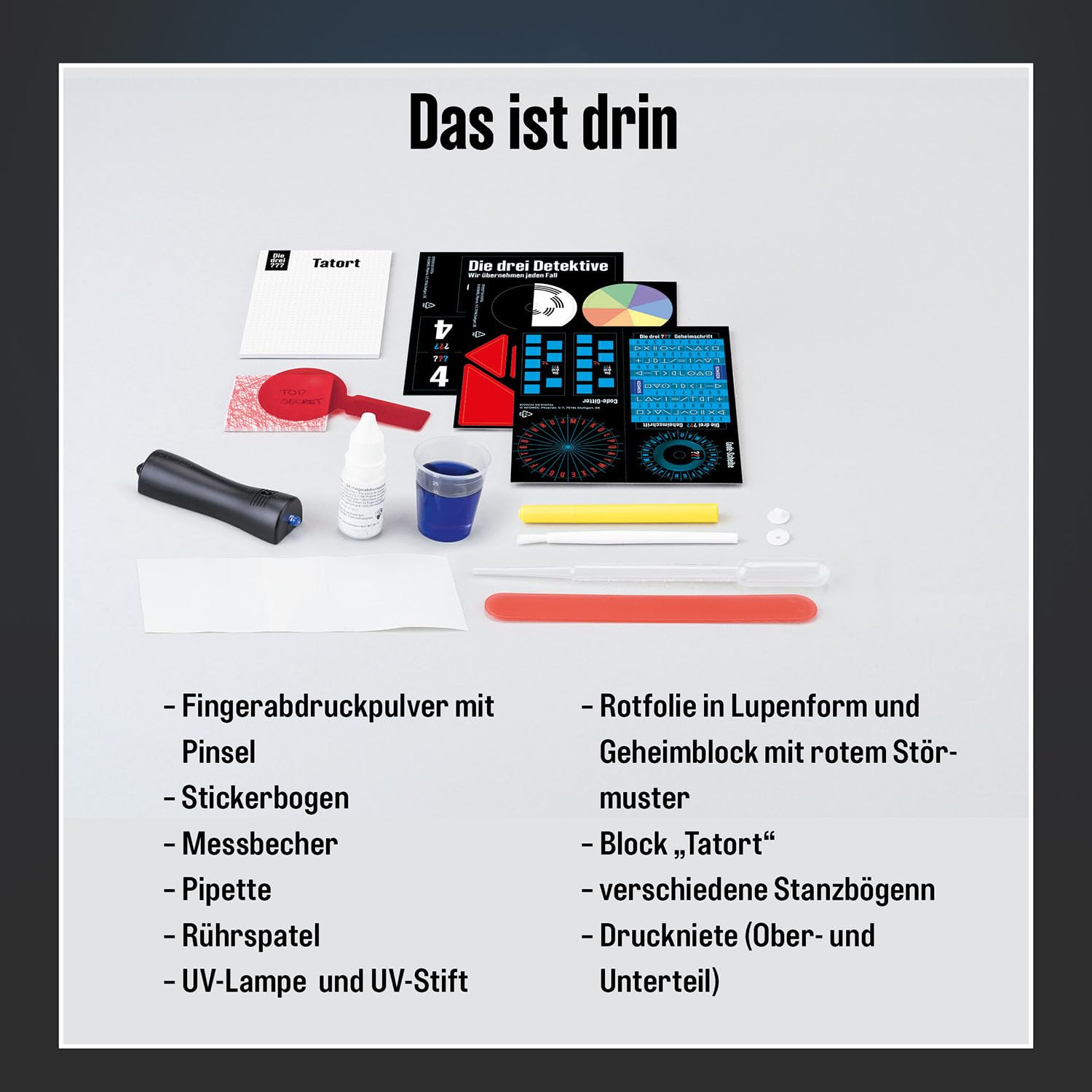 Mit der Detektiv-Ausrüstung rätselhafte Fälle lösen wie Justus, Peter und Bob! Nachwuchs-Detektive und Kino-Fans brauchen das richtige Werkzeug, um knifflige Kriminalfälle zu lösen, Beweise zu sichern, Fingerabdrücke sichtbar zu machen und geheime Botschaften zu entschlüsseln. Mit der UV-Lampe bleibt am Tatort nichts mehr verborgen. Wertvolle Tipps und Detektiv-Wissen gibt es in der Anleitung. Mit dem Grundausstattungs-Set für Einsteiger machen Kinder den ersten Schritt zum Profi-Ermittler um das Rätsel um den verschwundenen Karpatenhund lösen zu können!