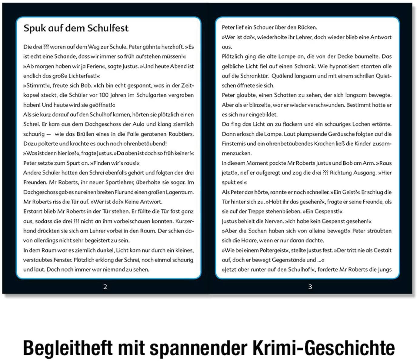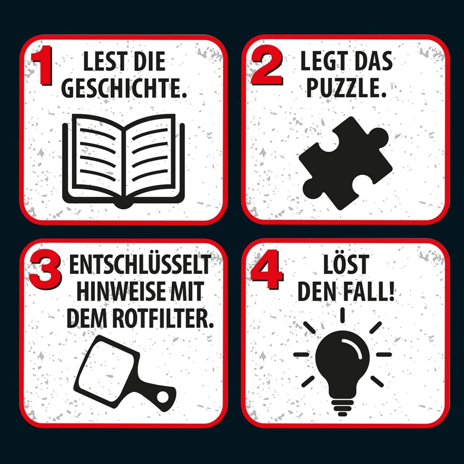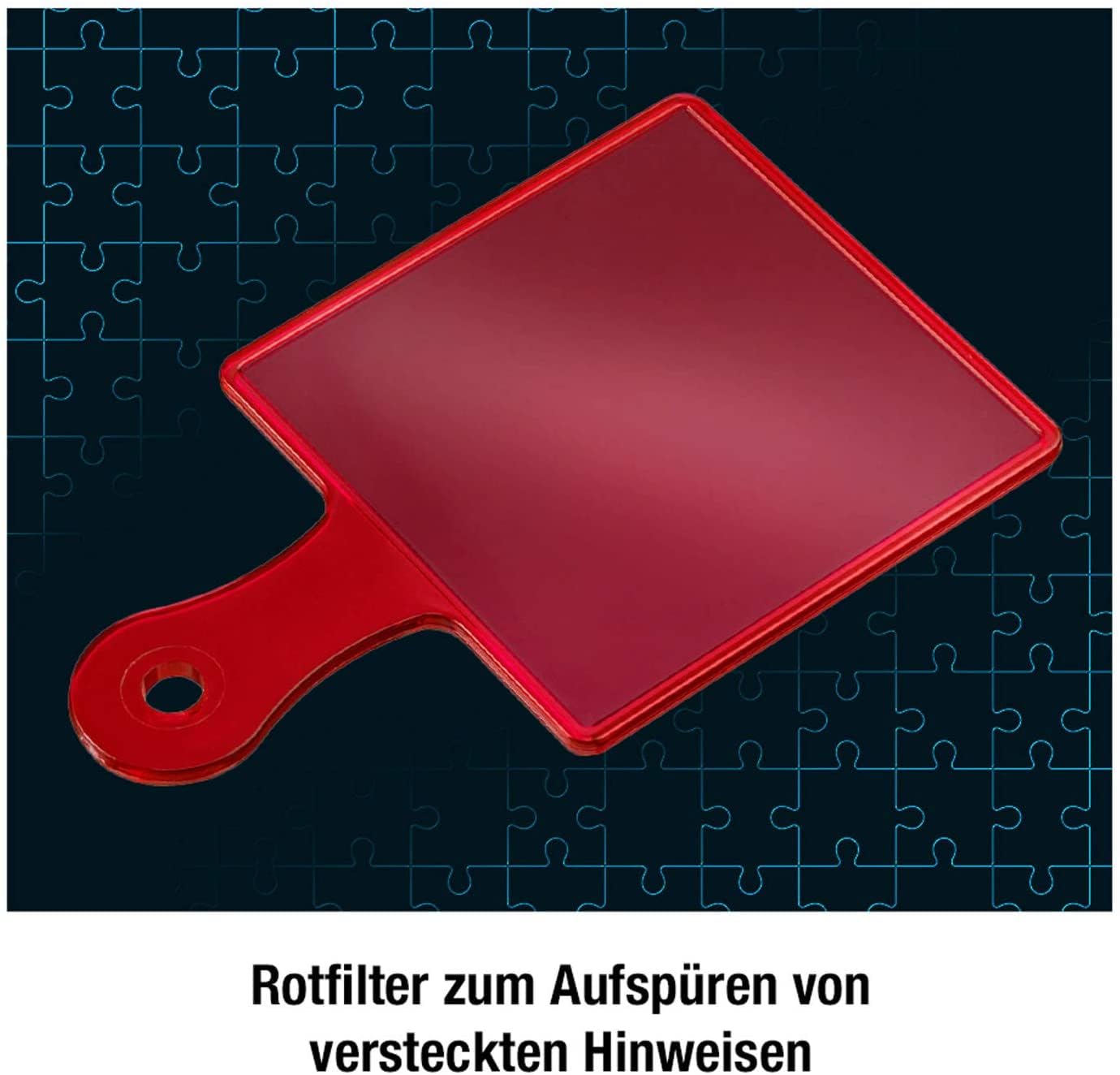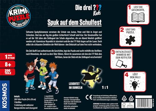 Kriminalfall Lesen, Leuchtpuzzle legen, Fall lösen Für alle Rätsel- und Puzzle-Fans! Diesmal haben es die drei??? Kids mit einem höchst mysteriösen Fall zu tun und brauchen die Hilfe der Spieler. Nachdem diese die spannende Geschichte gelesen haben legen sie das Puzzle – Stück für Stück entsteht so vor ihren Augen der Tatort, an dem es nur so von Hinweisen wimmelt. Geniales Extra: das Puzzle leuchtet im Dunkeln und manche Indizien sind nur mit beiliegendem Rotfilter zu entschlüsseln! .