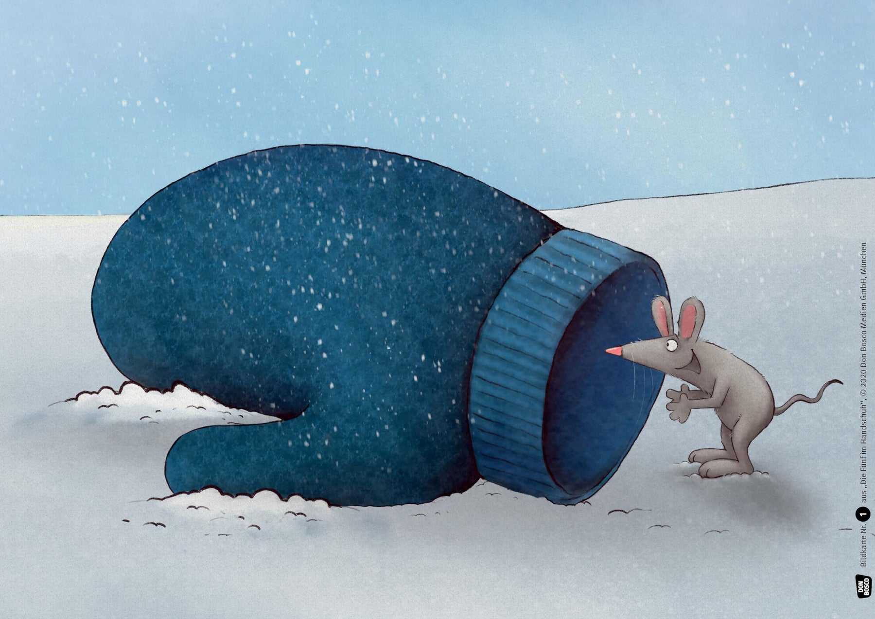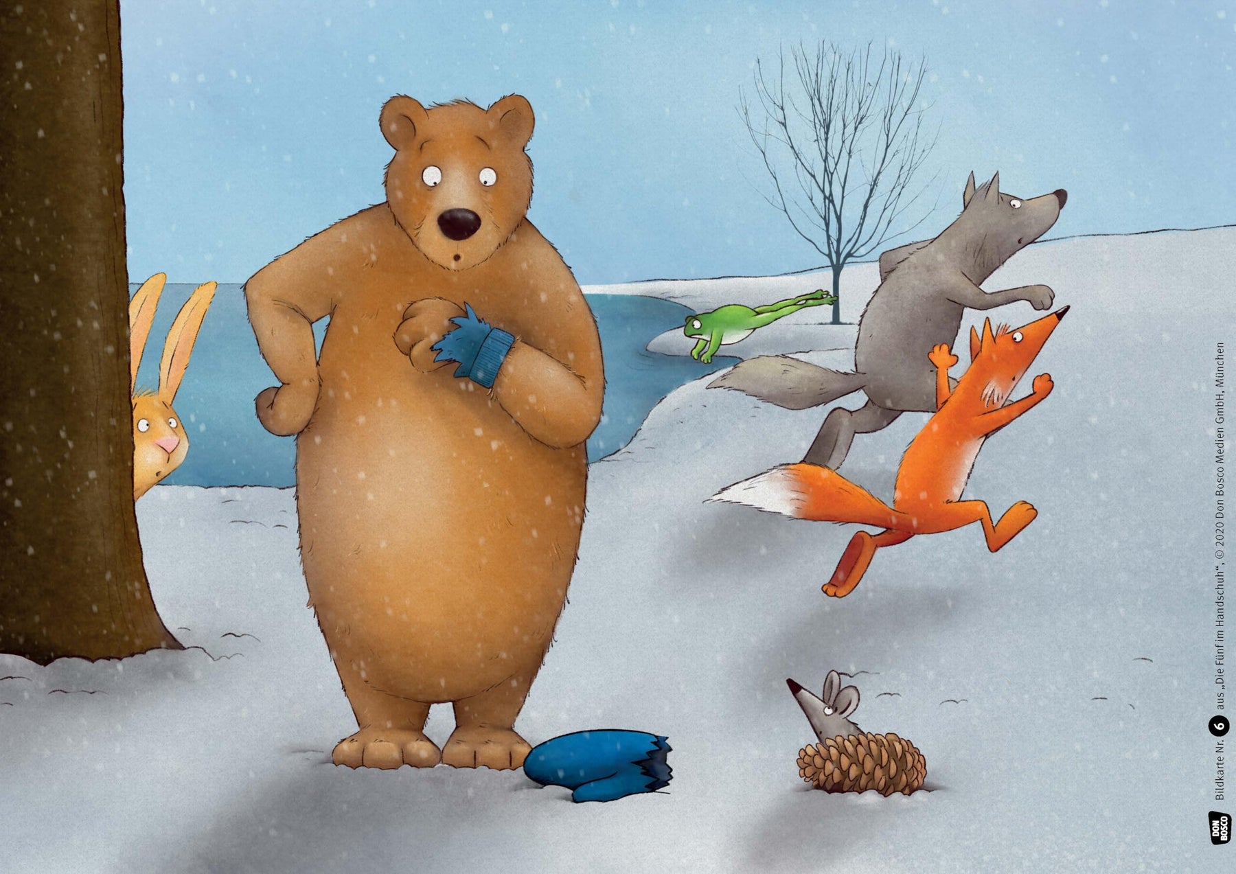 Fünf Finger hat der Handschuh – und jeder davon bietet einem anderen Tier Unterschlupf. Zuerst krabbelt ein Mäuschen hinein und freut sich über das neue warme Zuhause. Dann hüpft ein Frosch vorbei und schlüpft zum Mäuschen. Auch der Hase, der Fuchs und der Wolf haben noch Platz und die Fünf machen es sich gemeinsam gemütlich … Wie gut, dass der Bauer den Handschuh an einem kalten Wintertag verloren hat!