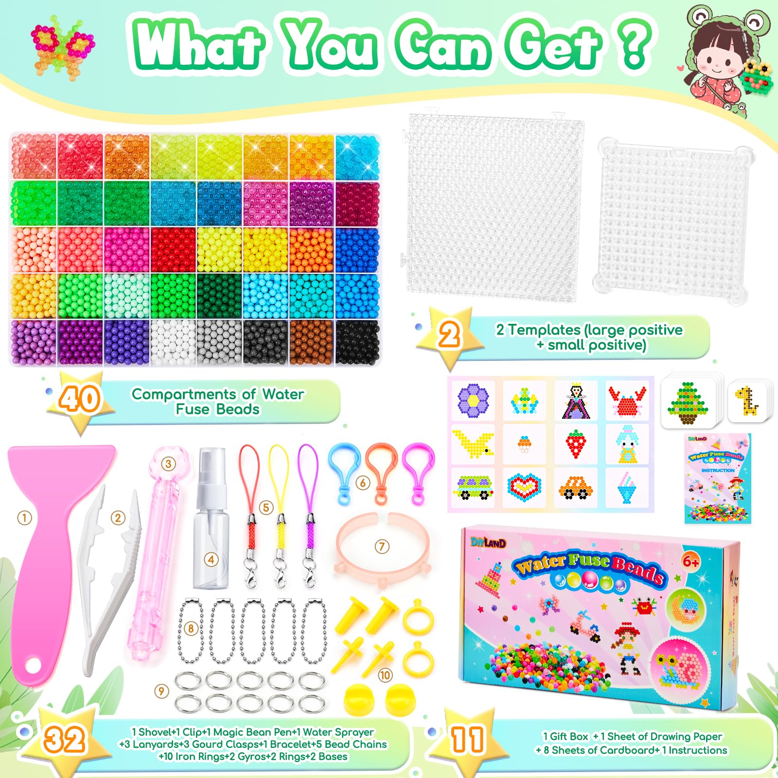 - WASSERNEBEL-PERLEN-SET SERIE: Unser Wassernebel Perlen Set enthält Wassernebel Perlen in einer Box mit 40 Fächern, mehr als 100 Perlen in jedem Fach, insgesamt mehr als 5,200 Perlen, 1 Wasserzerstäuber, 1 Spachtel, 2 Schablonen (großes Positiv + kleines Positiv), 3 Kürbisverschlüsse, 3 Schlüsselbänder, 5 Perlenarmbänder, 1 Clip, 2 Ringe, 2 Sockel, 2 Kreisel, 1 Armband, 10 Reifen, 1 Zauberbohnenstift, 8 Blatt Karton, 1 Blatt Millimeterpapier, 1 Farbkasten und ein Anleitungsblatt
