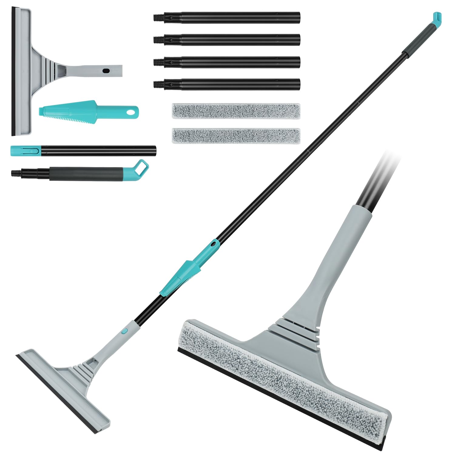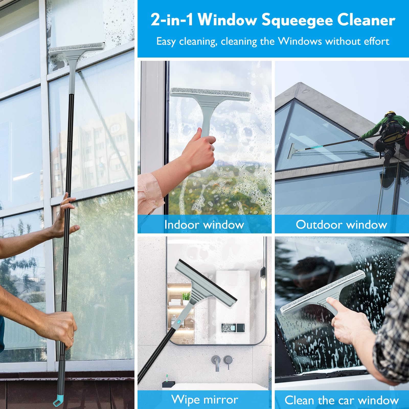 - ✅【2-in-1-Fensterputzer mit Teleskopstiel】 Mikrofaserpad entfernt Schaum und Seifenwasser mit Leichtigkeit, während der Silikonabstreifer das Wasser schnell und streifenfrei abtrocknet.