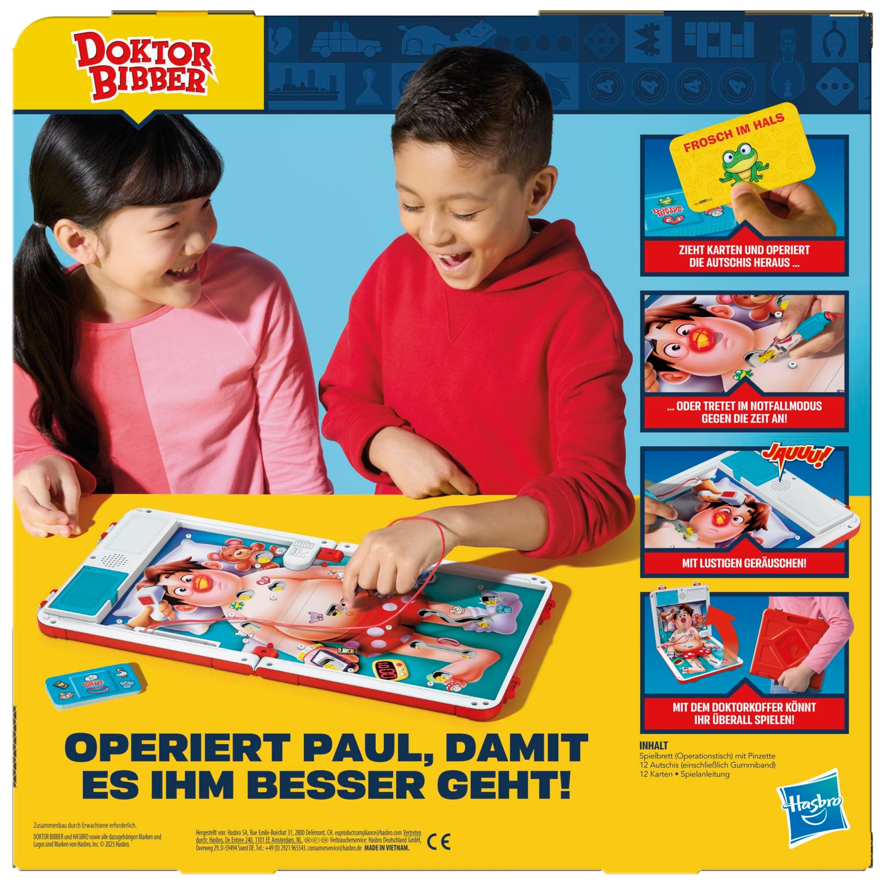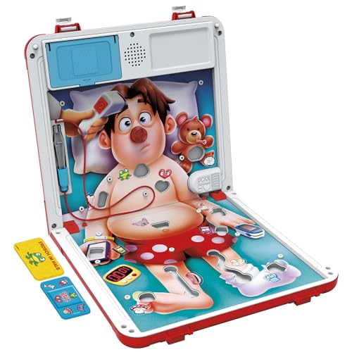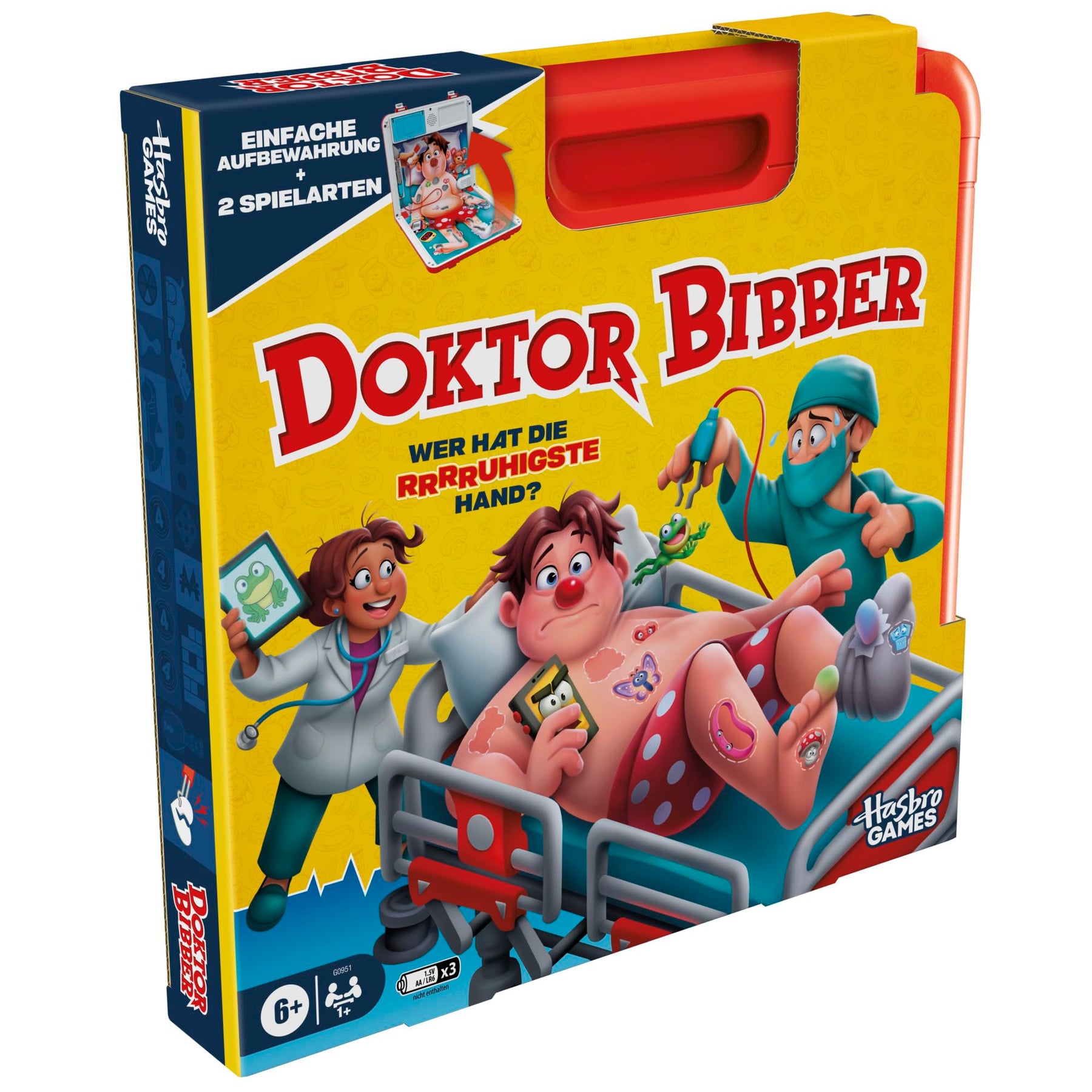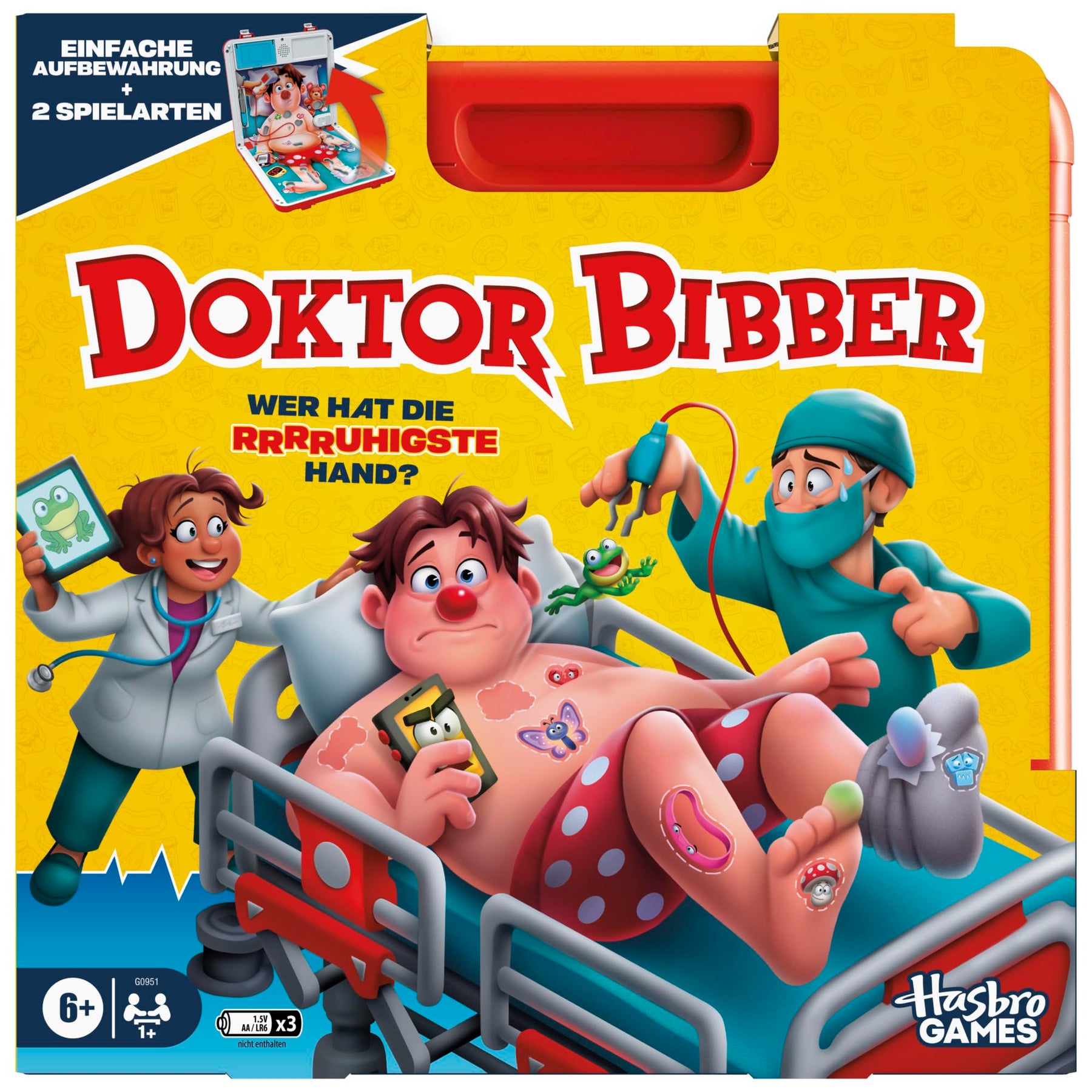 Wer hat die rrrruhigste Hand? Hier kommt das beliebte Kinderspiel mit spannenden Neuerungen! Bei dieser Edition von Doktor Bibber wählen die Spieler aus 2 Spielarten aus: Der Krankenhausmodus bietet das klassische, beliebte Spielprinzip und der Notfallmodus sorgt für noch mehr Nervenkitzel. Im Krankenhausmodus ziehen die kleinen Ärzte Pflasterkarten für die verrücktesten Wehwehchen. Wenn sie versuchen, mit ruhiger Hand Patient Paul zu operieren, steigt die Spannung. Nur zitterfrei kann es gelingen, Patient Paul zu operieren oder seine Nase leuchtet auf und Alarmgeräusche erklingen! Im Notfallmodus gilt es, so viele Autschis wie möglich herauszuoperieren, bevor die Zeit abläuft. Doch aufgepasst! Wenn ein Spieler mit der Pinzette die Seite berührt, reagiert Paul mit lustigen Geräuschen. Er rülpst, jault und bringt so die Kinder zum Lachen. In beiden Modi gilt: Wem es gelingt, die meisten Autschis zu entfernen und den Patienten zu „heilen“, der gewinnt! Dieses unterhaltsame Vorschulspiel kommt in einer praktischen Tragebox mit Aufbewahrungsfach und ist somit ein tolles Reisespiel für Kinder, um immer und überall damit Spaß zu haben. Operation und Hasbro sowie alle dazugehörigen Marken und Logos sind Marken von Hasbro, Inc.