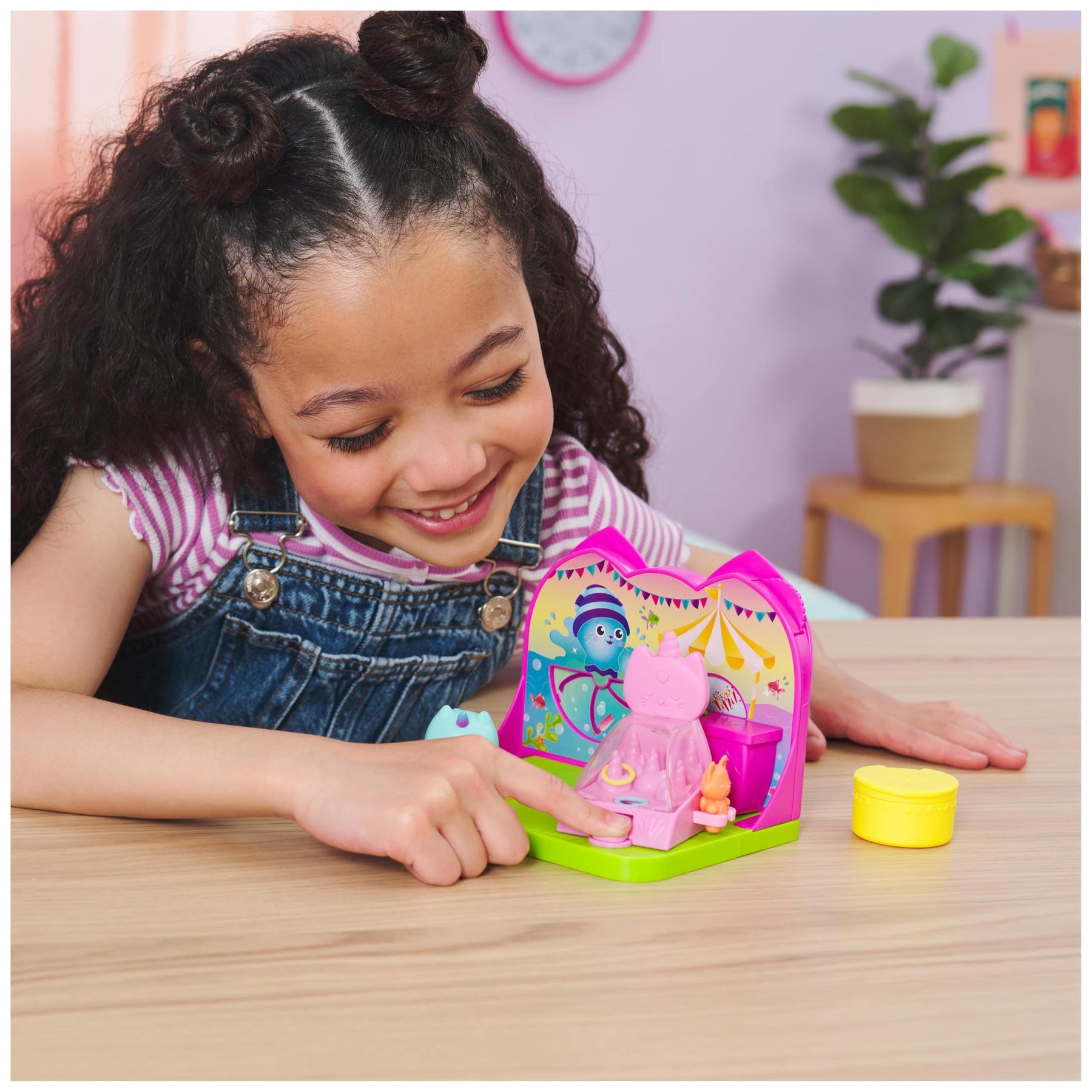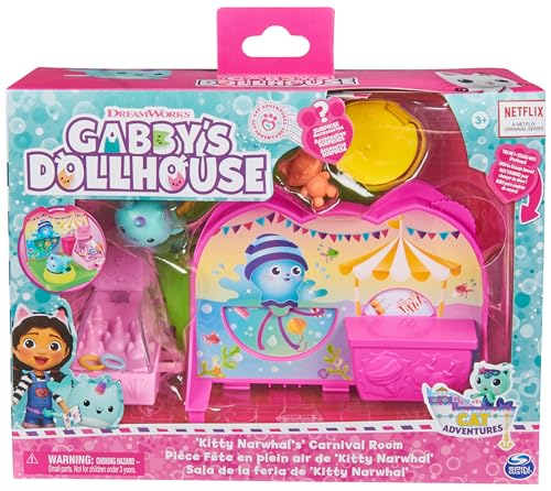 Die DreamWorks Gabby's Dollhouse Spielzeuge von Spin Master lassen Vorschulkinder in die katz-tastische Welt der beliebten Animationsserie Gabby's Dollhouse eintauchen. Mit dem detailgetreuen Deluxe Room Fest-Raum mit Kätzchen Narwal (engl. Kitty Narwhale) Katzen Figur können die magischen Abenteuer der Serie authentisch nachgespielt werden. Dieser Deluxe Raum steckt voller liebevoller Details und Überraschungen, die es zu entdecken gilt. Dieses Spielset enthält einen katz-tastischen Volksfest-Puppenhausraum und Möbel, die sowohl mit dem Kreuzfahrtschiff als auch in Gabbys Purrfect Puppenhaus verwendet werden können (jeweils separat erhältlich). Im Lieferumfang ist eine niedliche Kätzchen Narwal Spielzeugfigur, sowie ein Bällebad, ein Katzen-Ringwurf-Spiel, eine Snackbar und vieles mehr enthalten. Man kann Kätzchen Narwal in das Bällebad setzen, sein Glück beim Ringwurf-Spiel versuchen, um zu gewinnen, und das Daumenrad drehen, um die Kulisse zu wechseln. In der außerdem enthaltenen Puppenhaus-Lieferung versteckt sich eine kleine Überraschung - ein Karamell-Apfel. Für eine weitere Überraschung kann der QR-Code in der Puppenhaus-Überraschungsbox gescannt werden, um eine besondere Belohnung in der Gabby's Dollhouse App freizuschalten (verfügbar für iOS und Android). Gabby's Dollhouse-Spielzeug ist das ideale Geschenk für Kinder, die Fans der beliebten Netflix-Serie sind und gerne Puppenhauswelten nachbauen. Mit einer Auswahl aus liebenswerten Katzenfiguren, Zubehörteilen und Puppenhausmöbeln können Kinder ab 3 Jahren ihre ganz eigene Gabby's Dollouse Welt zuhause lebendig werden lassen. Von Spin Master gibt es viele weitere Gabby's Dollhouse Spielzeuge, wie das Partyzimmer Spielset, das das Puppenhaus mit einem Skate-Park um ein Dachgeschoss erweitert oder weitere niedliche Deluxe Räume (alles separat erhältlich), die ebenfalls in das Puppenhaus eingeschoben werden können und die Spielwelt erweitern.