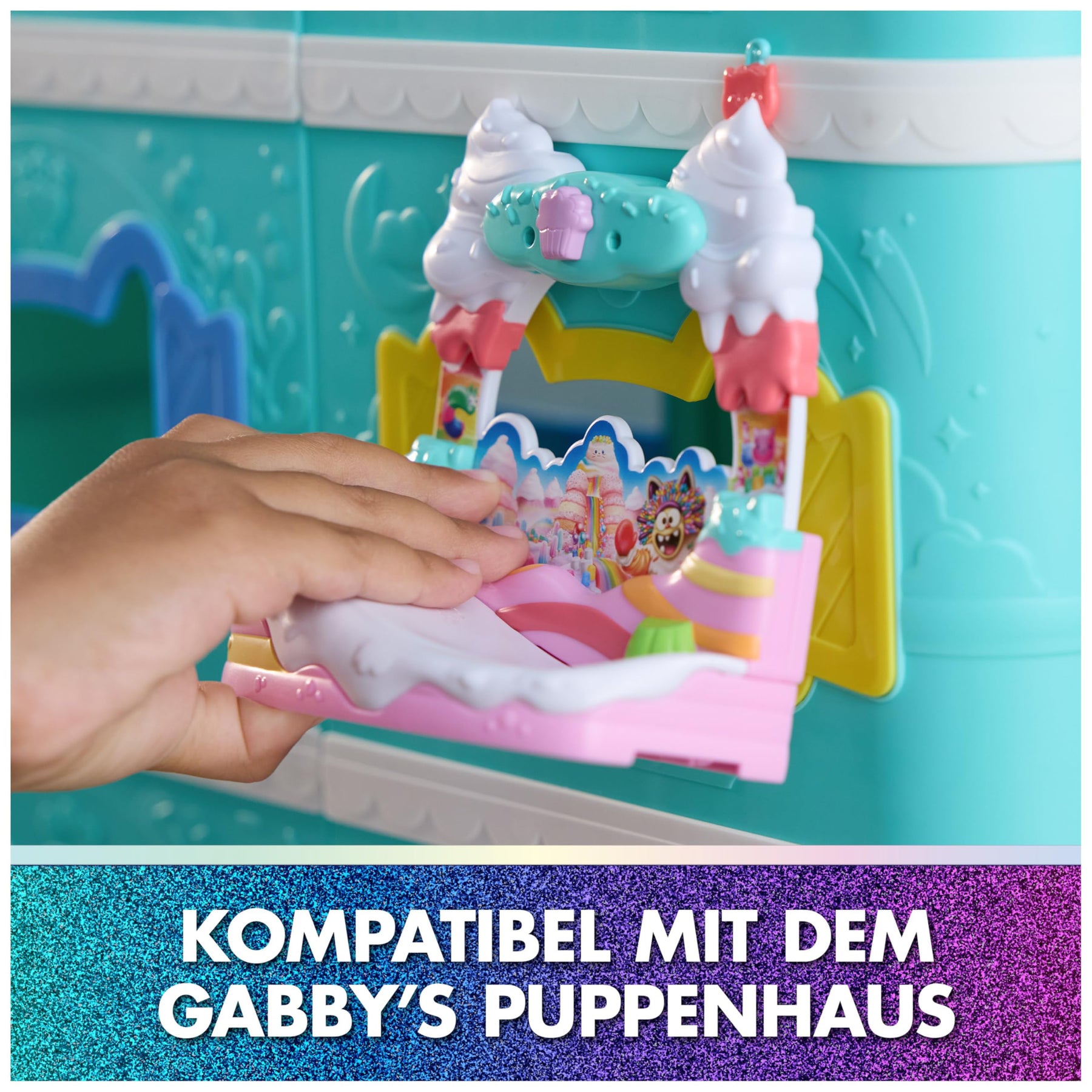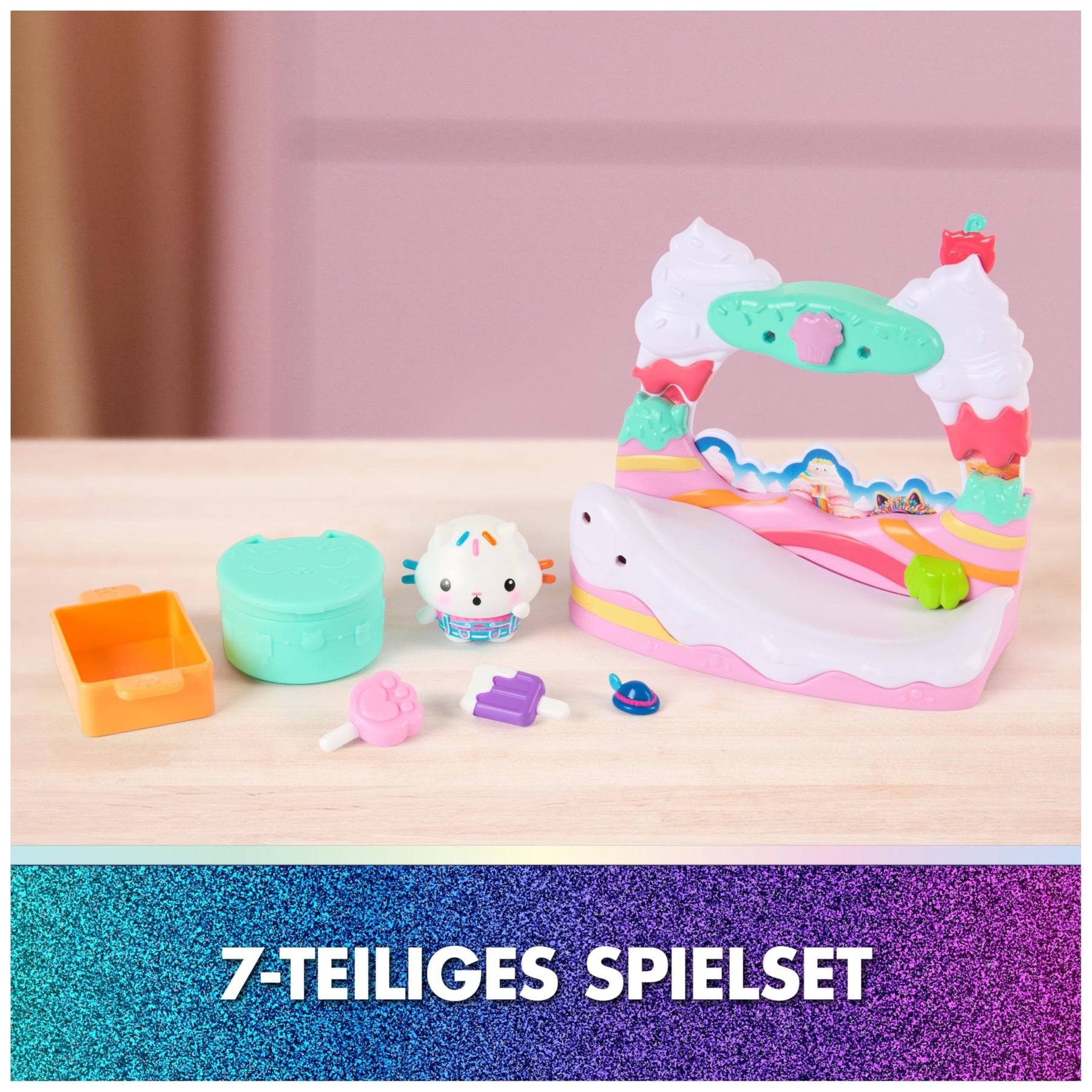 Bereit für ein zuckersüßes Abenteuer? Mit Kuchis süßem Balkon aus Gabby’s Dollhouse: Der Film wird das Spiel noch bunter! Dieses 7-teilige Spielset enthält eine exklusive Kuchi-Figur (EN: Cakey) im Movie-Look, wackelnde Kirschen, eine Rutsche zum Heruntergleiten und liebevoll gestaltetes Zubehör für fantasievolle Rollenspiele. Der Balkon lässt sich an jedes Gabby-Puppenhaus anbringen (separat erhältlich) und erweitert die Spielwelt um ein neues Highlight. Wie im Film können Kinder die Dollhouse Delivery auspacken und eine Überraschung entdecken – inklusive QR-Code für ein digitales Extra in der Gabby’s Dollhouse App. Perfekt zum Nachspielen der Filmszenen oder für eigene katz-tastische Geschichten!