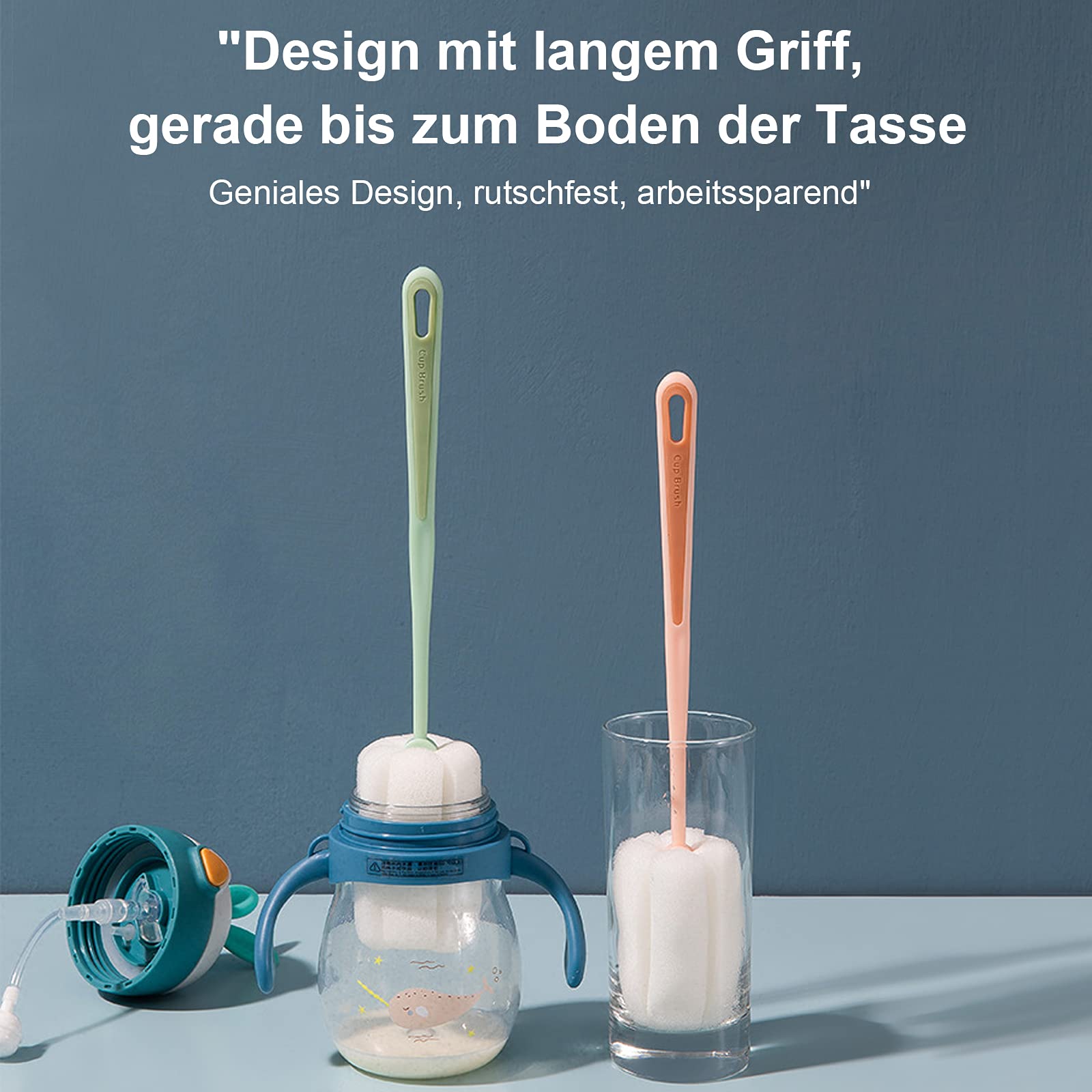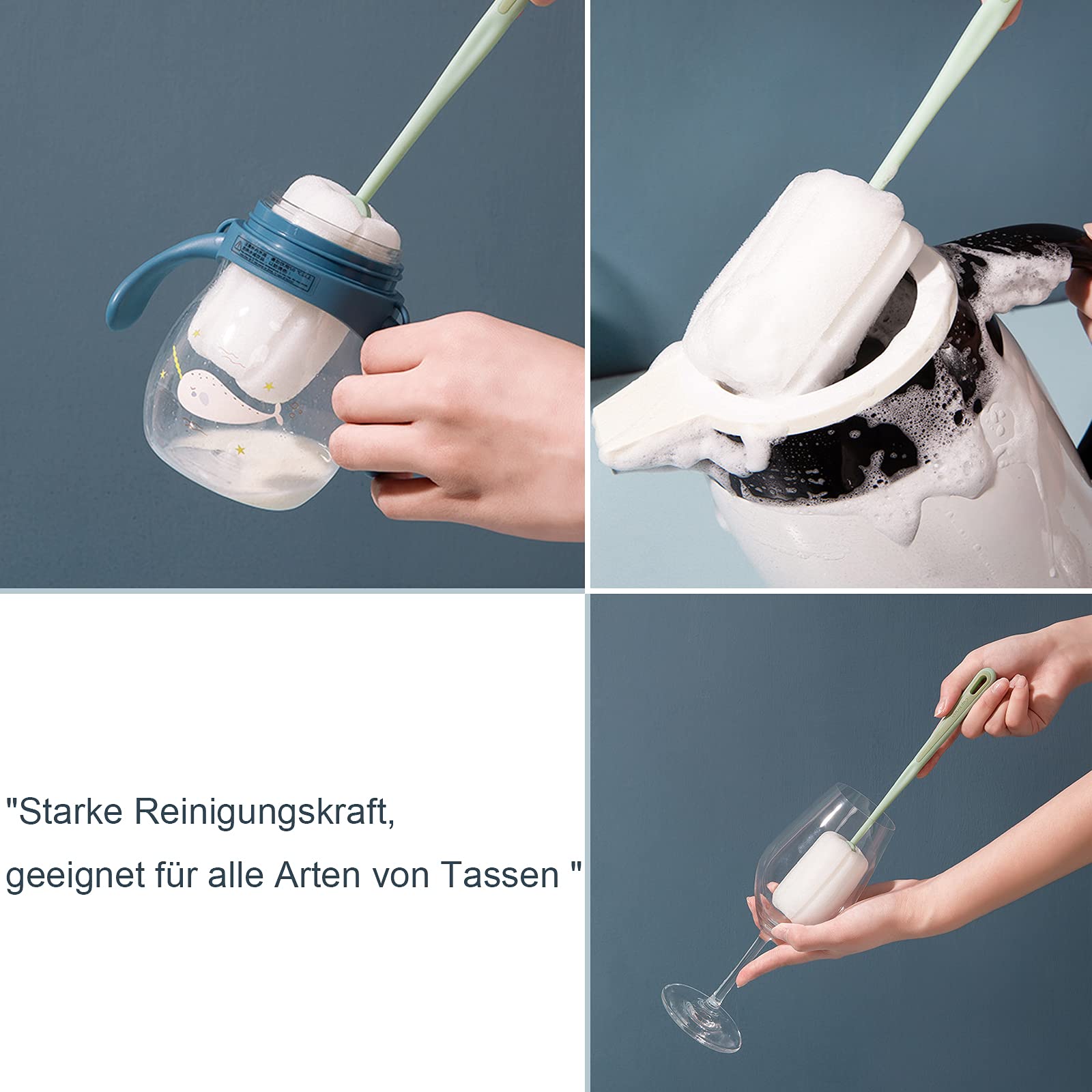 • 360-Grad-Reinigung ohne Sackgassen. Dank der schwammartigen, knospenartigen Hülle und dem 25 cm langen Griff reinigt unser Bürstenkopf alle Tassen, auch Rotweingläser, Tassen, Teetassen, Gläser, Babyflaschen und sogar Kaffeekannen, einfach und schonend. Es ist auch sehr praktisch beim Reinigen von Geschirr, Schüsseln, Messern und Gabeln.