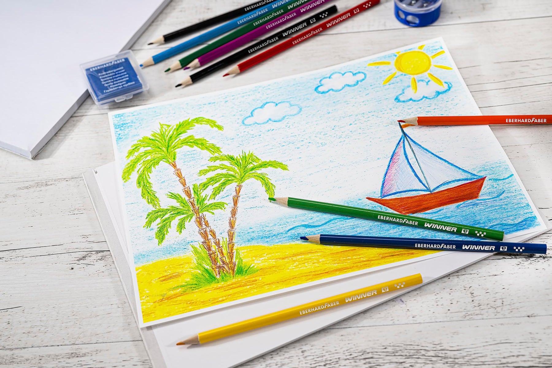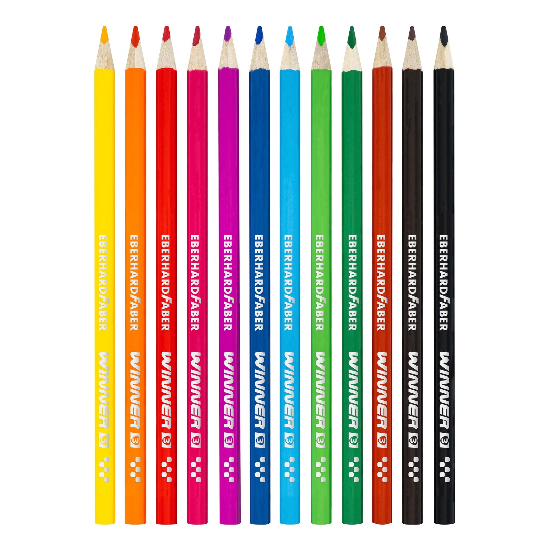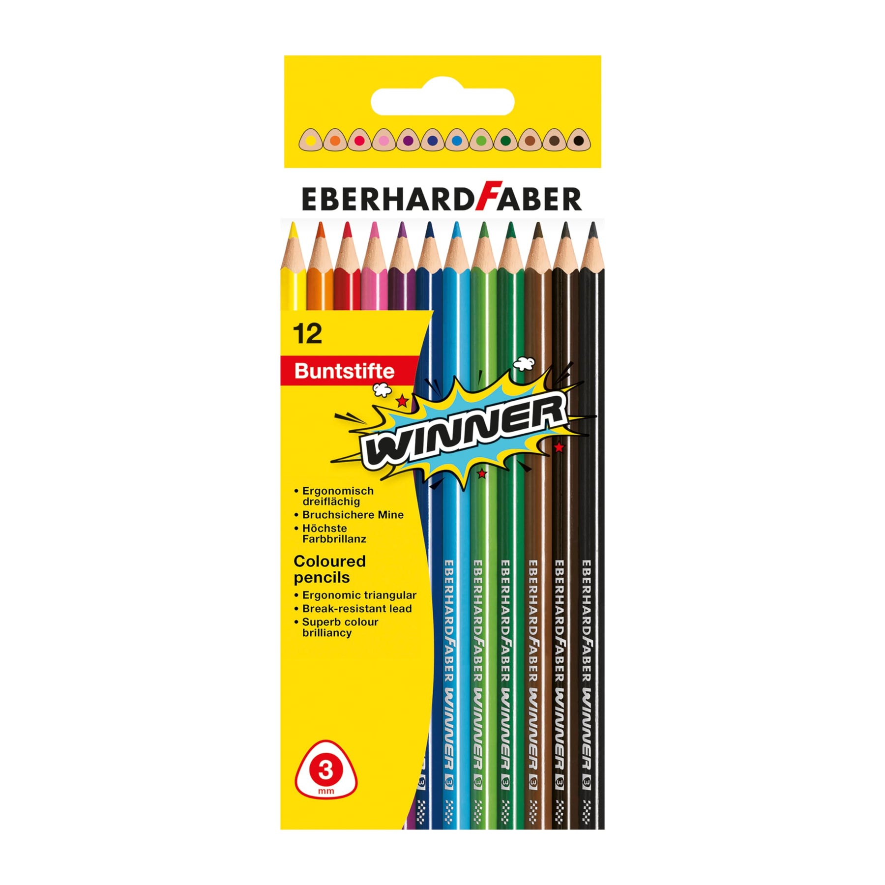 Ideal zum Lernen des Dreifingergriffs ist die dreiflächige Stiftform der Buntstifte Winner von Eberhard Faber. Sie ermöglichen ermüdungsfreies und ergonomisches Zeichnen und Malen. Durch die leuchtenden Farben macht das Malen richtig Spaß. Die Farbstifte sind 17,5 cm lang und in der Minenfarbe lackiert. Der Minendurchmesser beträgt 3 mm. Zum Anspitzen der Stifte kann jeder handelsübliche Spitzer verwendet werden. Dieses Kartonetui beinhaltet 12 Buntstifte. Verschiedene andere Etuisortierungen sind erhältlich.