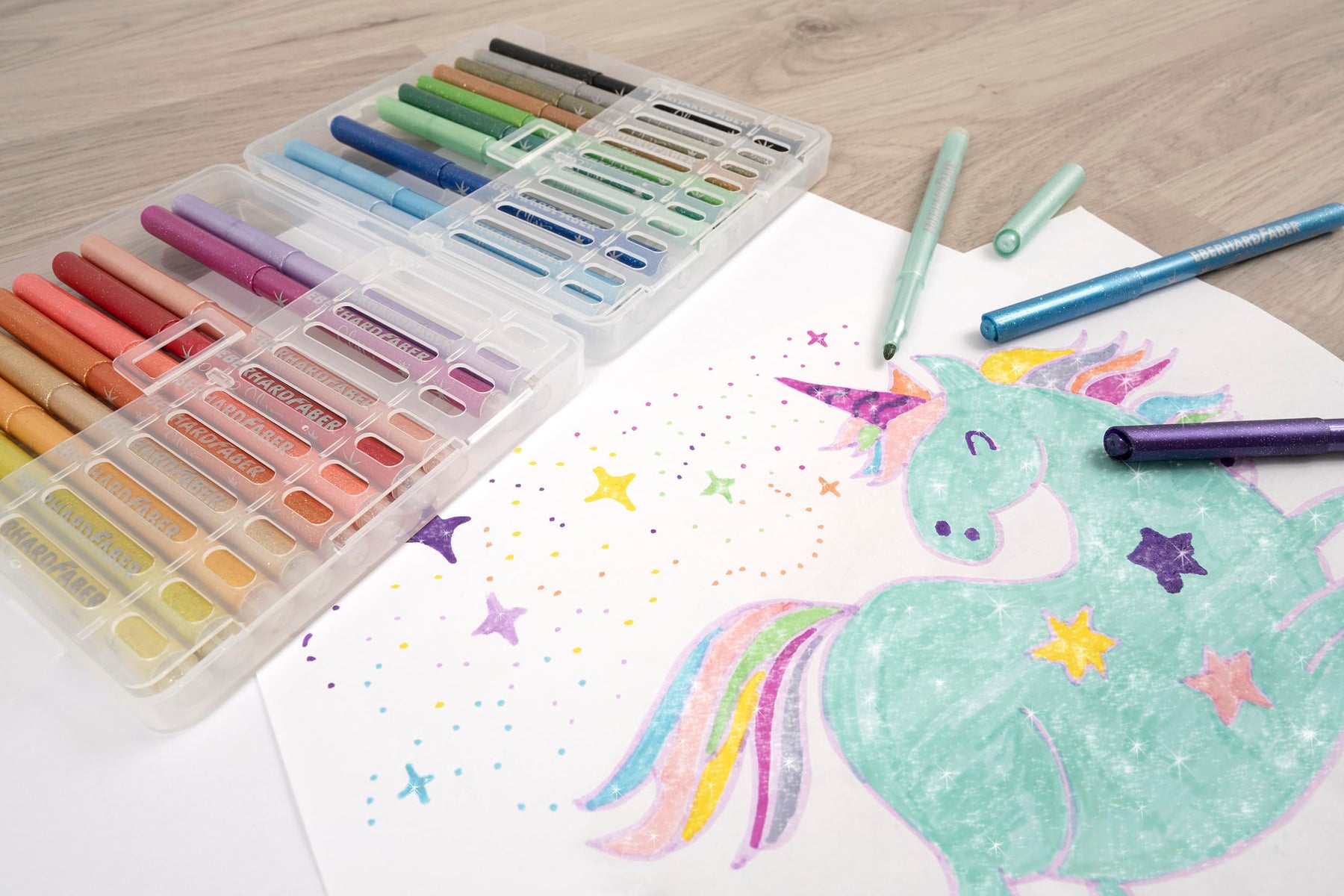 Einzelheiten: Mit diesen tollen Glitzer Fasermalern machen Sie aus Postern, Fotoalben, Geschenkanhängern, Grußkarten, Tagebüchern, phantasievollen Geschenken und anderen spannenden Kreativprojekten kleine Kunstwerke und verleihen jedem einen individuellen Touch. Das Set besteht aus 24 Glitter Filzstiften in intensiv leuchtenden Farben, die in einer praktischen aufklappbaren Geschenkbox verpackt sind. Die Farben sind aus den meisten Textilien bei 40 Grad auswaschbar. Die stabilen Spitzen der Stifte haben eine Strichstärke von ca. 3 mm und eignen sich somit sehr gut für Verzierungen, für feine Zeichnungen, Linien und zum Gestalten von Papier. Sie sorgen beim Malen, Basteln, Kolorieren und Schreiben für glitzernde Highlights und sind bei kleinen und großen Künstlern sehr beliebt. Die Mine ist mit einer durchsichtigen Hülse umgeben, so dass man die benötigte Farbe schnell aussuchen kann und zur Hand hat.