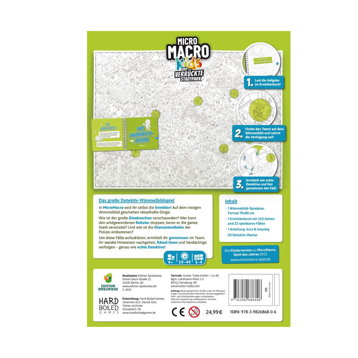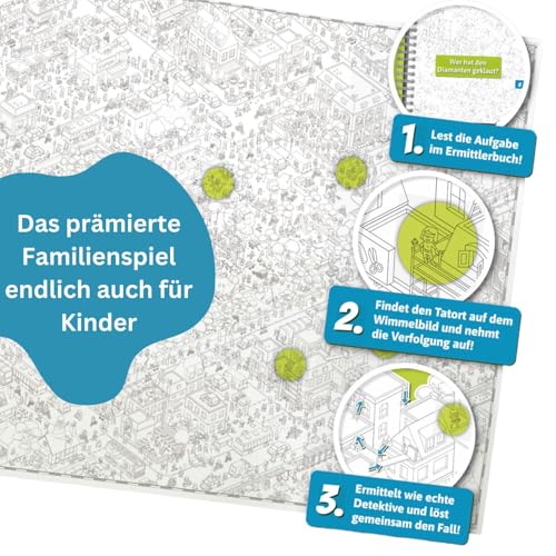 - 🔍 In MicroMacro Kids seid ihr selbst die Ermittler! Auf dem riesigen Wimmelbild geschehen rätselhafte Dinge: Wie ist der große Dinoknochen verschwunden? Wer kann den wildgewordenen Roboter stoppen, bevor er die ganze Stadt verwüstet? Und wie ist die Diamantendiebin der Polizei entkommen?
