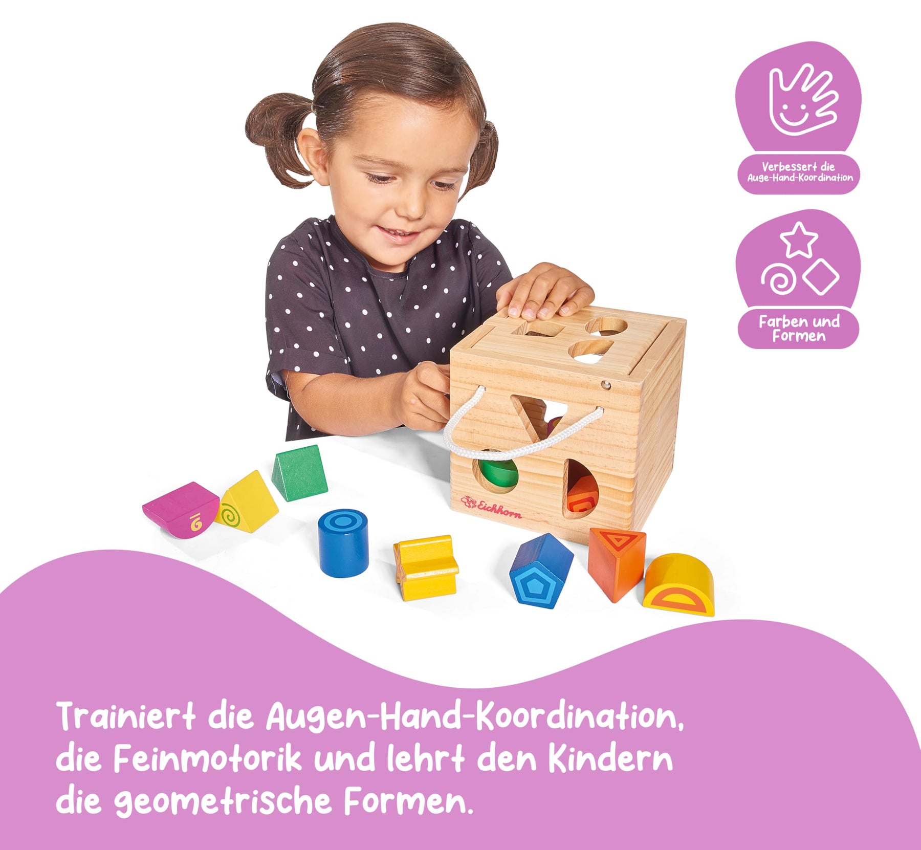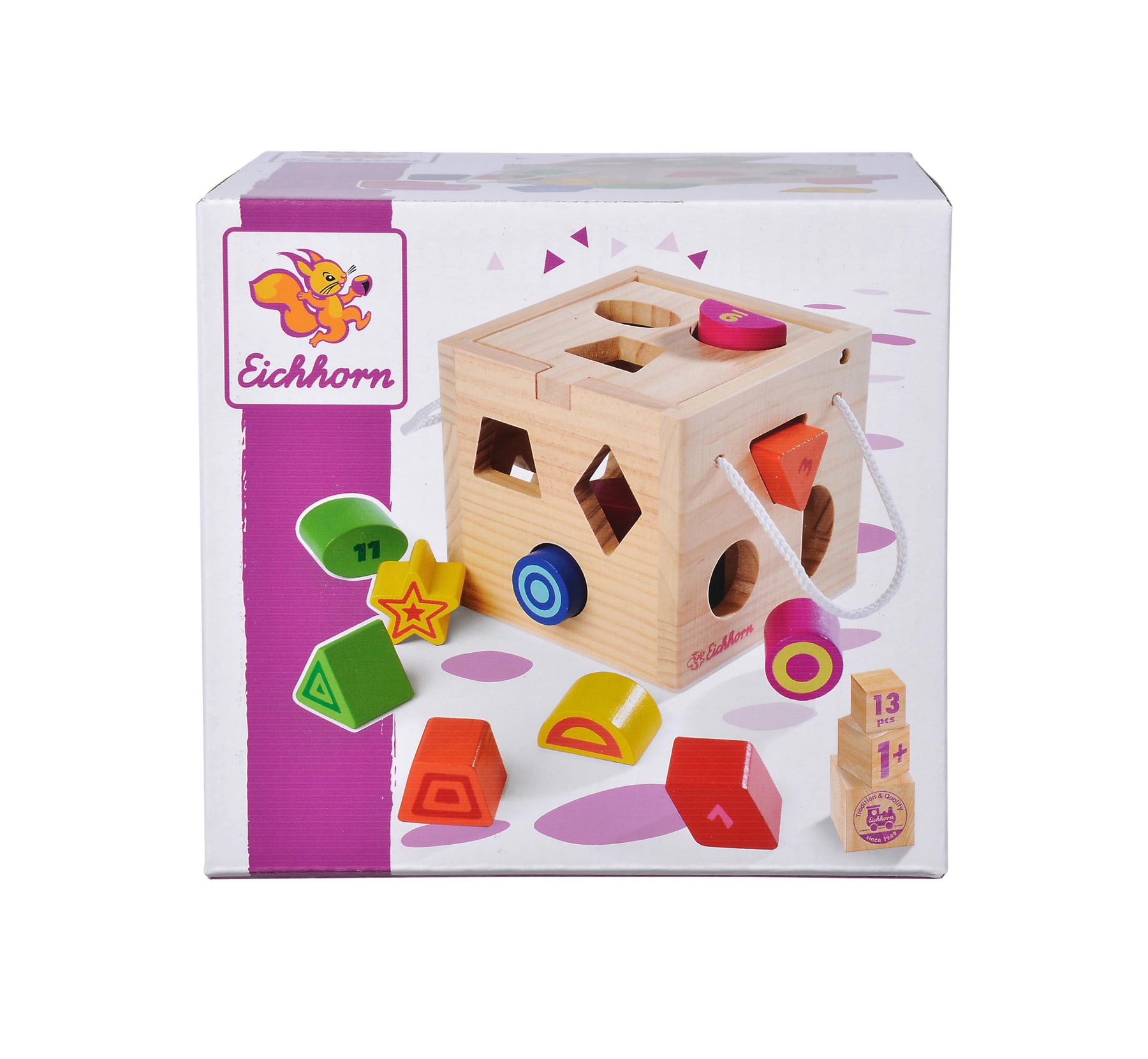 Der hochwertige Eichhorn Steckwürfel besteht aus 13 Teilen und fördert die Motorik und das Gefühl für Formen. Jede der 12 verschiedenen Bausteinformen passt nur in eine Öffnung, sodass die räumliche Wahrnehmung positiv beeinflusst und trainiert wird. Die Holzbausteine sind mit den Zahlen von 1-12 bedruckt, sodass die Kinder gleichzeitig die Zahlen lernen können. Der Steckwürfel hat eine Größe von 14,5x14,5x14,5cm und ist für Kinder ab einem Jahr geeignet.