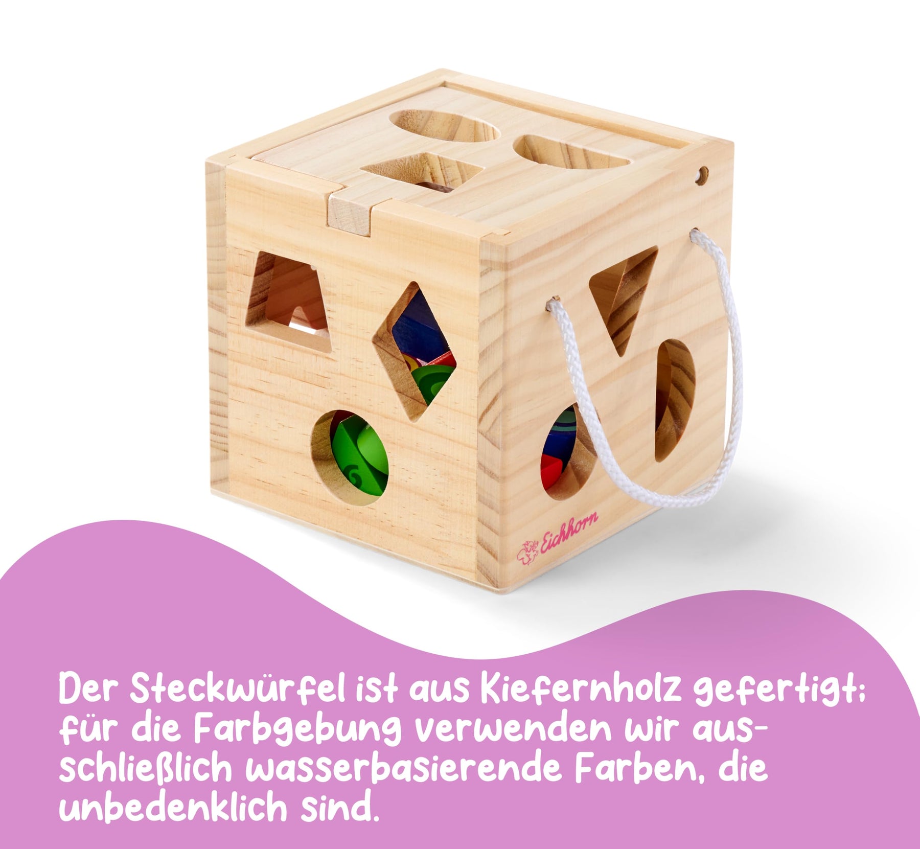 Der Steckwürfel wird aus Kiefernholz gefertigt. Alle Einzelteile sind so groß, dass Kinder ab einem Jahr sie gut greifen können. Sämtliche Holspielwaren von Eichhorn werden regelmäßig von unabhängigen Prüfinstituten getestet.